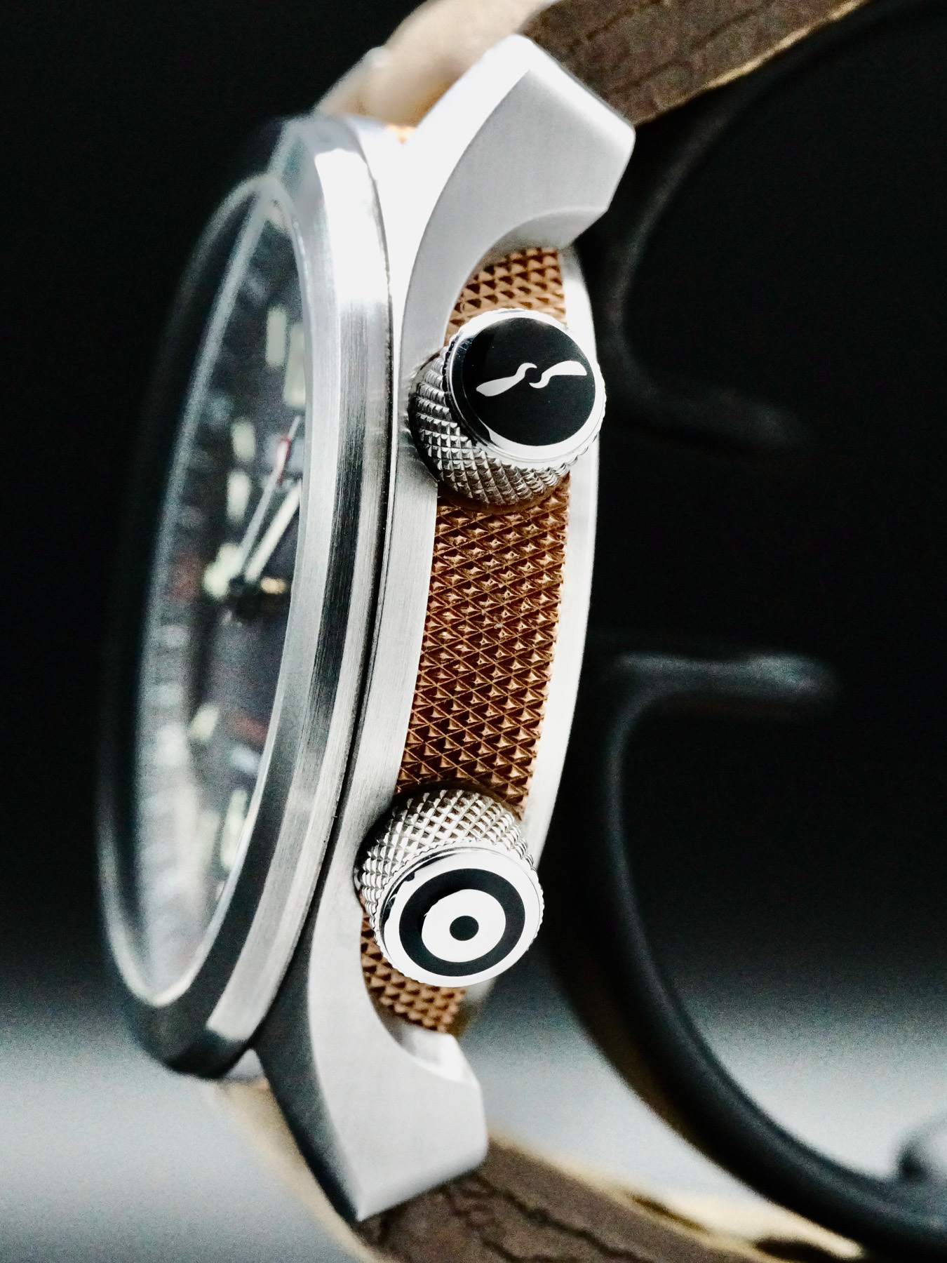 This Bremont U-22 features a 43mm stainless steel case with a display case back on a brown leather strap. This watch also sports a black dial with luminous hands and index dial markers covered by sapphire crystal.