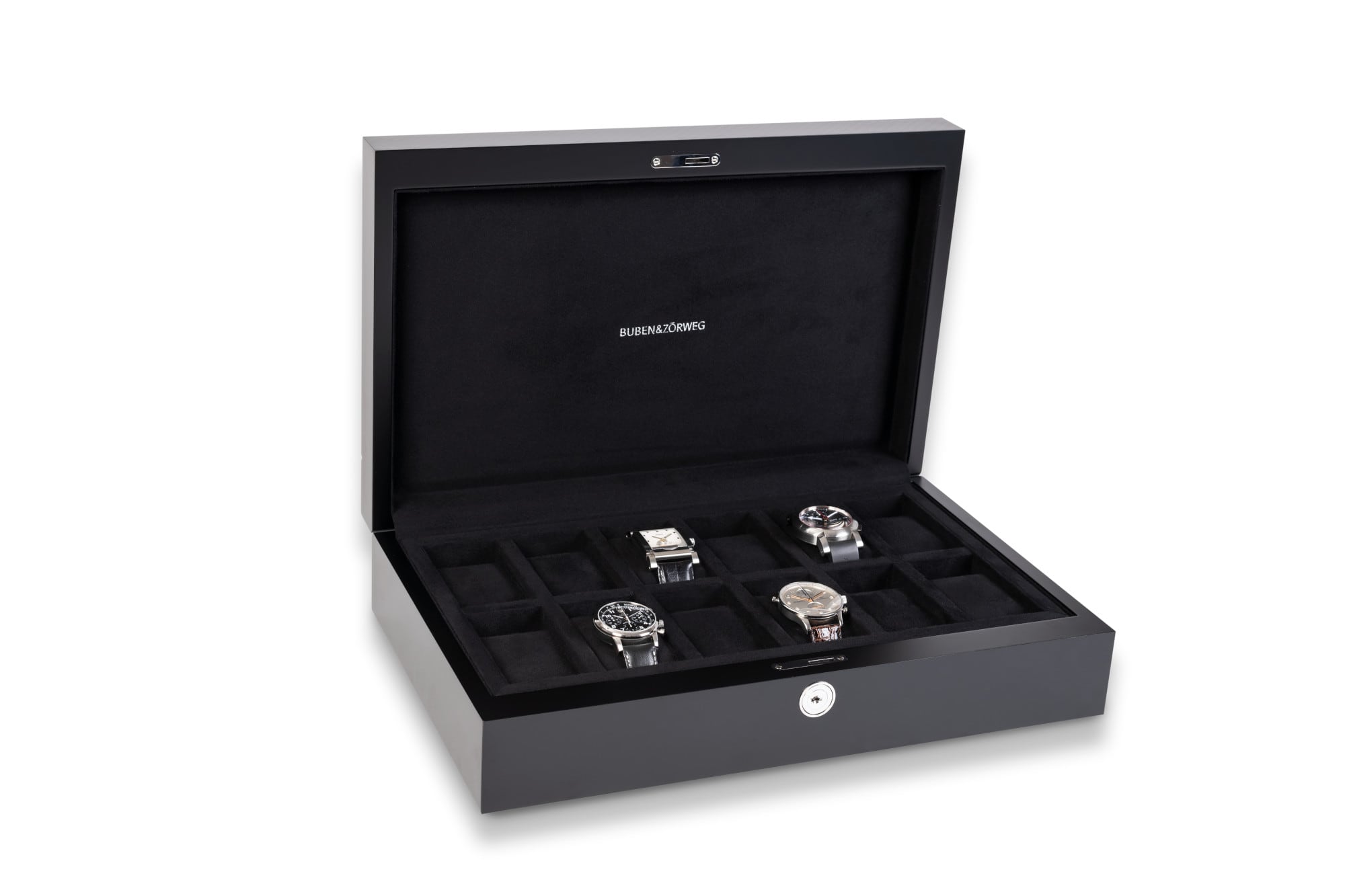 With the lockable NEO case collection you can keep your timepieces safe and secure, at home or while travelling. The modern, hand-crafted housing in black semi-gloss lacquer is available in various materials, such as carbon fibre, and can beautifully display up to 12 watches. Suspended watch cushions guarantee a perfect fit for your beloved collection.