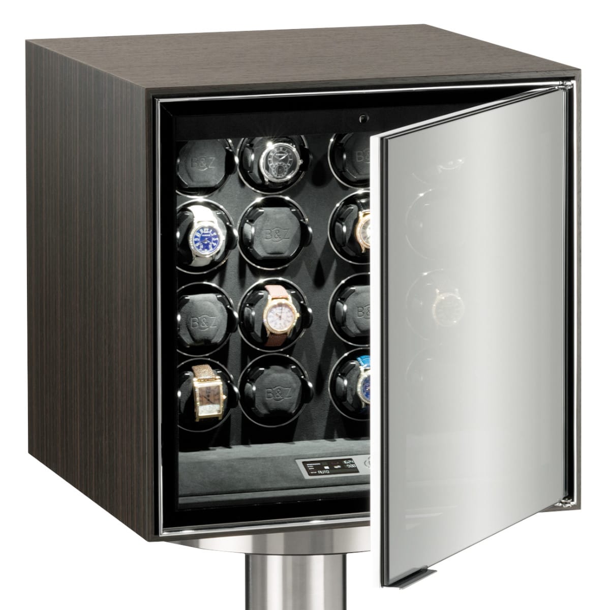 QUANTUM, a luxury timepiece rotator, combines protection for priceless watch collections with superior presentation for connoisseurs. The collection experiments with a play of contrasts - a mirror effect is achieved when the light is activated and the discreet door is revealed.