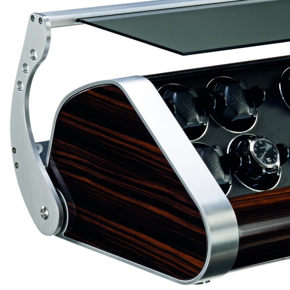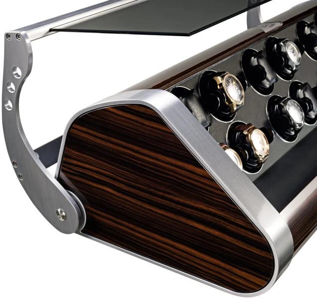 The REVOLUTION is driven by an innovative engineering and design philosophy. This luxury watch winder presents a radically different backdrop, moving away from the classic cubic or rectangular housing to a never-before-seen design that enhances the display and functionality of your timepieces.