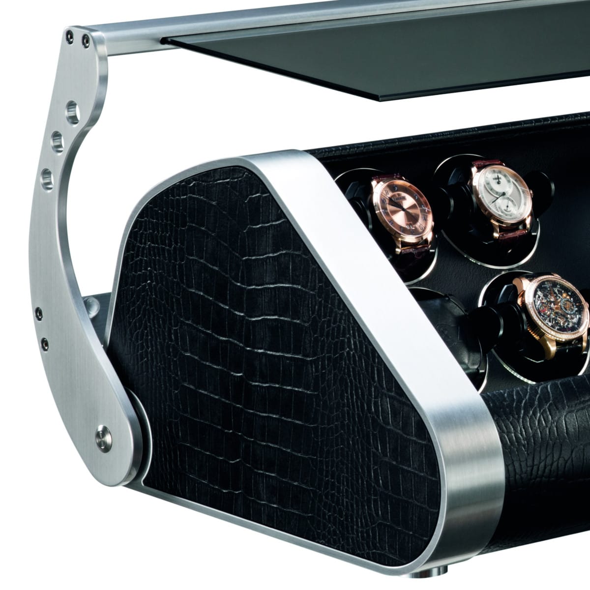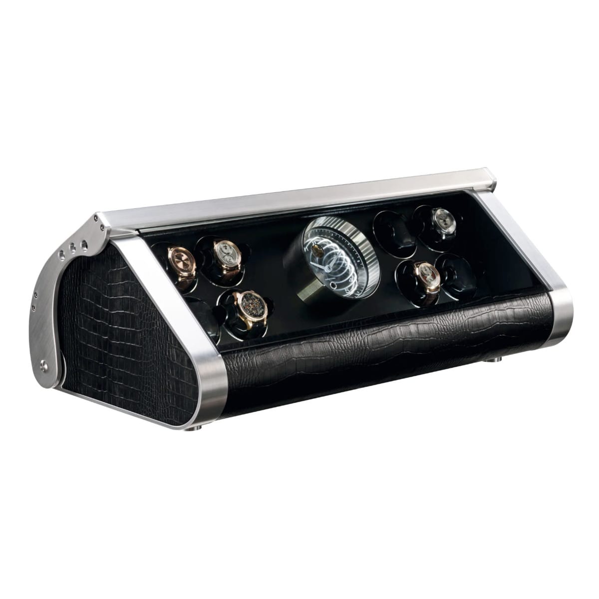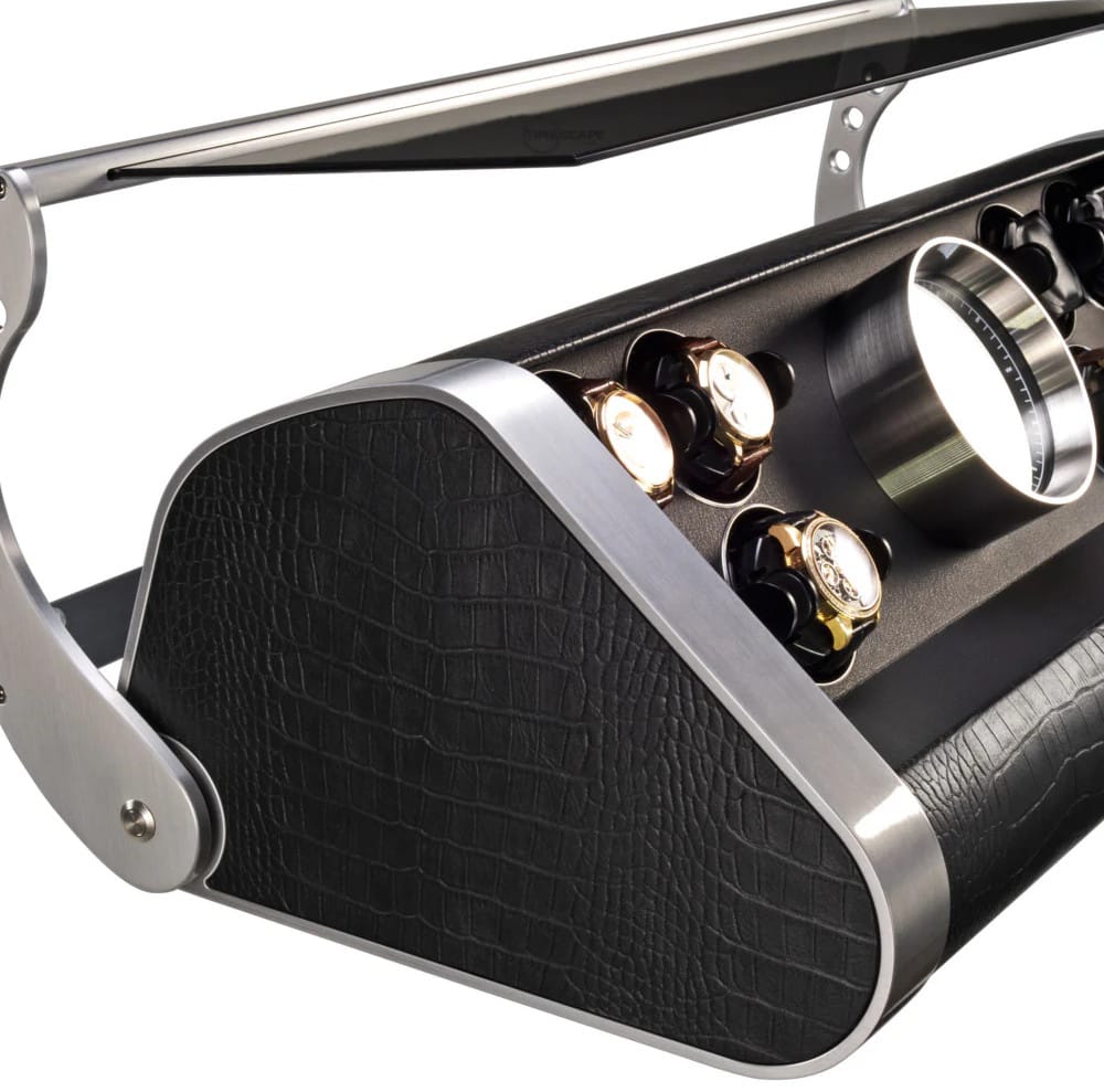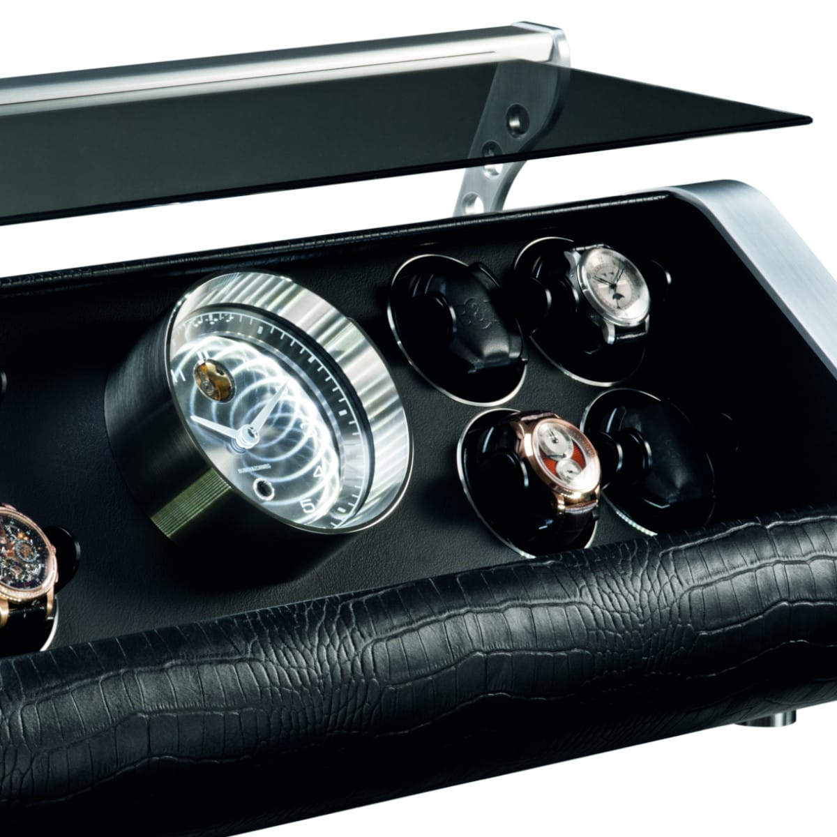 The REVOLUTION is driven by an innovative engineering and design philosophy. This luxury watch winder presents a radically different backdrop, moving away from the classic cubic or rectangular housing to a never-before-seen design that enhances the display and functionality of your timepieces.