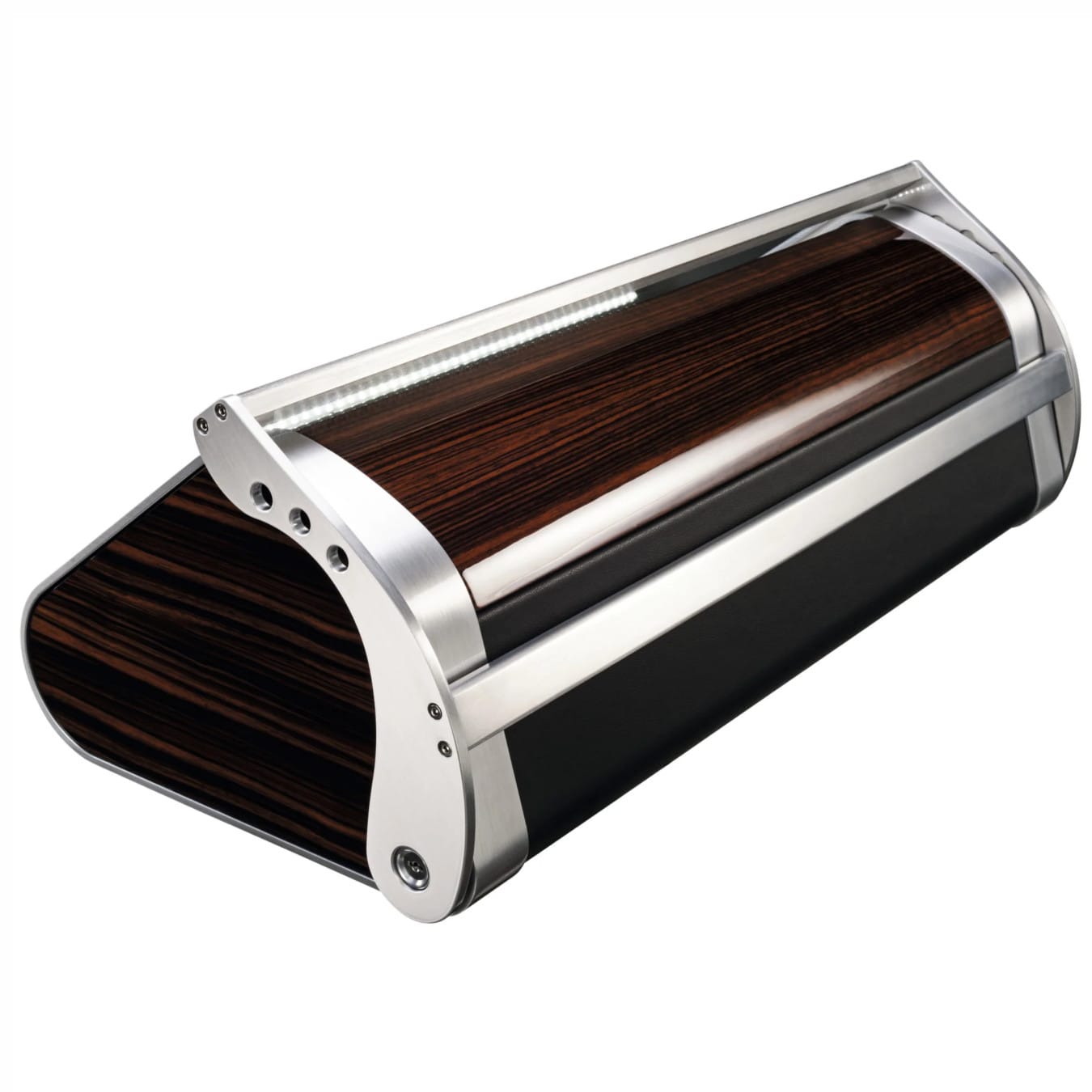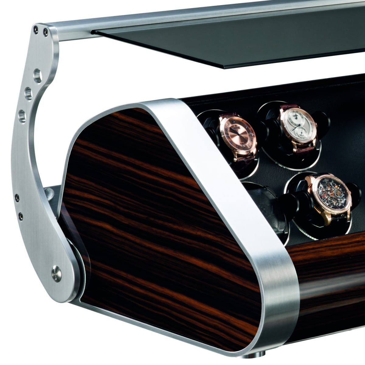 Dynamic stainless steel accent lines on each side, and its bevelled front, set a spectacular stage for the owner’s watch collection.