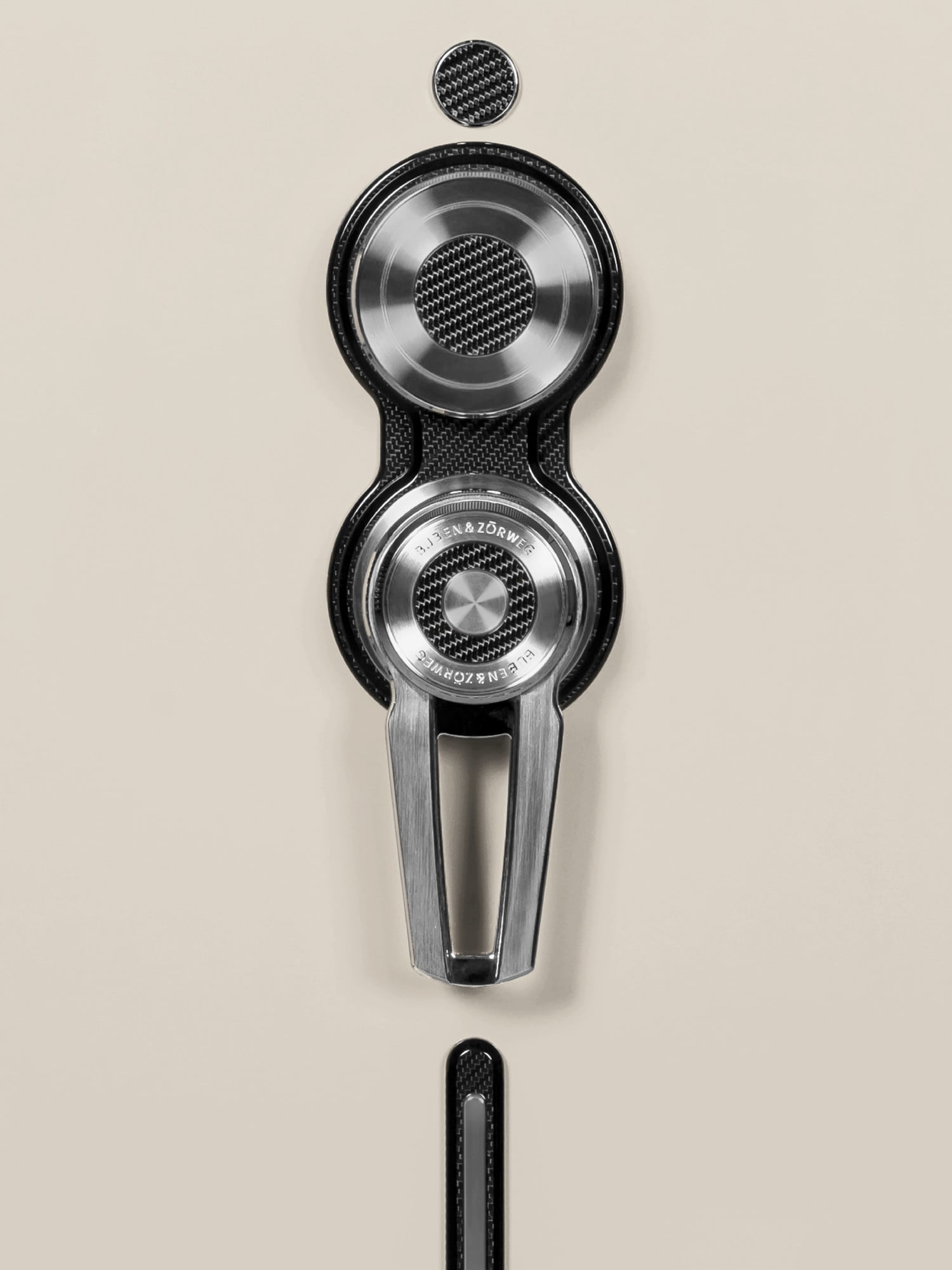 A bold and circular form, inspired by racing, is the perfect connector between the safe’s door and the handle.