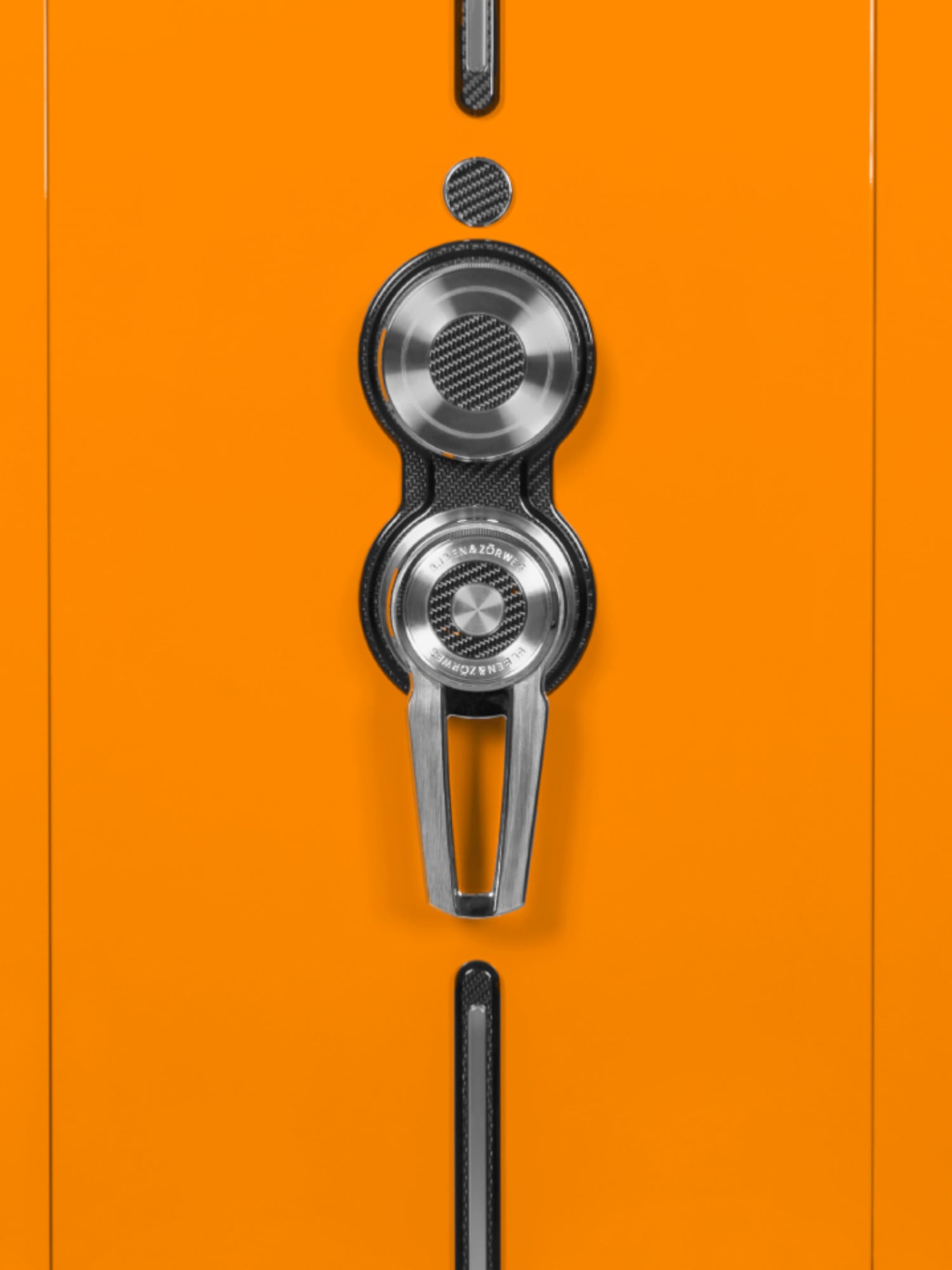A bold and circular form, inspired by racing, is the perfect connector between the safe’s door and the handle.
