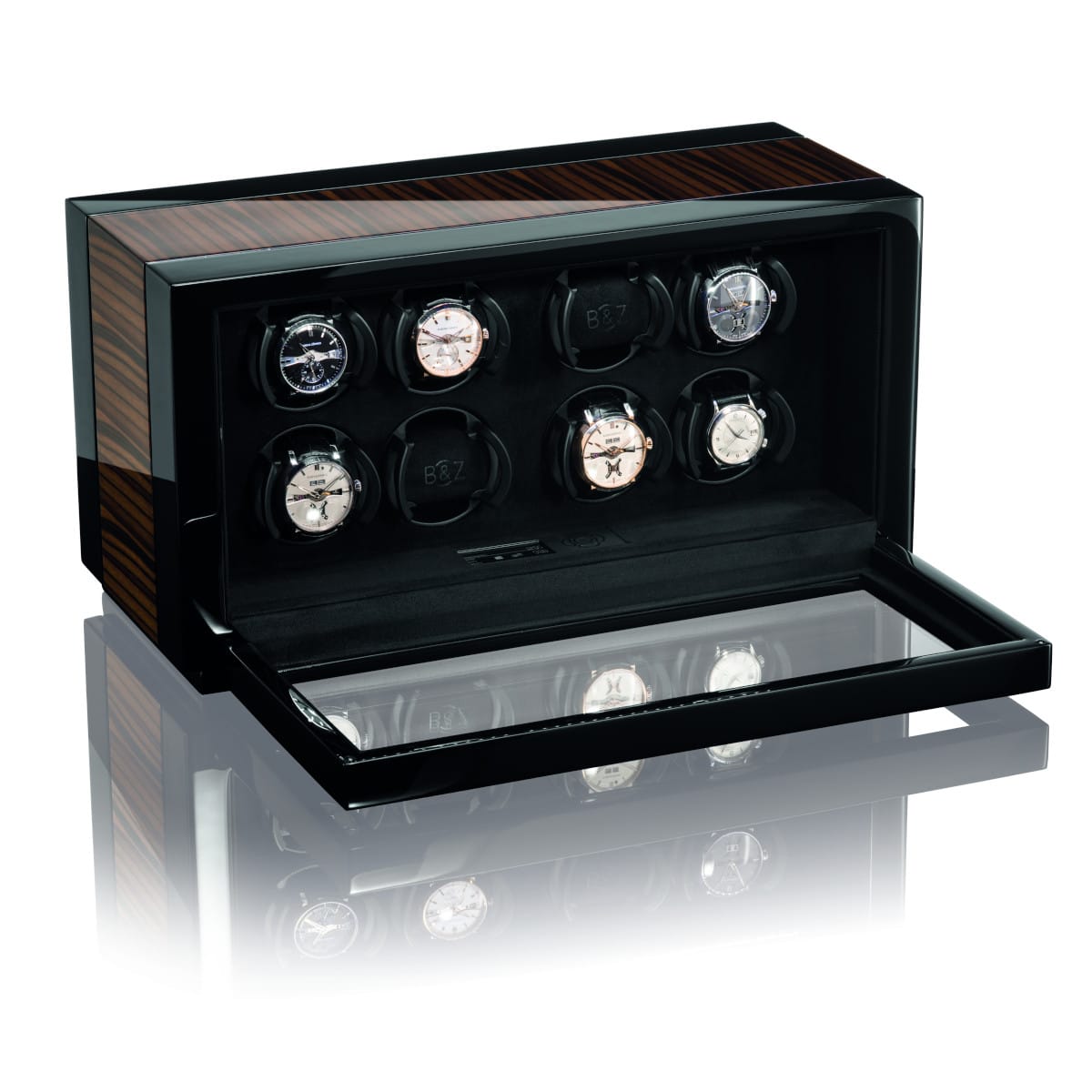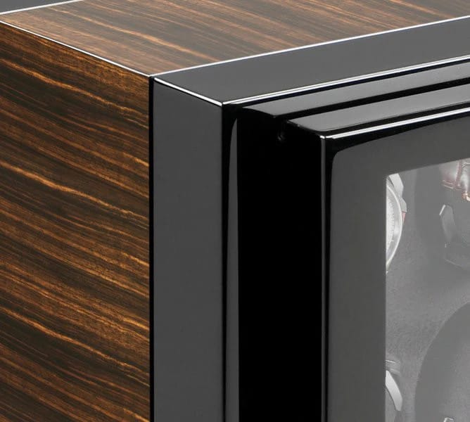 The VANTAGE offers timeless elegance to the distinguished collector, merging a classic design with premium watch winder functionality. This masterpiece features exquisite high-gloss black lacquer and exclusive inlays such as Makassar or Carbon, providing a sophisticated setting for your treasured timepieces.
