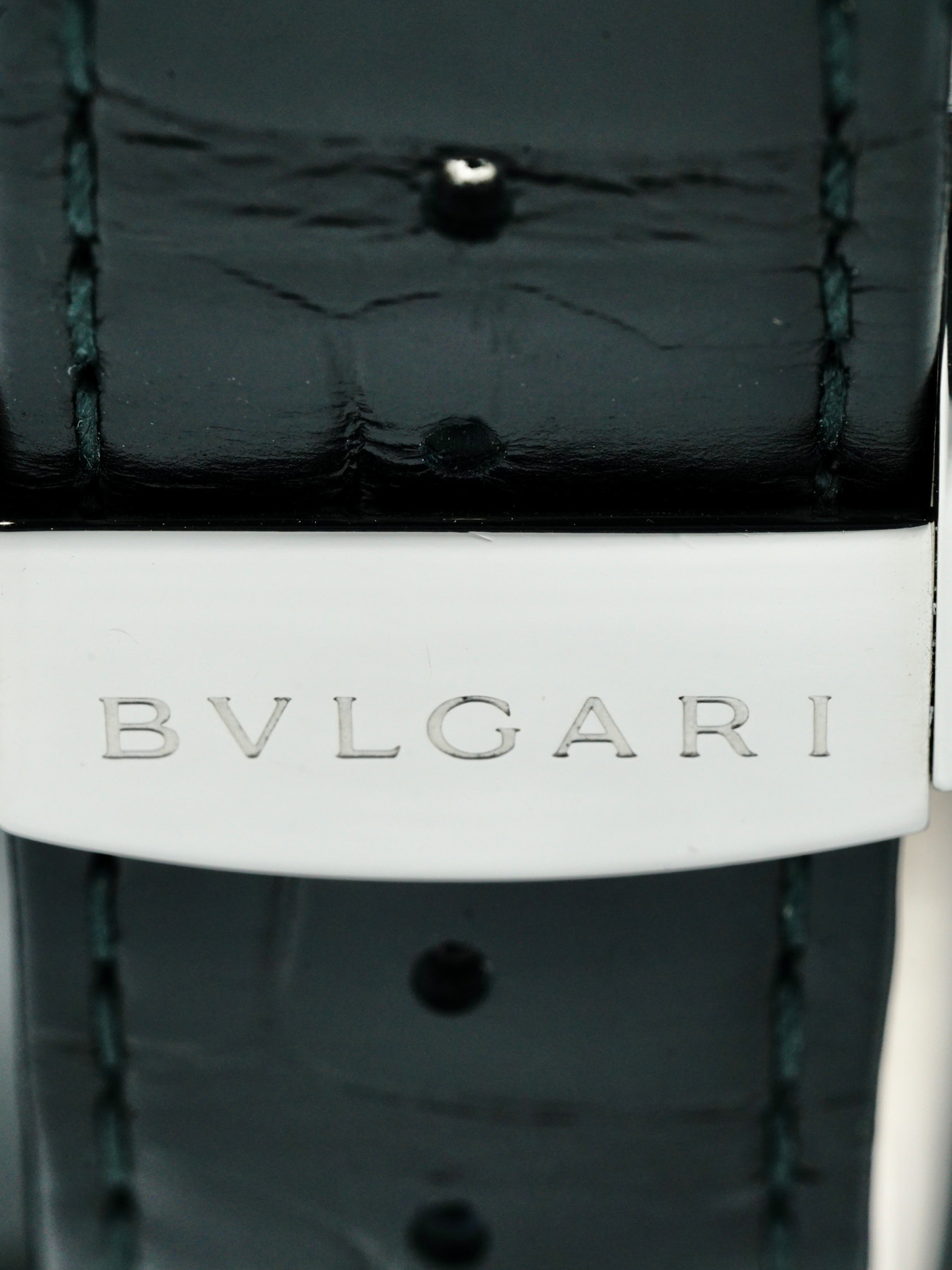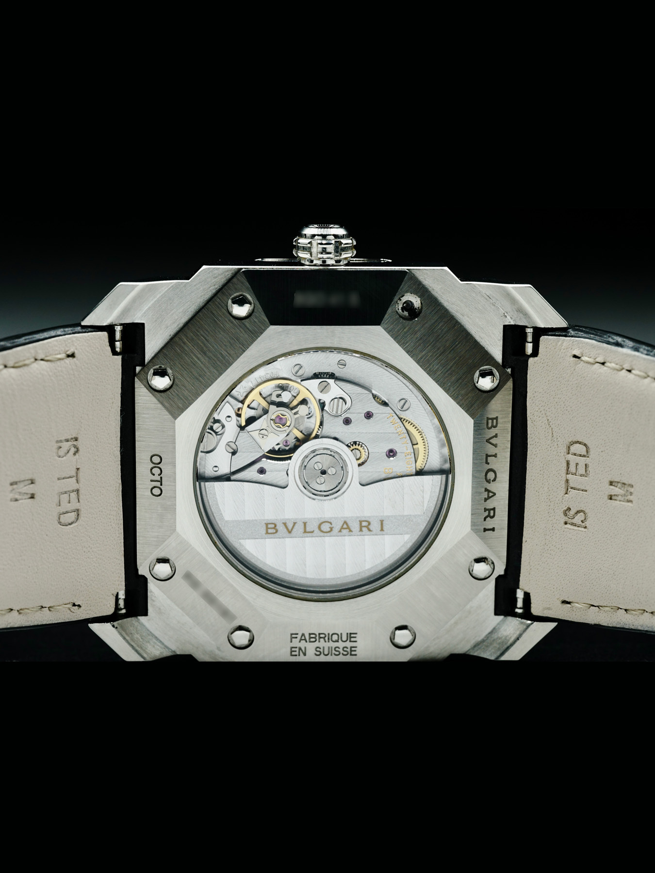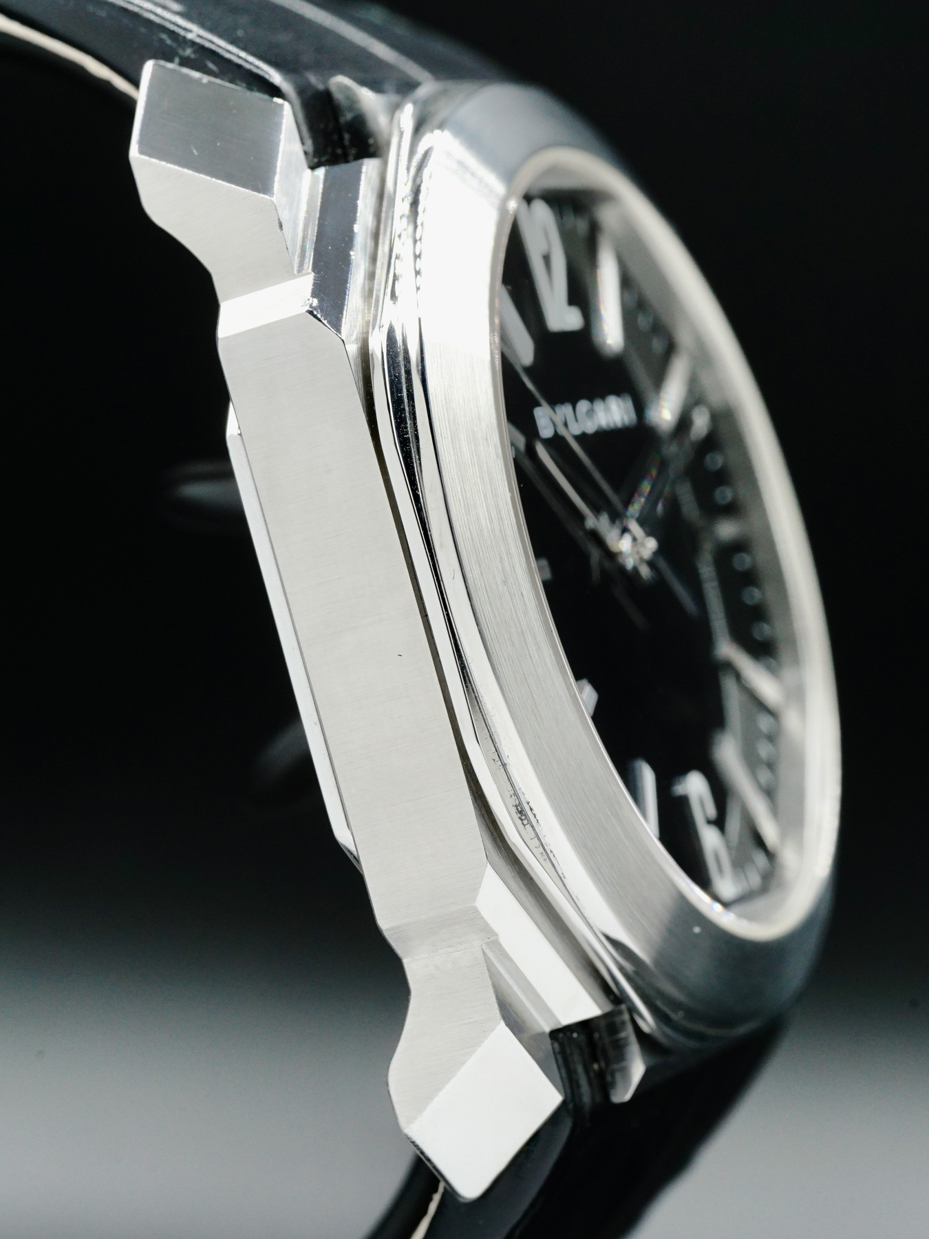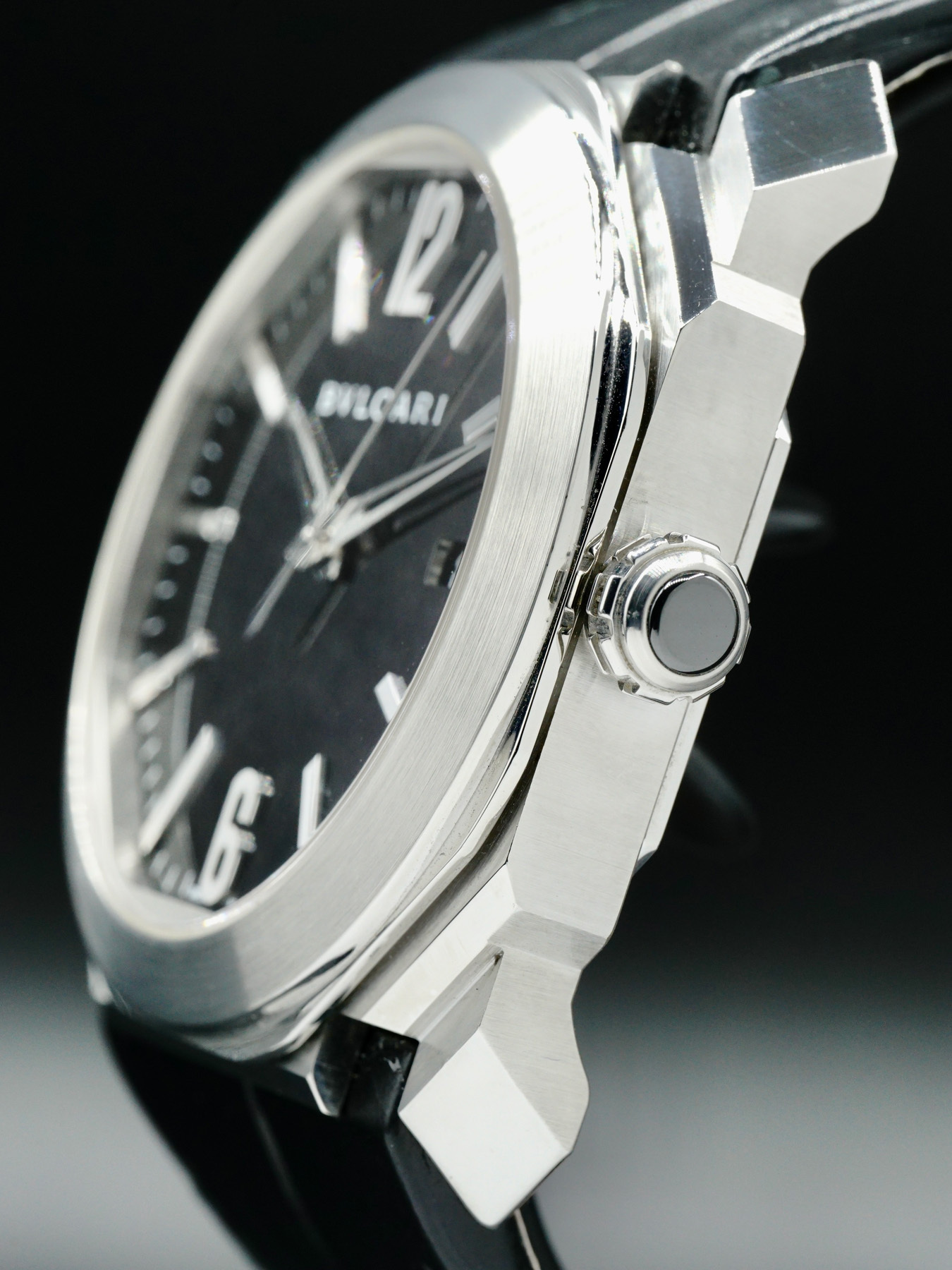 This Bulgari Octo Solotempo features a 41mm stainless steel case & bezel with a display case back on a black leather strap. This watch also sports a black dial with silver hands and index dial markers covered by scratch resistant sapphire crystal.