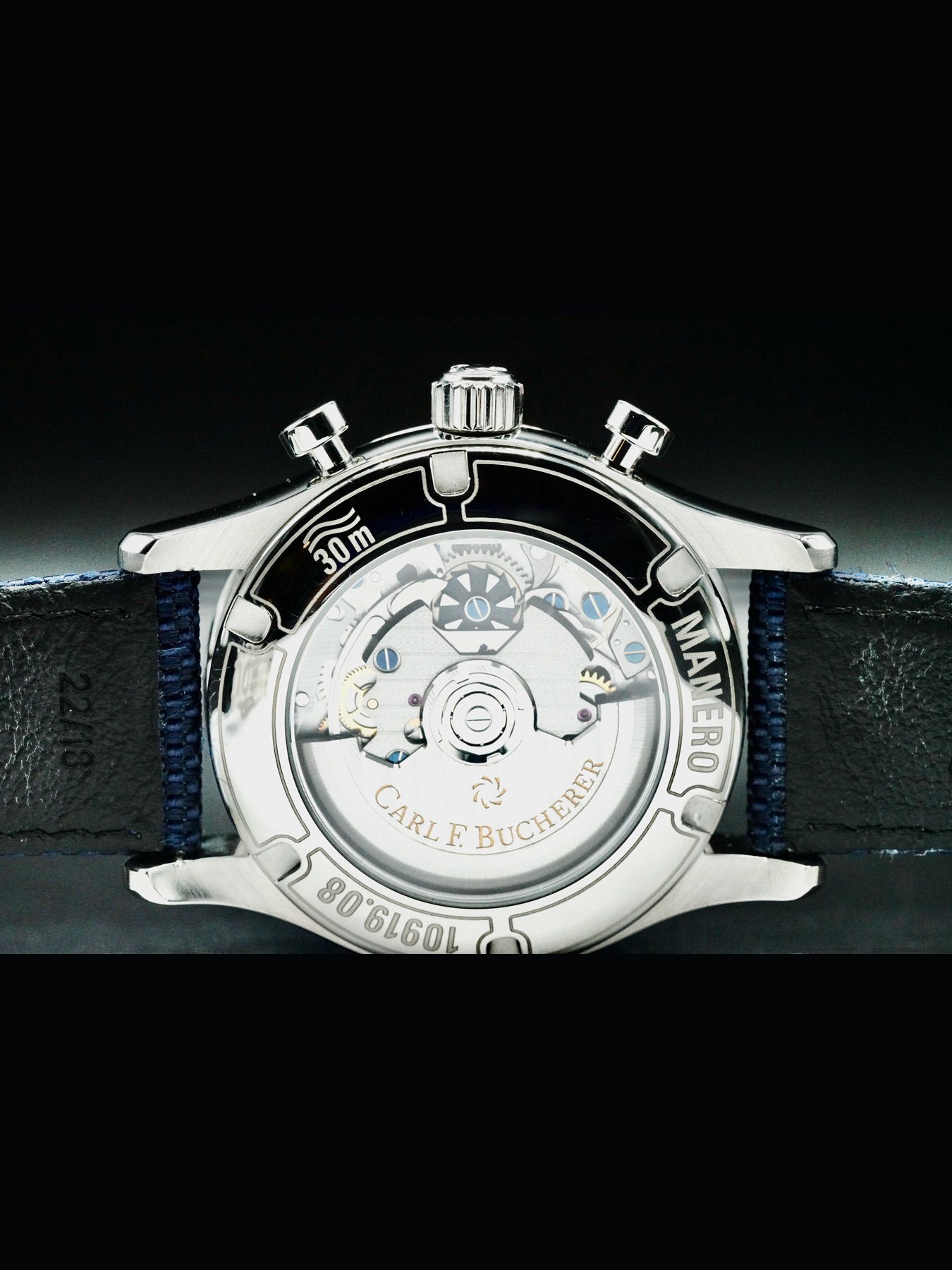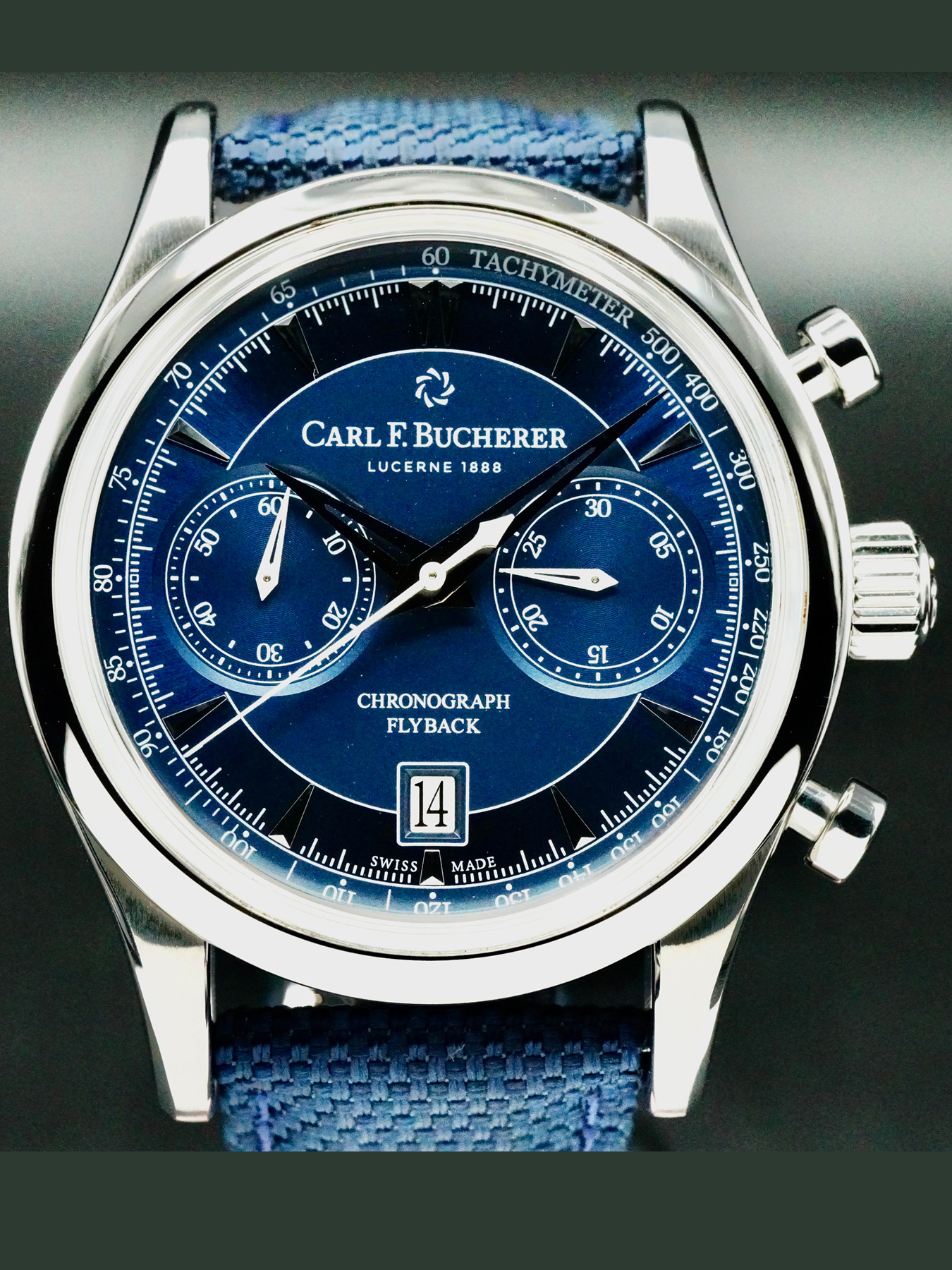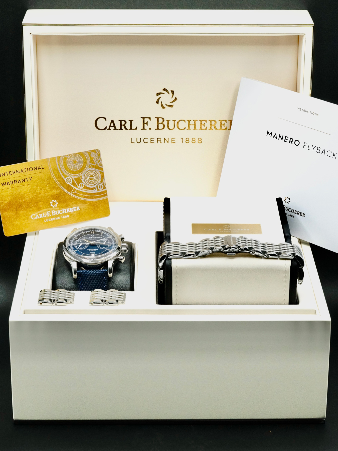 This Carl F. Bucherer 10919.08.53.21 Manero Flyback is in EXCELLENT condition. This watch includes its original box, instruction manual, and warranty card dated for 2021. Extra stainless steel bracelet and links. This watch has been fully authenticated and certified by Exquisite Timepieces.