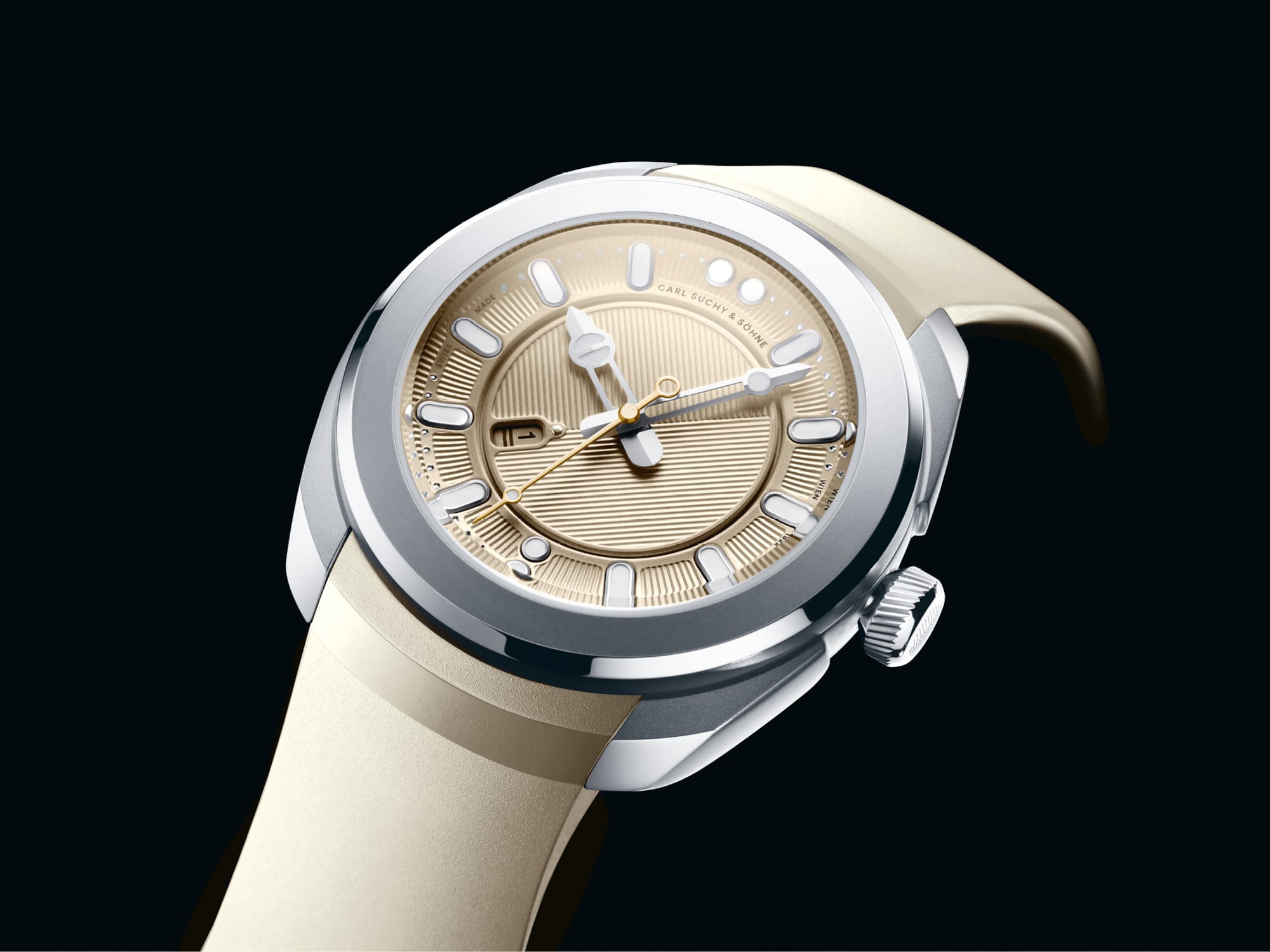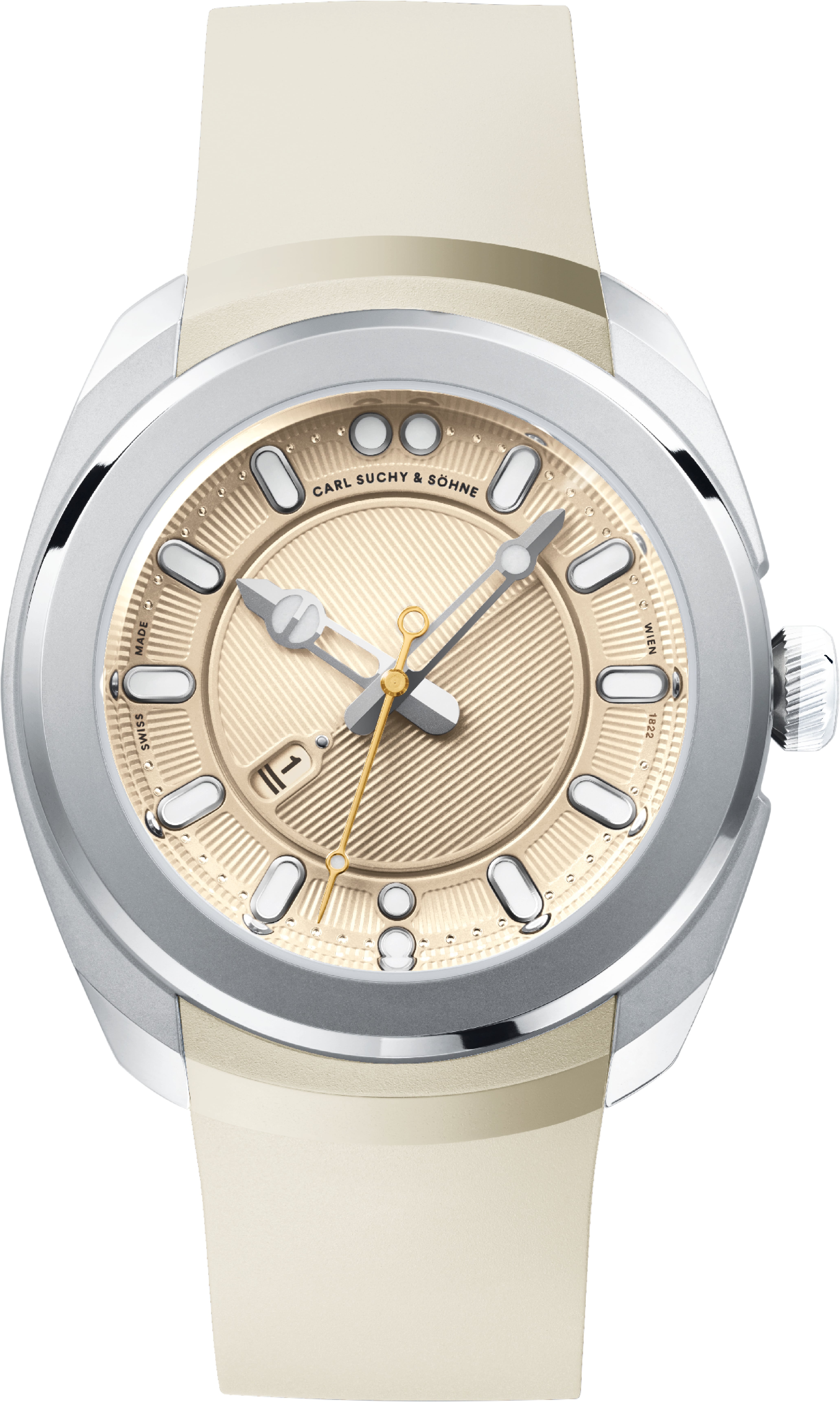 Embodying elegance and sportiness, the Belvedere Champagne dazzles with its rich golden hues. This distinctive colour not only enhances the watch’s allure but also adds a layer of exclusivity. The dial features a luminous golden second hand and Super-LumiNova-filled indices, highlighting the meticulous craftsmanship and attention to detail that defines Carl Suchy & Söhne.