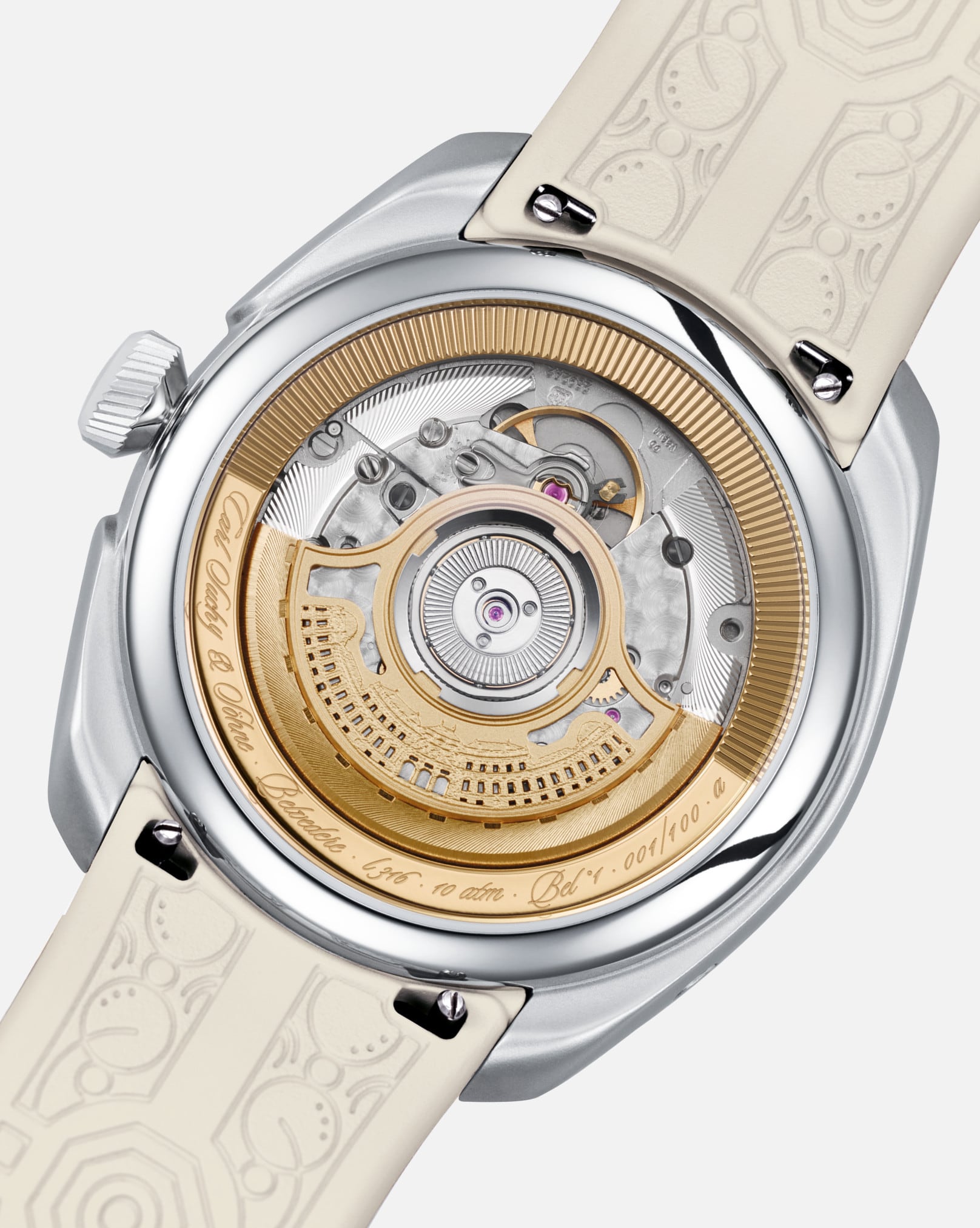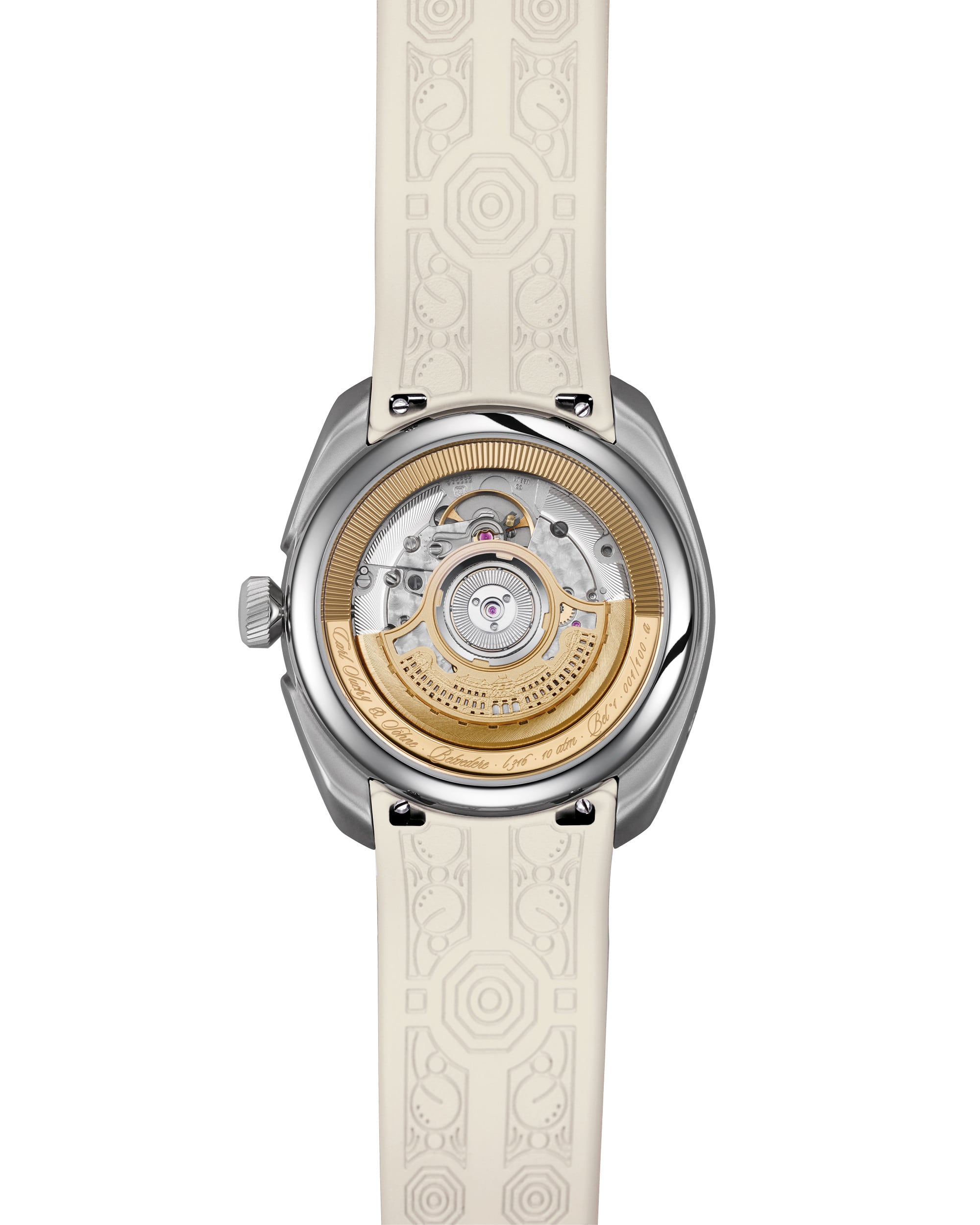 The case back, made of scratch-resistant sapphire crystal, reveals the decorated automatic movement with a rotor featuring the micro-engraved facade of Belvedere Palace. The watch runs on the CSS201 caliber, which is built upon a Dubois Dépraz and delivers 42 hours of power reserve.