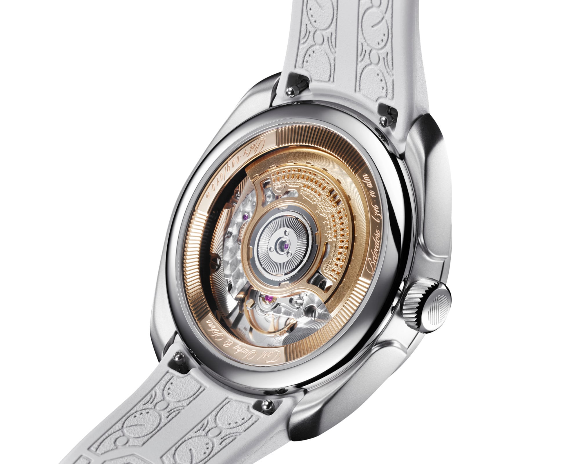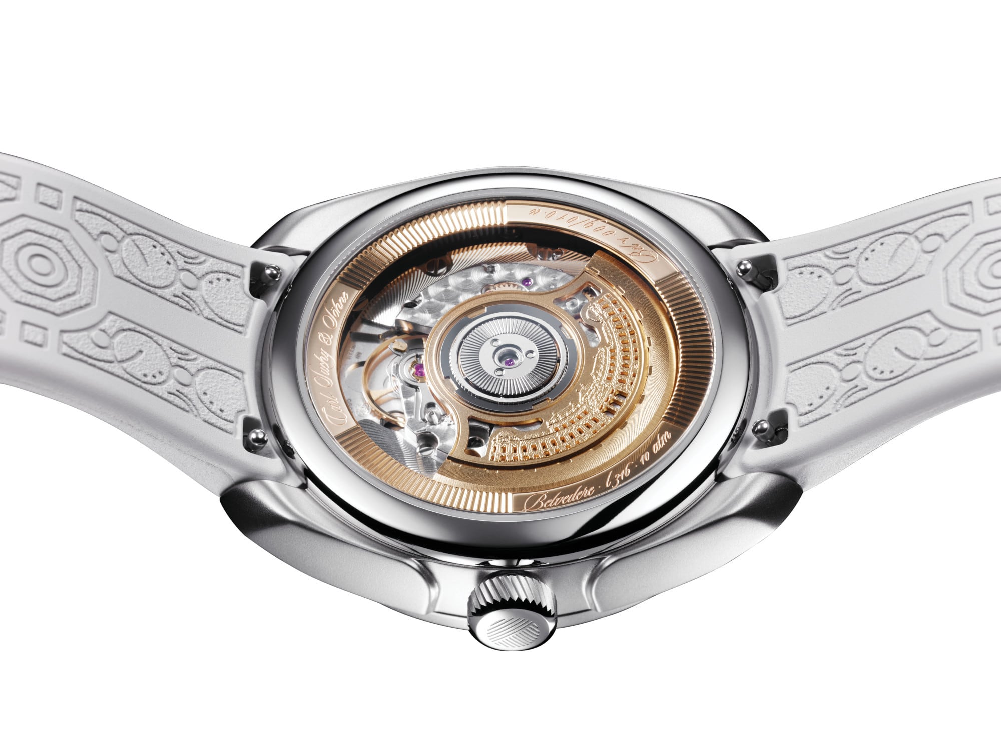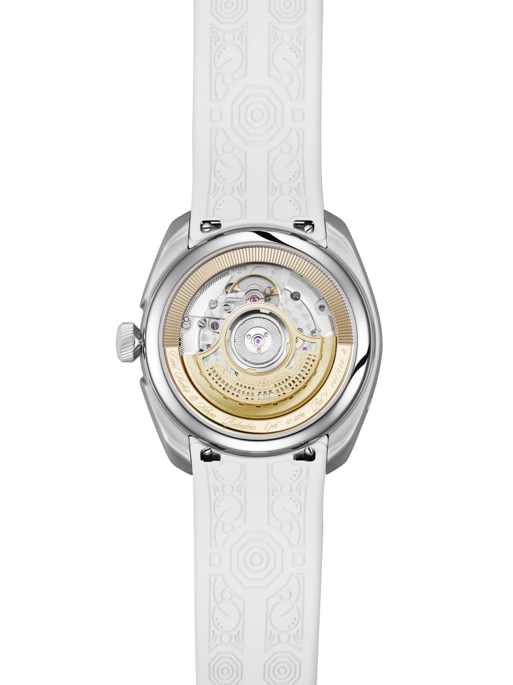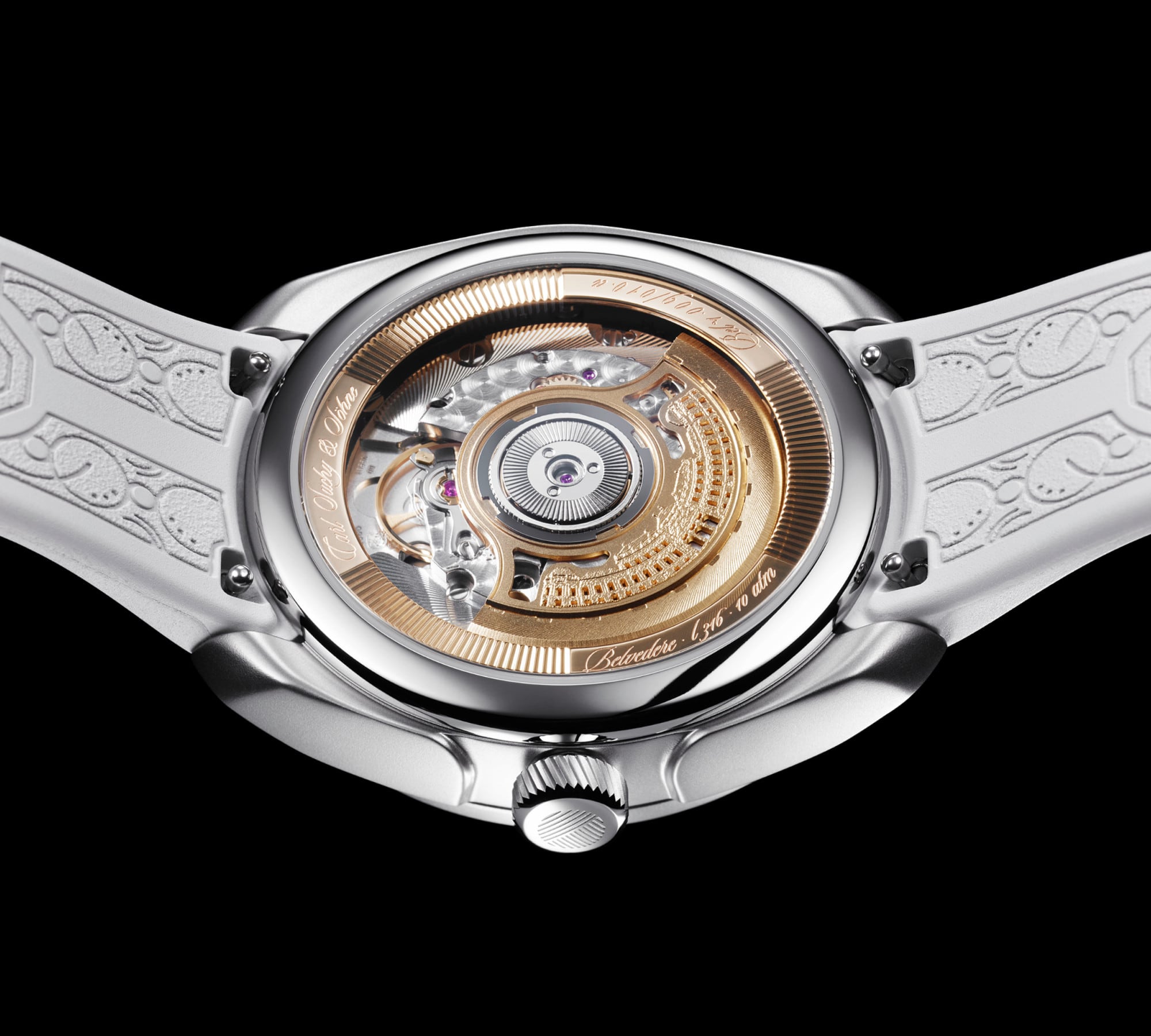 The case back, made of scratch-resistant sapphire crystal, reveals the decorated automatic movement with a rotor featuring the micro-engraved facade of Belvedere Palace. The watch runs on the CSS201 caliber, which is built upon a Dubois Dépraz and delivers 42 hours of power reserve.