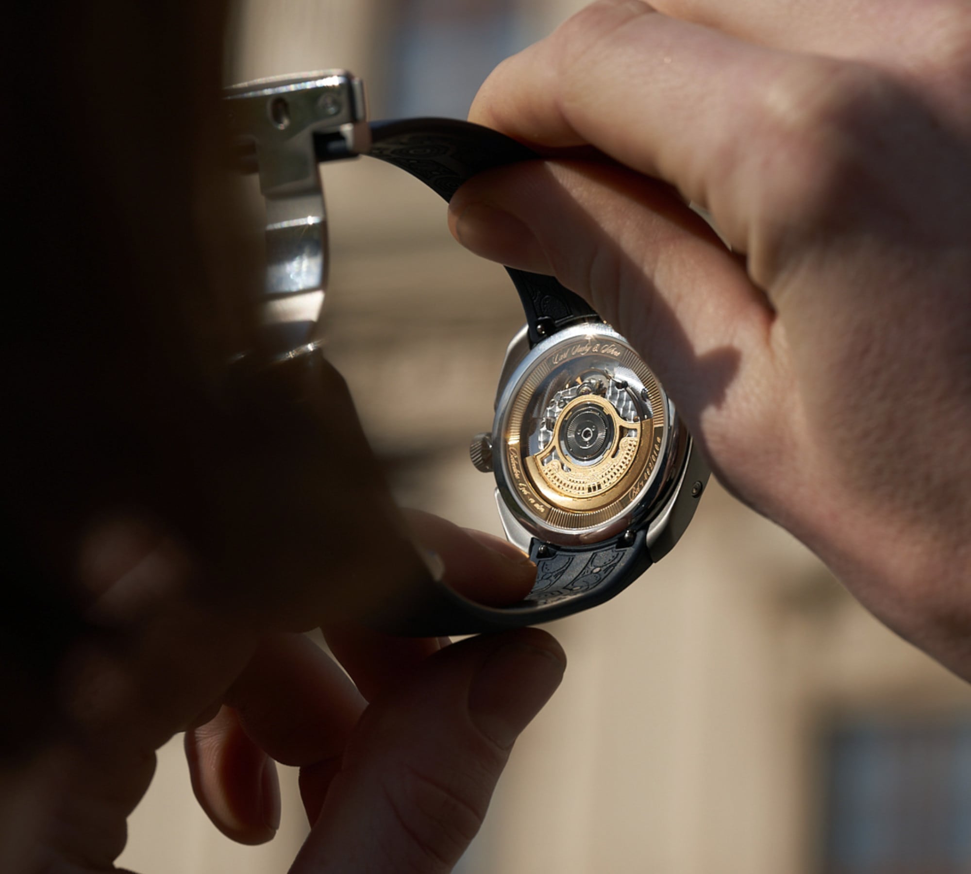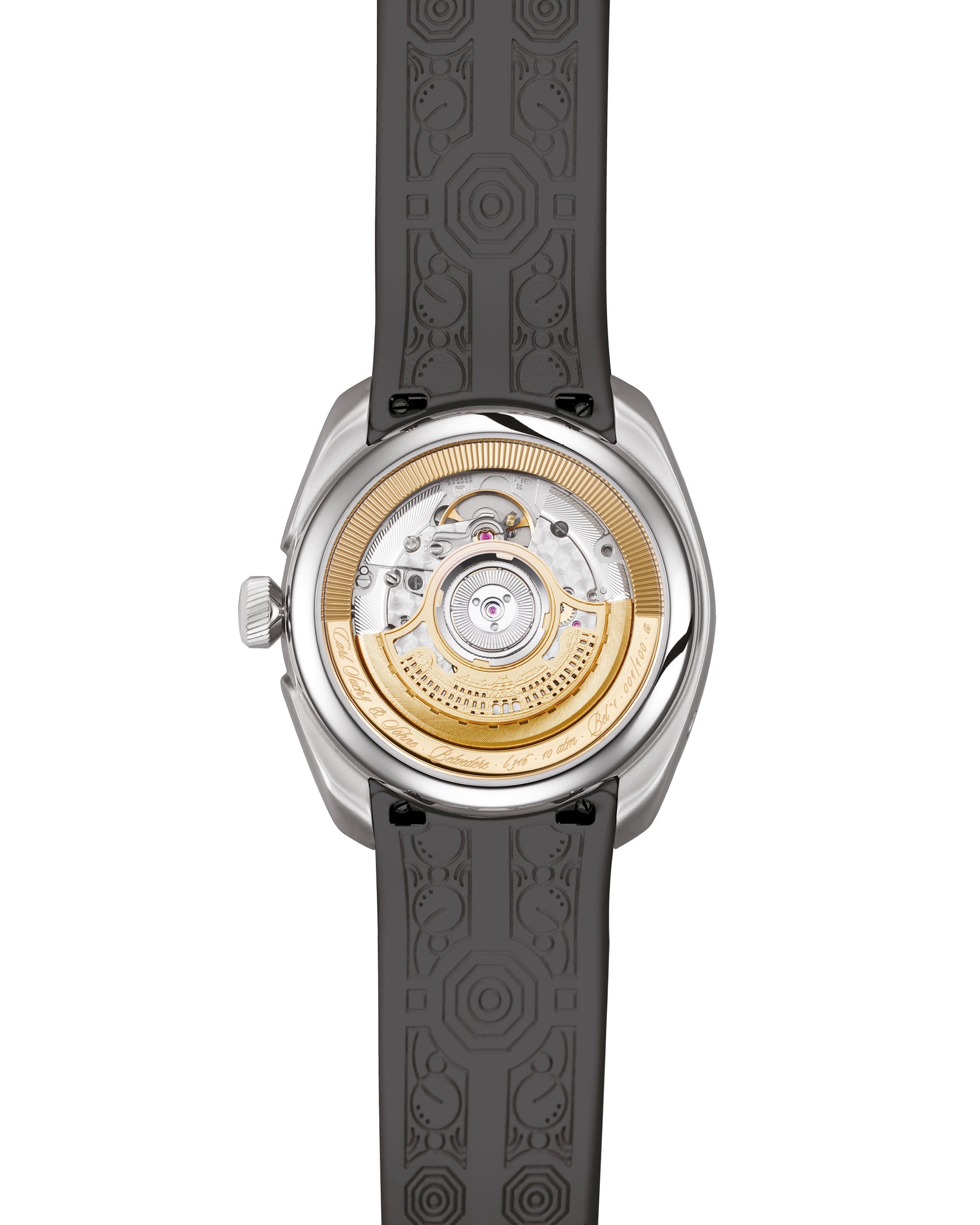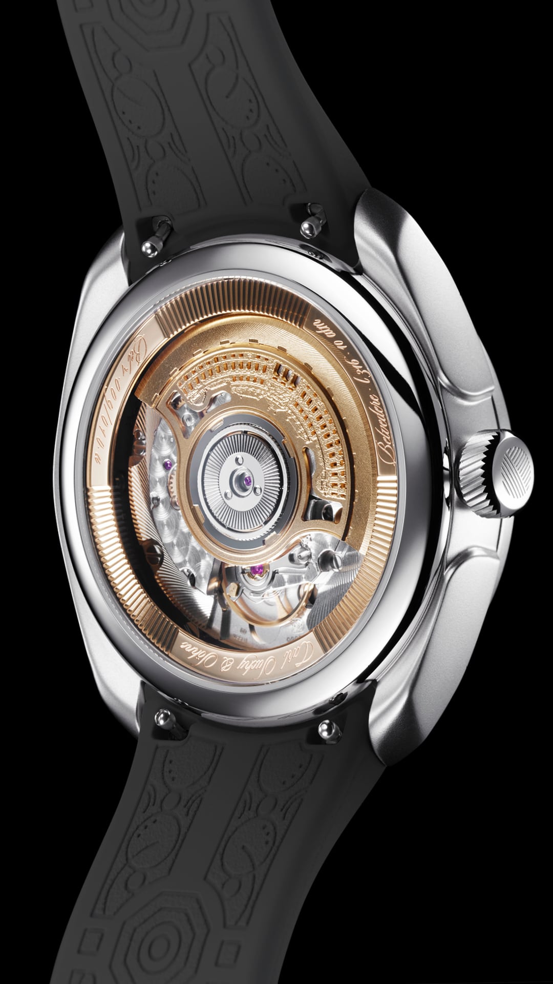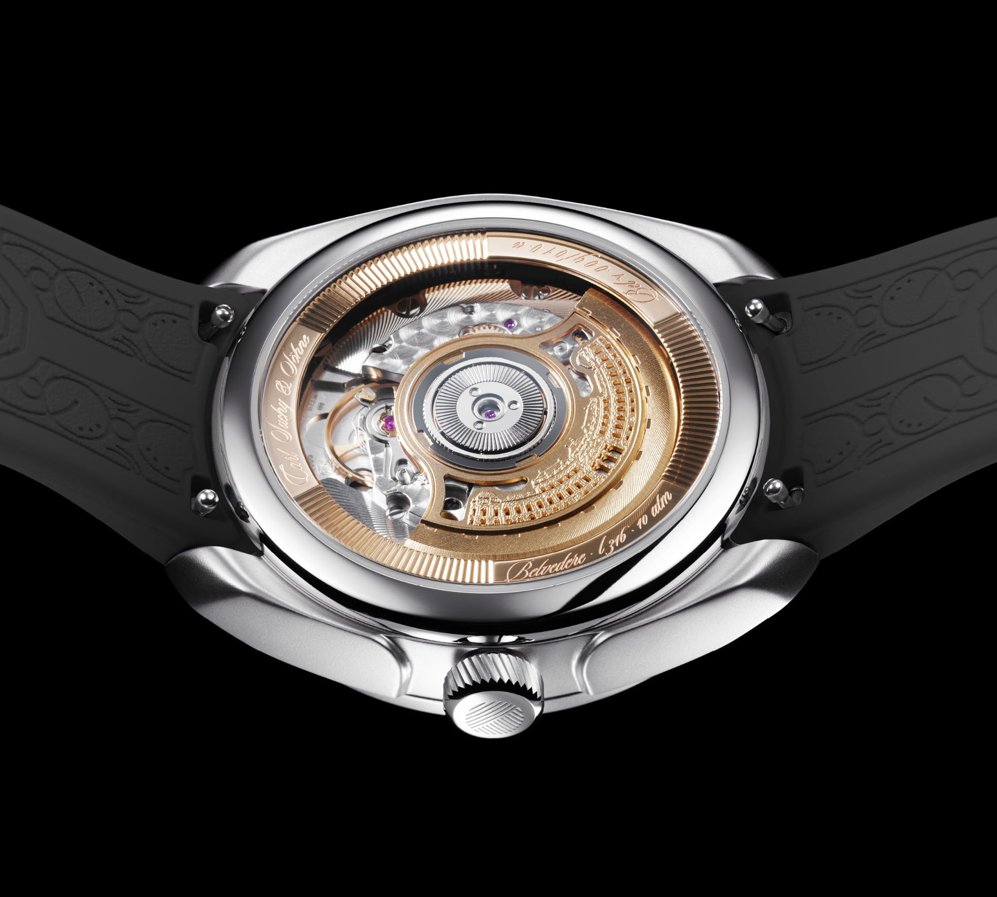 The heart of the watch reveals a gold-plated rotor featuring the micro-engraved facade of the magnificent Belvedere Palace, visible through the scratch-resistant sapphire crystal case back. It belongs to the reliable CSS201 caliber, based upon a Dubois Dépraz, which delivers 42 hours of power reserve.