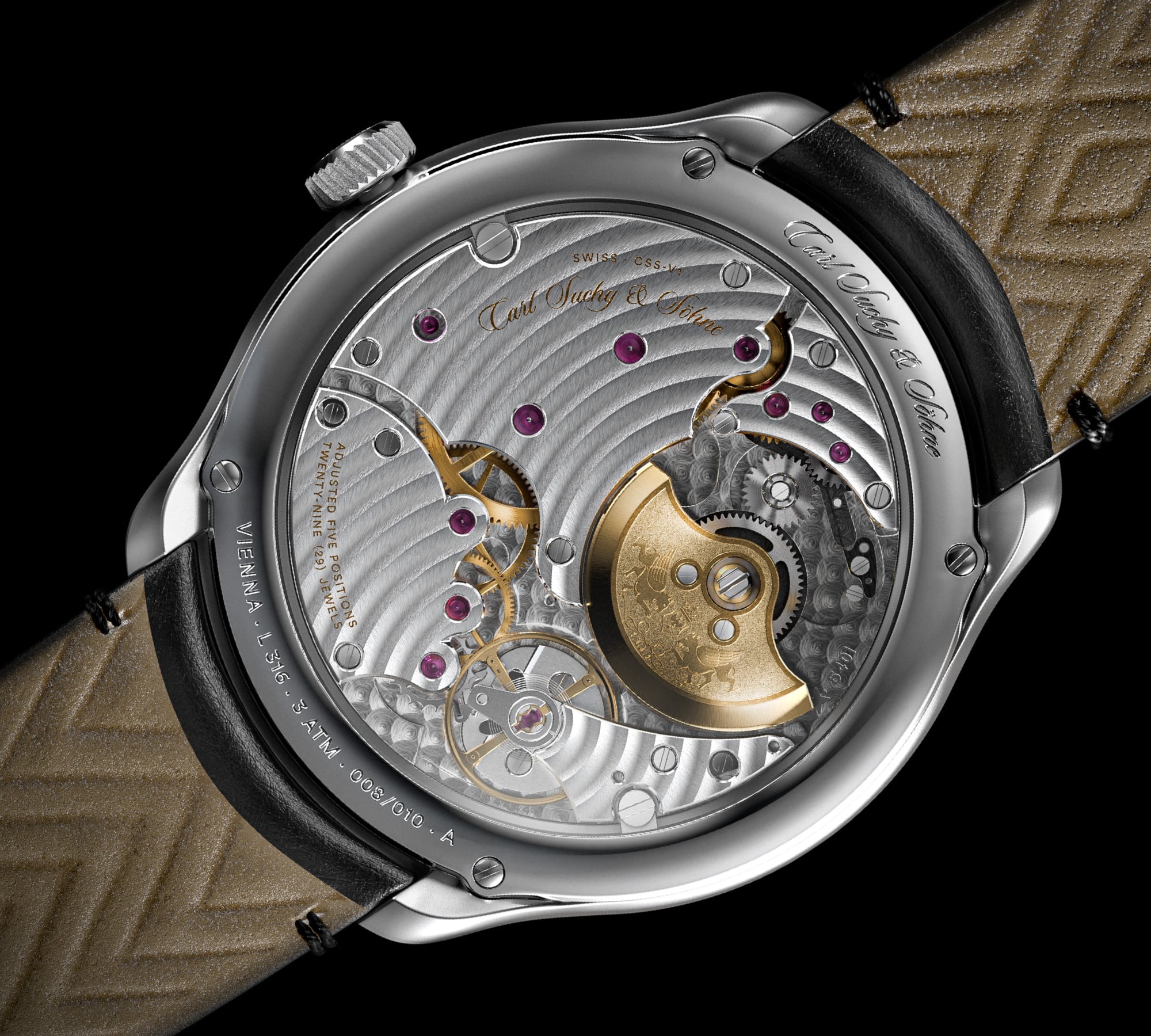The case back, made of scratch-resistant sapphire crystal, reveals the golden micro-rotor intricately engraved with the Carl Suchy & Söhne logo, featuring the double griffins, the Habsburg crown, and the double eagle. The watch runs on the ultra-slim automatic movement CSS-V1 providing a power reserve of 48 hours. The movement is hand-finished and is adorned by a beautifully done Côtes-de-Vienne finish.