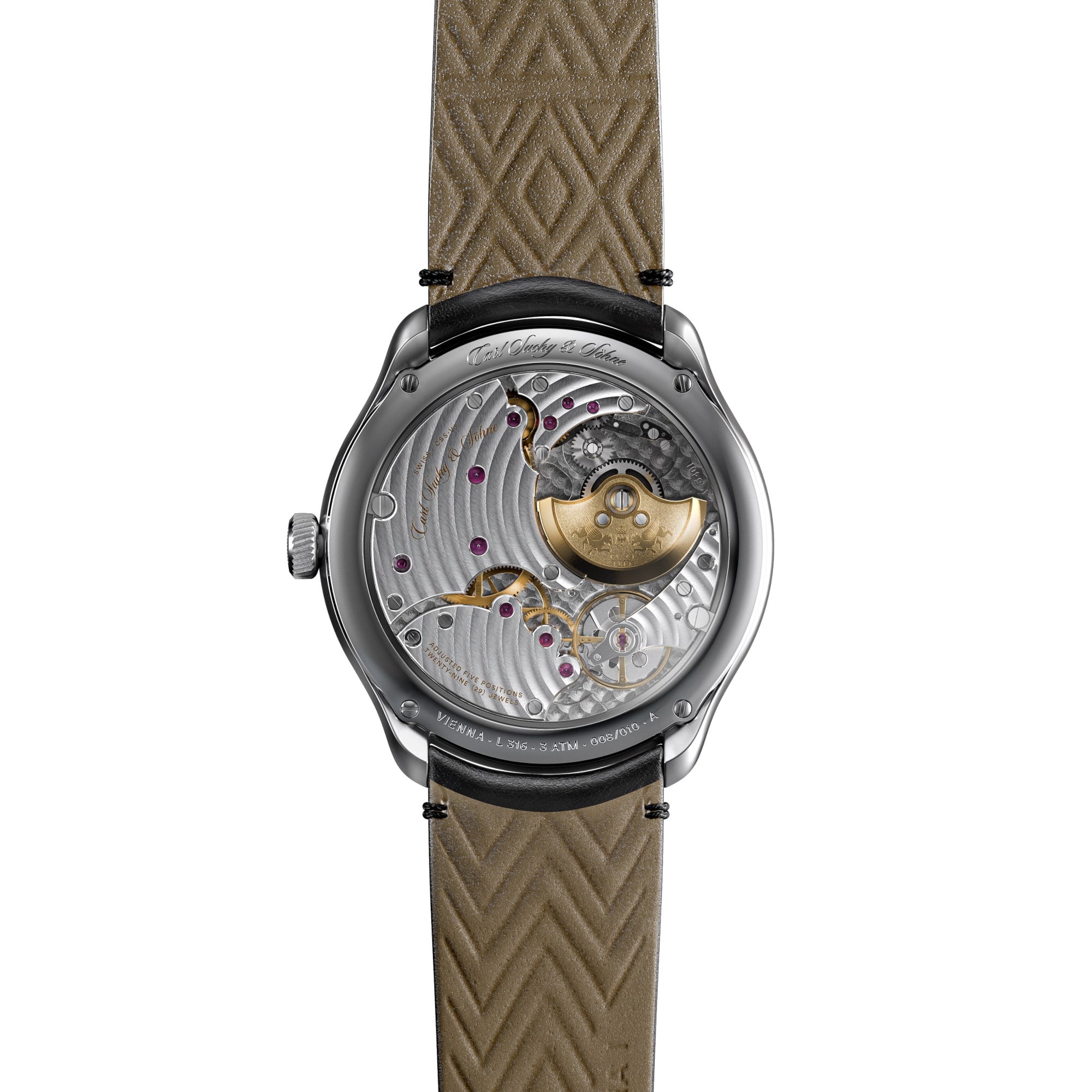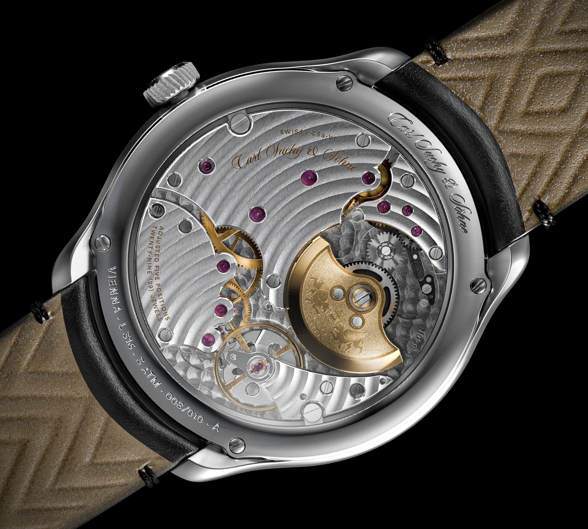 The case back, made of scratch-resistant sapphire crystal, reveals the golden micro-rotor intricately engraved with the Carl Suchy & Söhne logo, featuring the double griffins, the Habsburg crown, and the double eagle. The watch runs on the ultra-slim automatic movement CSS-V1 providing a power reserve of 48 hours. The movement is hand-finished and is adorned by a beautifully done Côtes-de-Vienne finish.