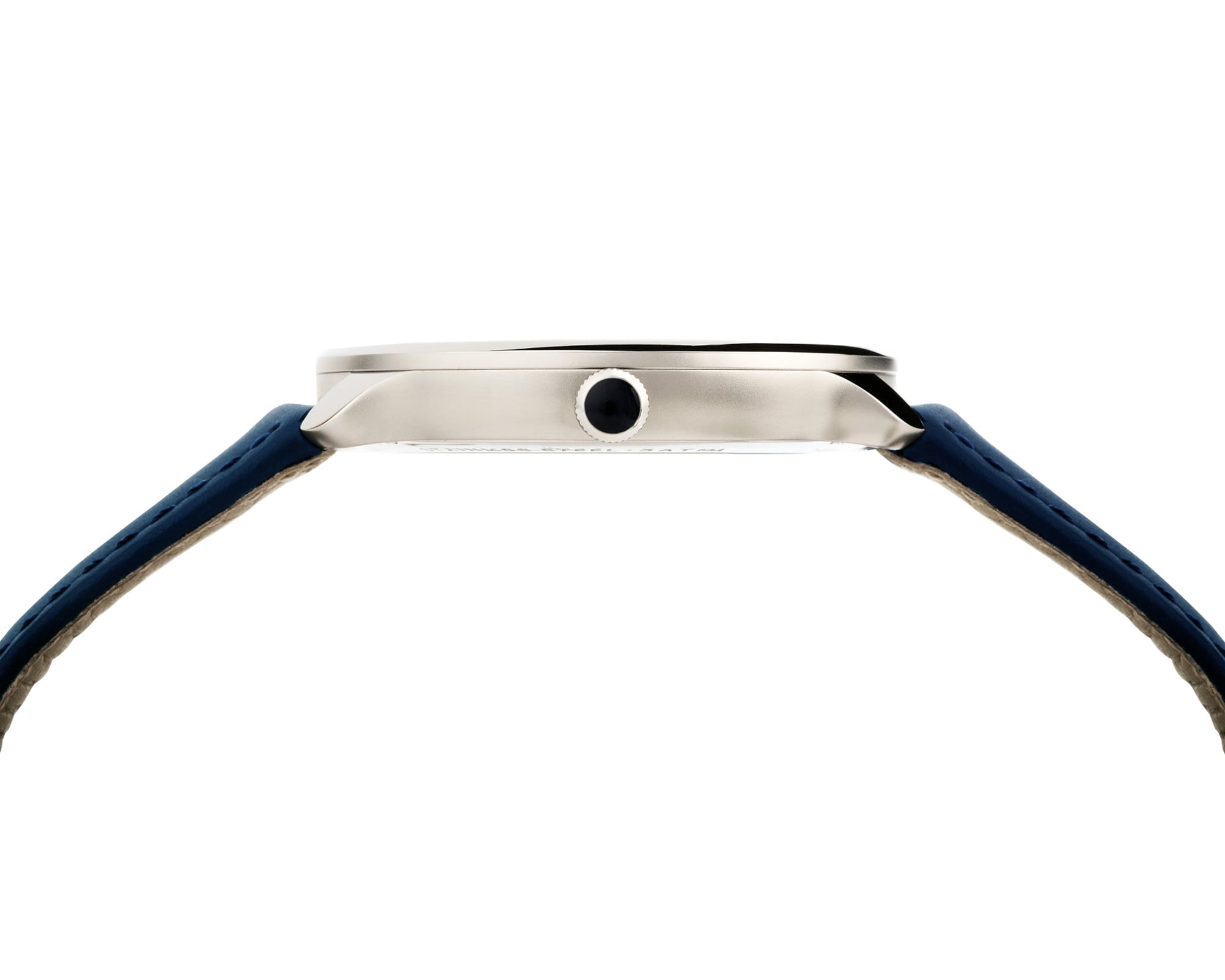 The strap is made of the highest quality blue genuine leather with blue lines and intricate details. The geometrical pattern on the inside of the strap was designed for Carl Suchy & Söhne and is a homage to the prolific Viennese architect Adolf Loos. The stainless steel security push buckle of Carl Suchy & Söhne is adorned by the historic griffon-logo.