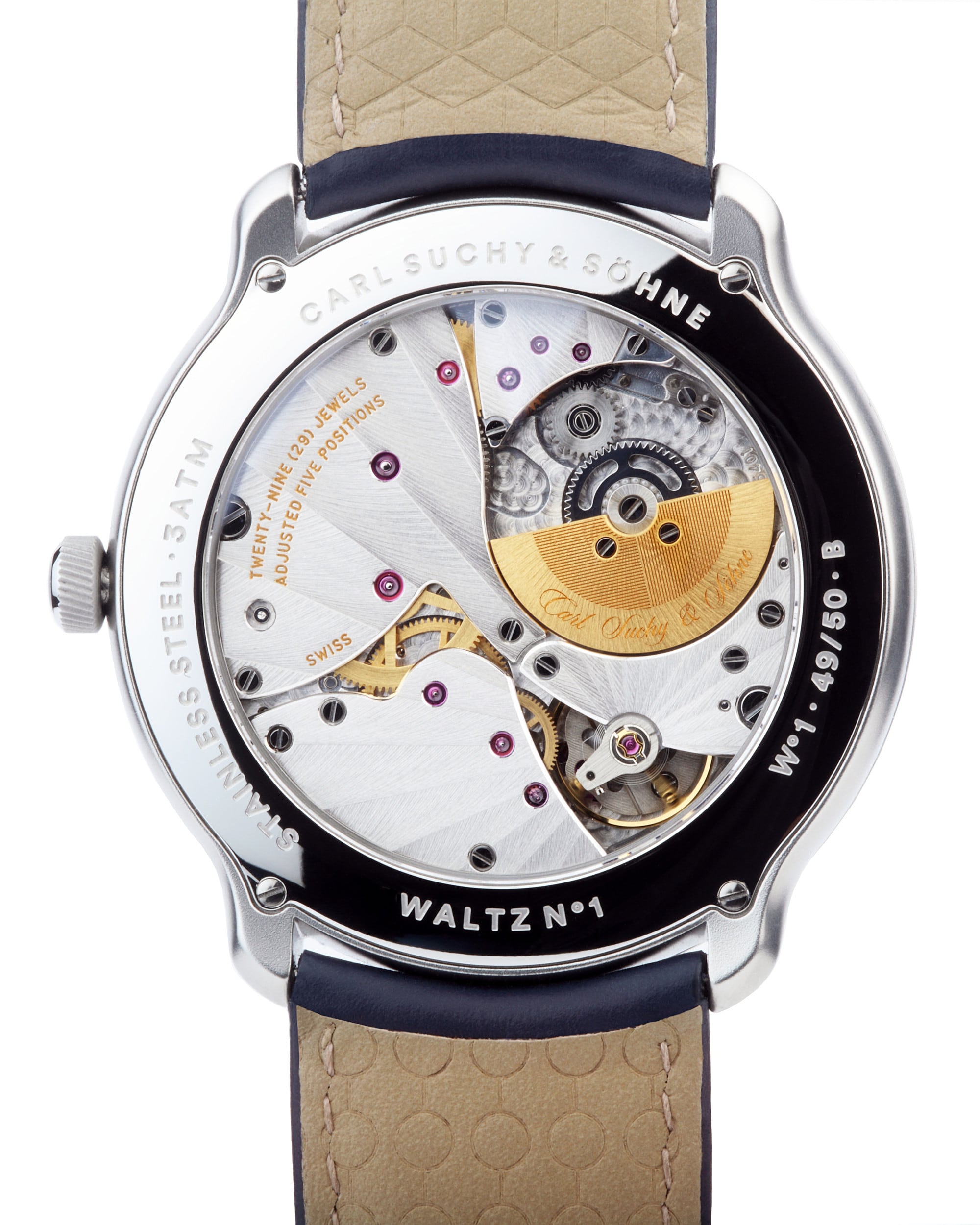 The 41.5mm stainless steel case of the Waltz N°1 Blue Danube plays smartly with the opposing brushed and polished surfaces. Serial Number is engraved on the back. Transparent case back.