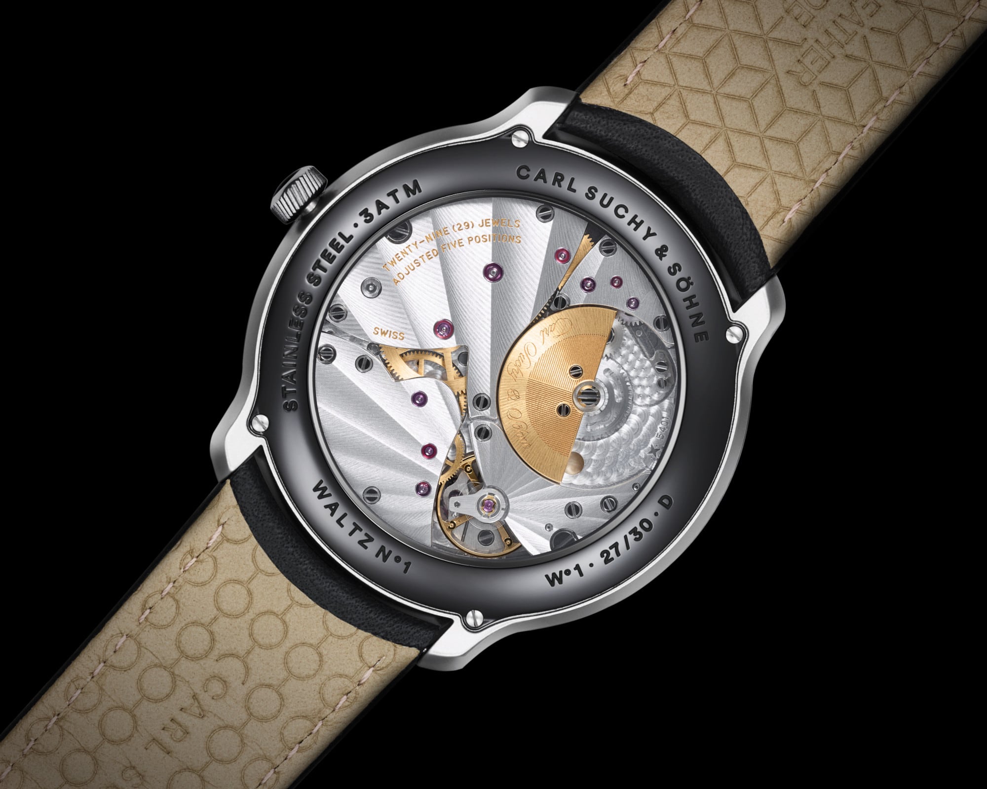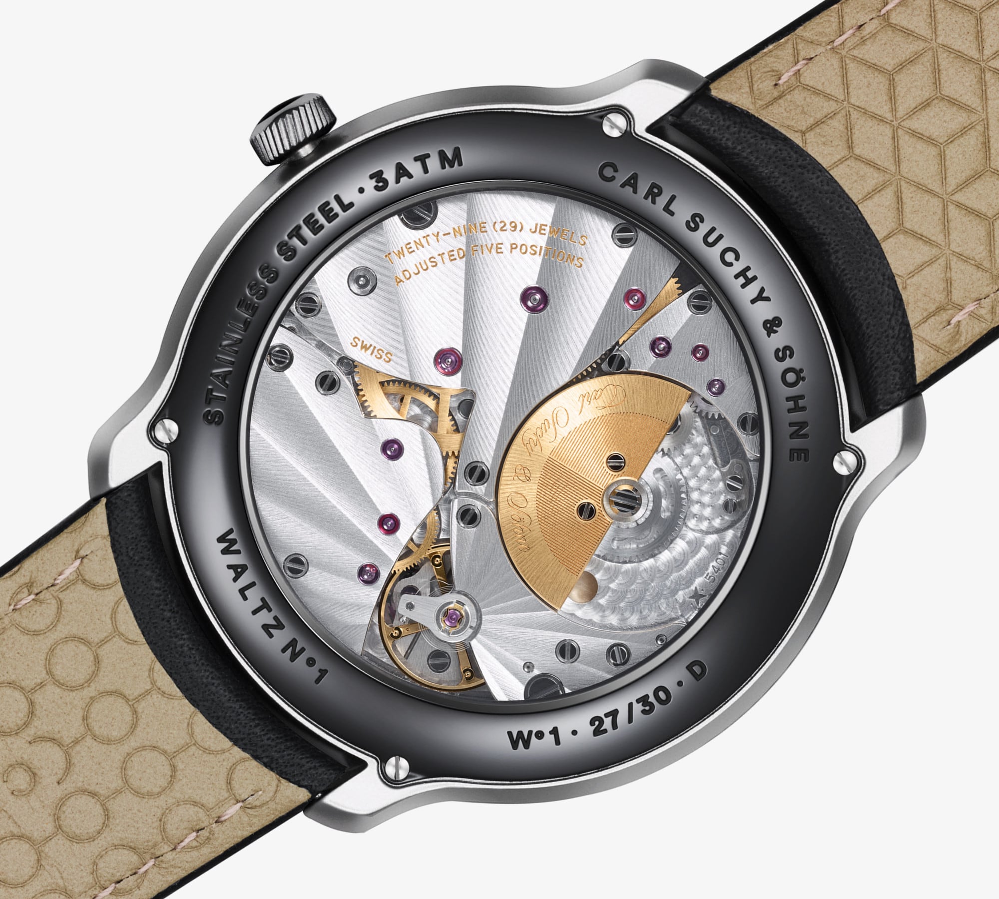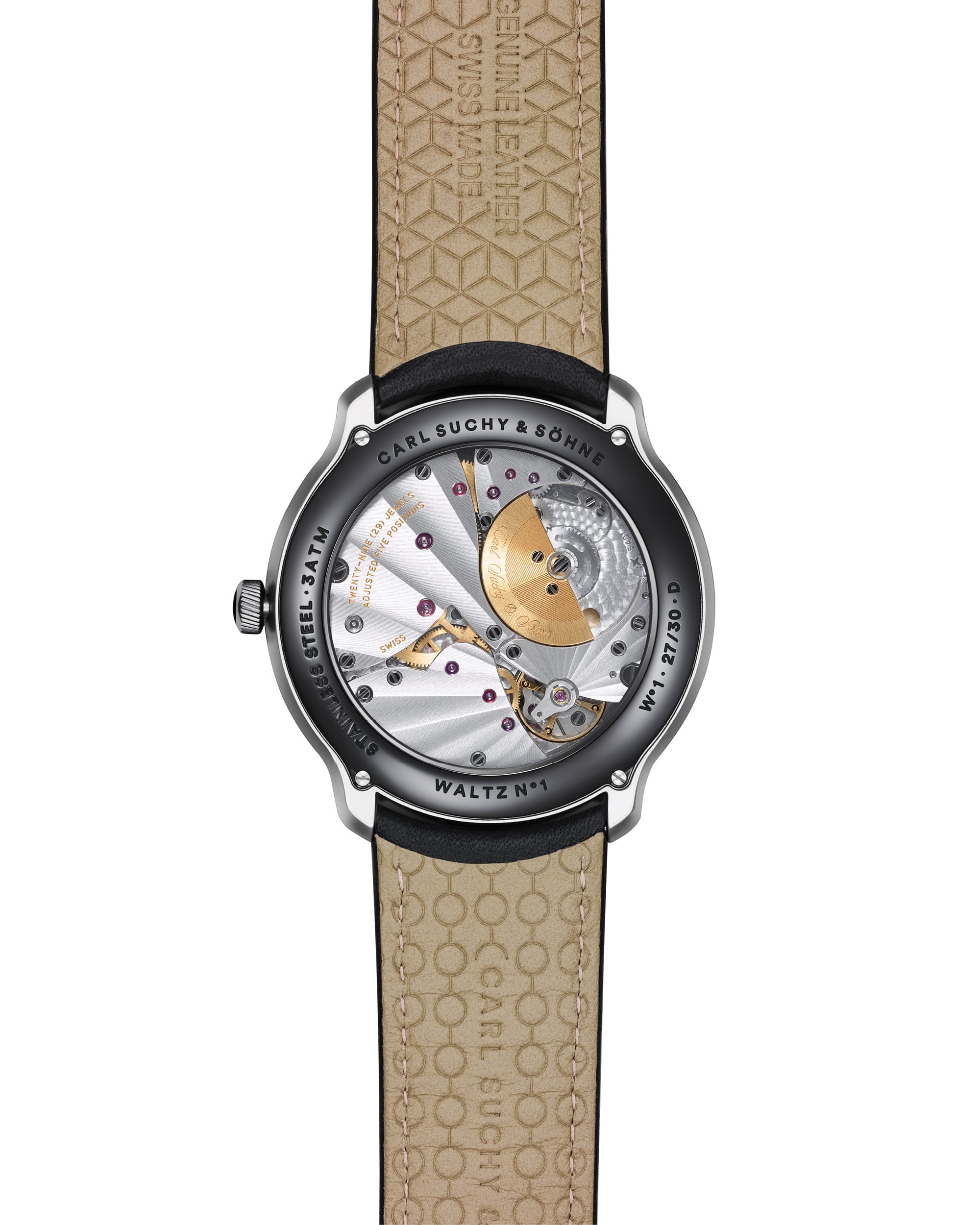 Every detail of the Waltz N°1 Moll is carefully considered and handcrafted to offer a unique experience that bridges the gap between Carl Suchy & Söhne’s rich history and modern aesthetics. Every full minute, the Carl Suchy & Söhne seconds disc harmonizes perfectly with the artfully guilloché pattern of the dial – a unique sight of perfect synchronicity.The specially adapted VMF5401 mechanical movement from the traditional Swiss manufacturer Vaucher Fleurier with its golden micro-rotor is visible through the scratch-resistant sapphire crystal case back. The caliber is enhanced by hand-polished edges and a “Côtes du Soleil” cut.