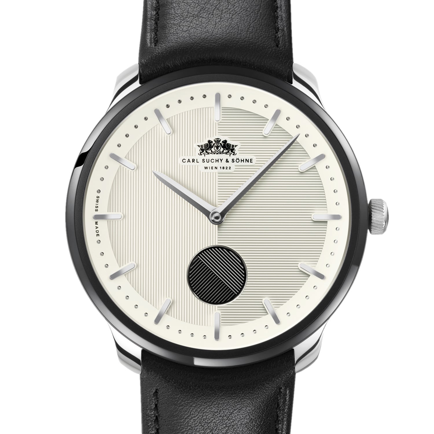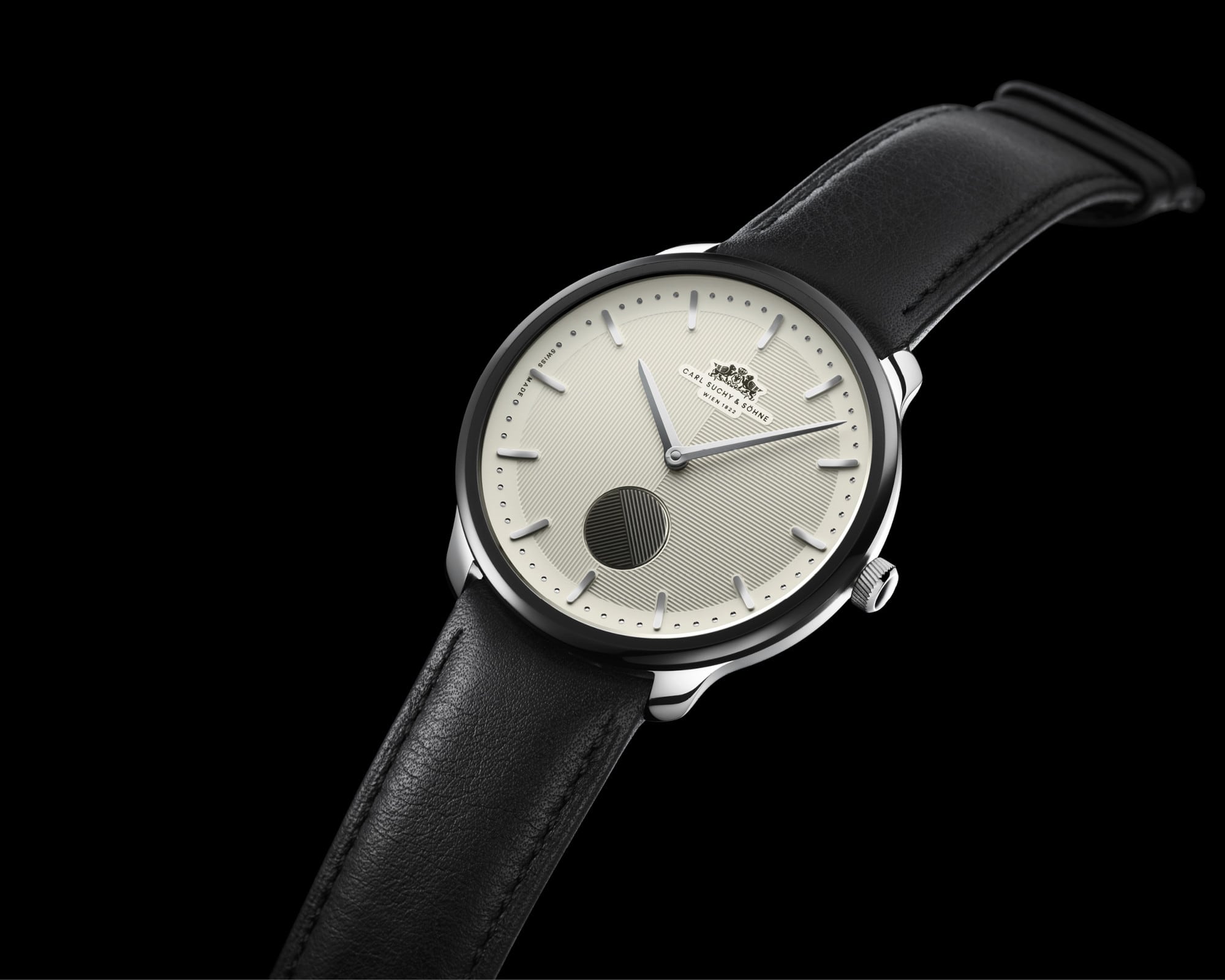 Black genuine leather strap (optional: alligator strap) with black stitching and stamped pattern on the inside specially created for Carl Suchy & Söhne. The push buckle offers maximum comfort and security. The clasp is adorned with the historic double clasp badge from Carl Suchy & Söhne.