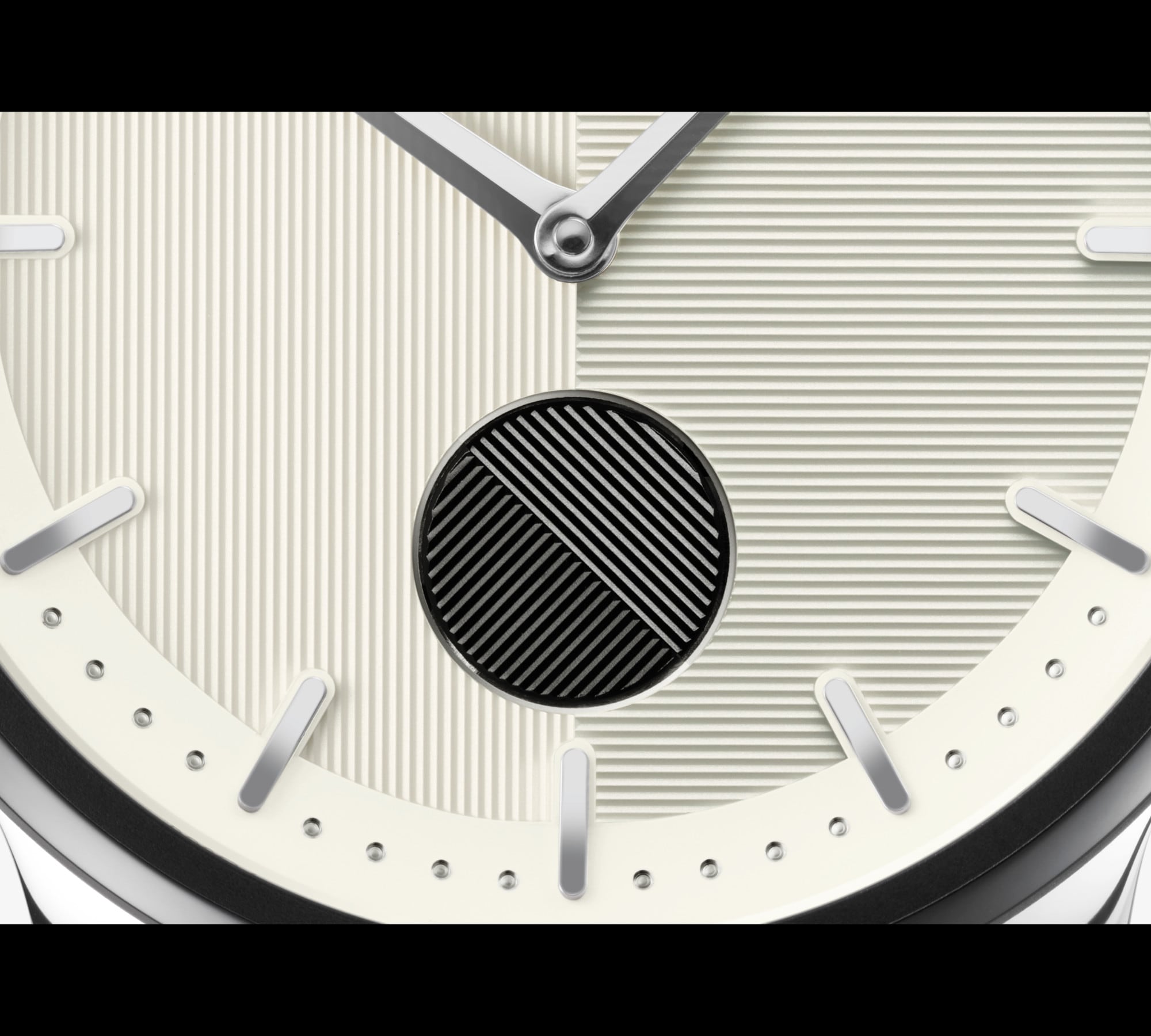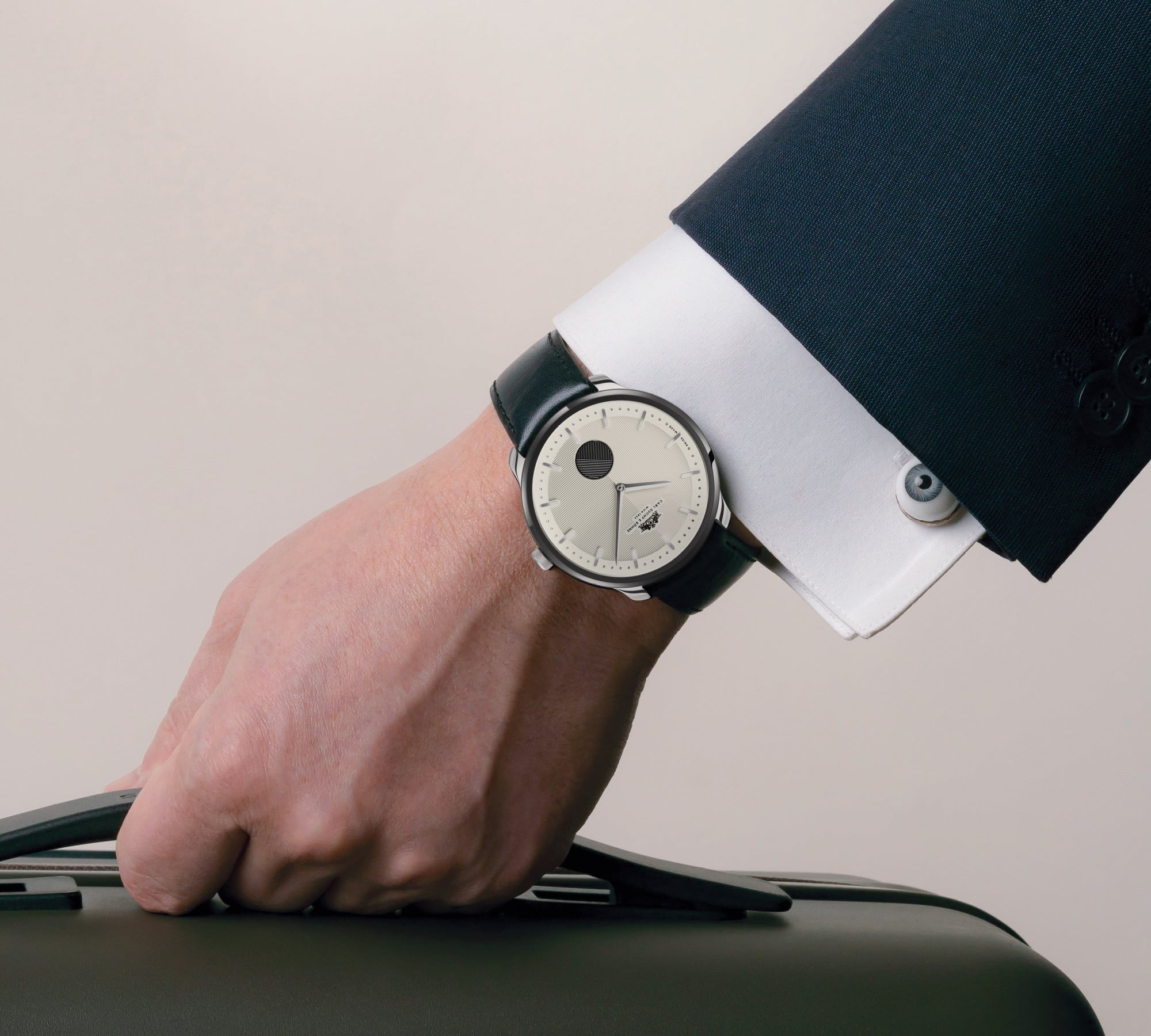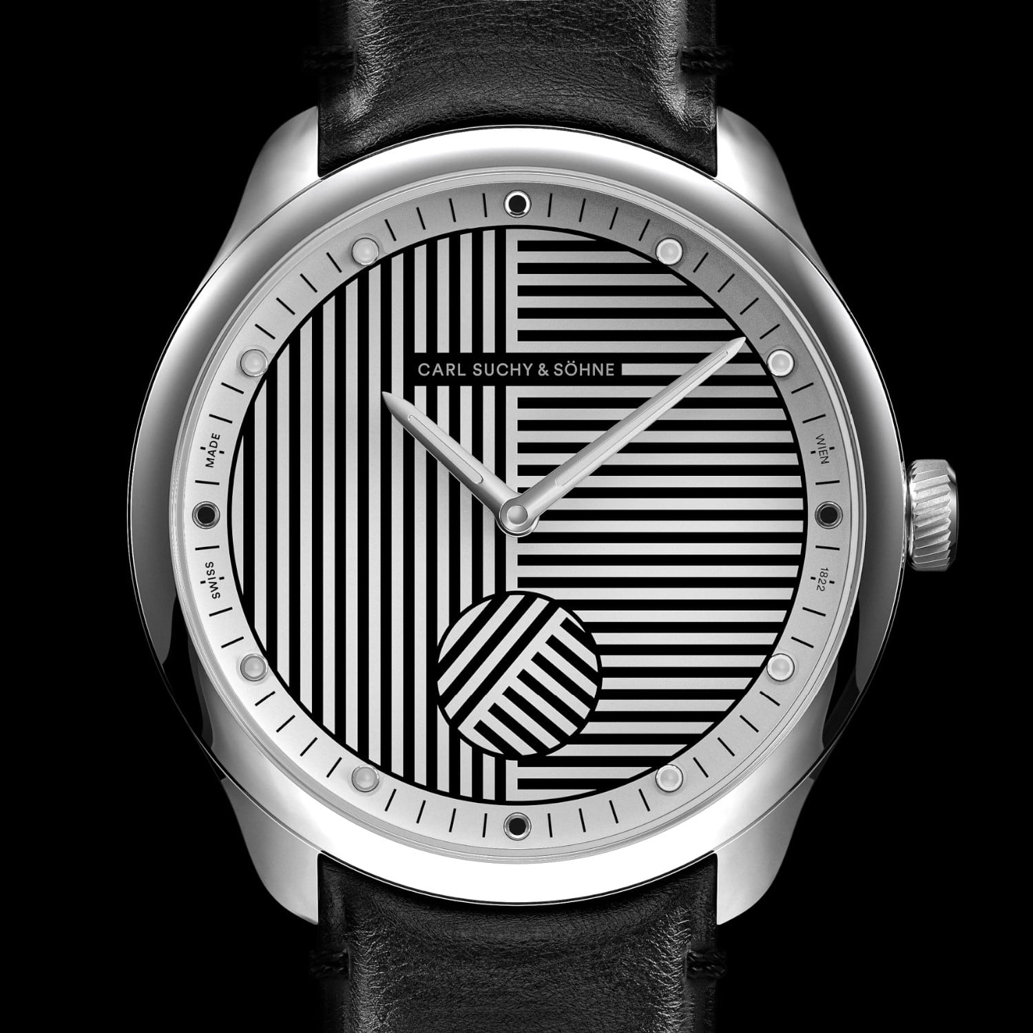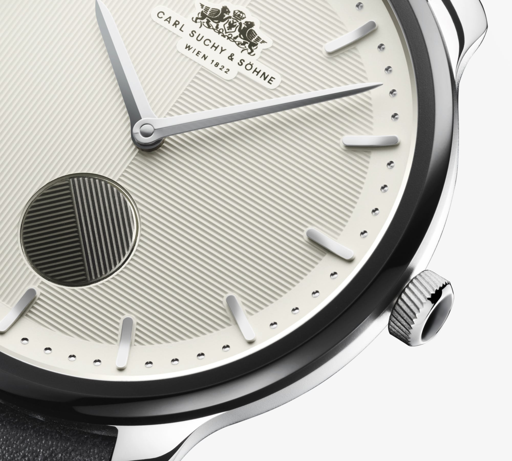 The dial is white and divided in half by vertical and horizontal guilloche pattern. At every full minute, the black rotating seconds disc at 6 o’clock aligns with the pattern of the dial – for the Viennese sense of time, in which the second does not count.