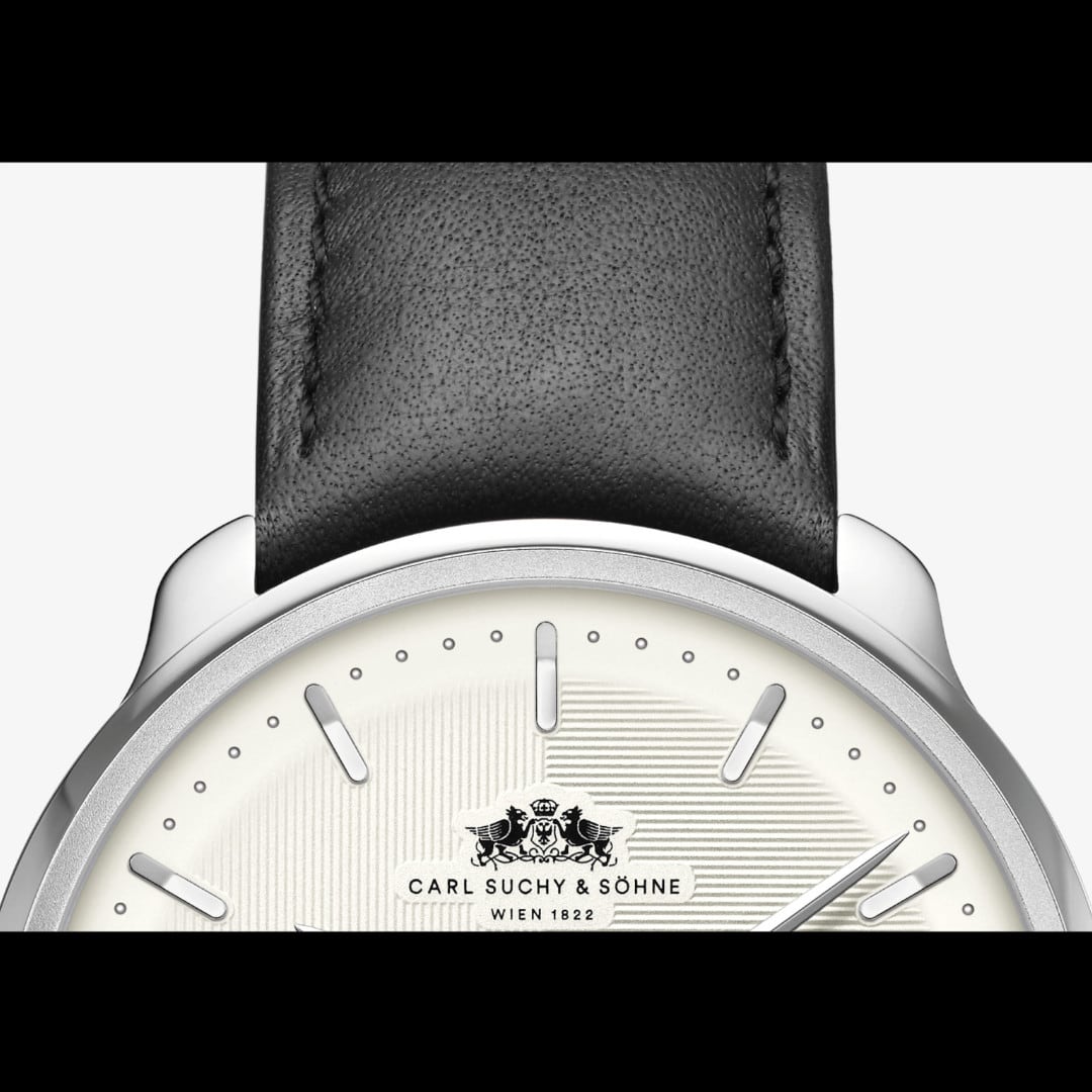 Black genuine leather strap with black stitching and stamped pattern on the inside specially created for Carl Suchy & Söhne. The push buckle offers maximum comfort and security.