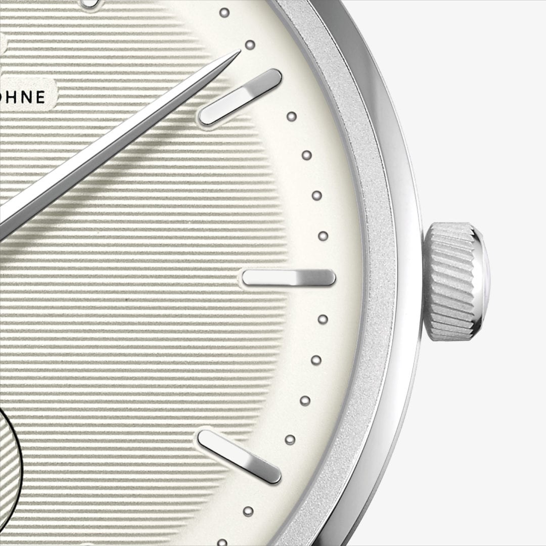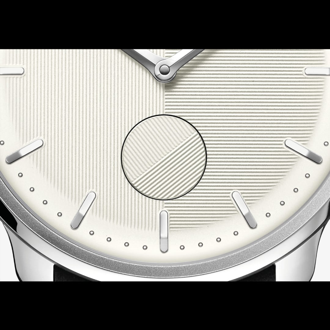 The dial is white and divided in half by vertical and horizontal guilloche pattern. At every full minute, the rotating seconds disc at 6 o’clock aligns with the pattern of the dial – for the Viennese sense of time, in which the second does not count.