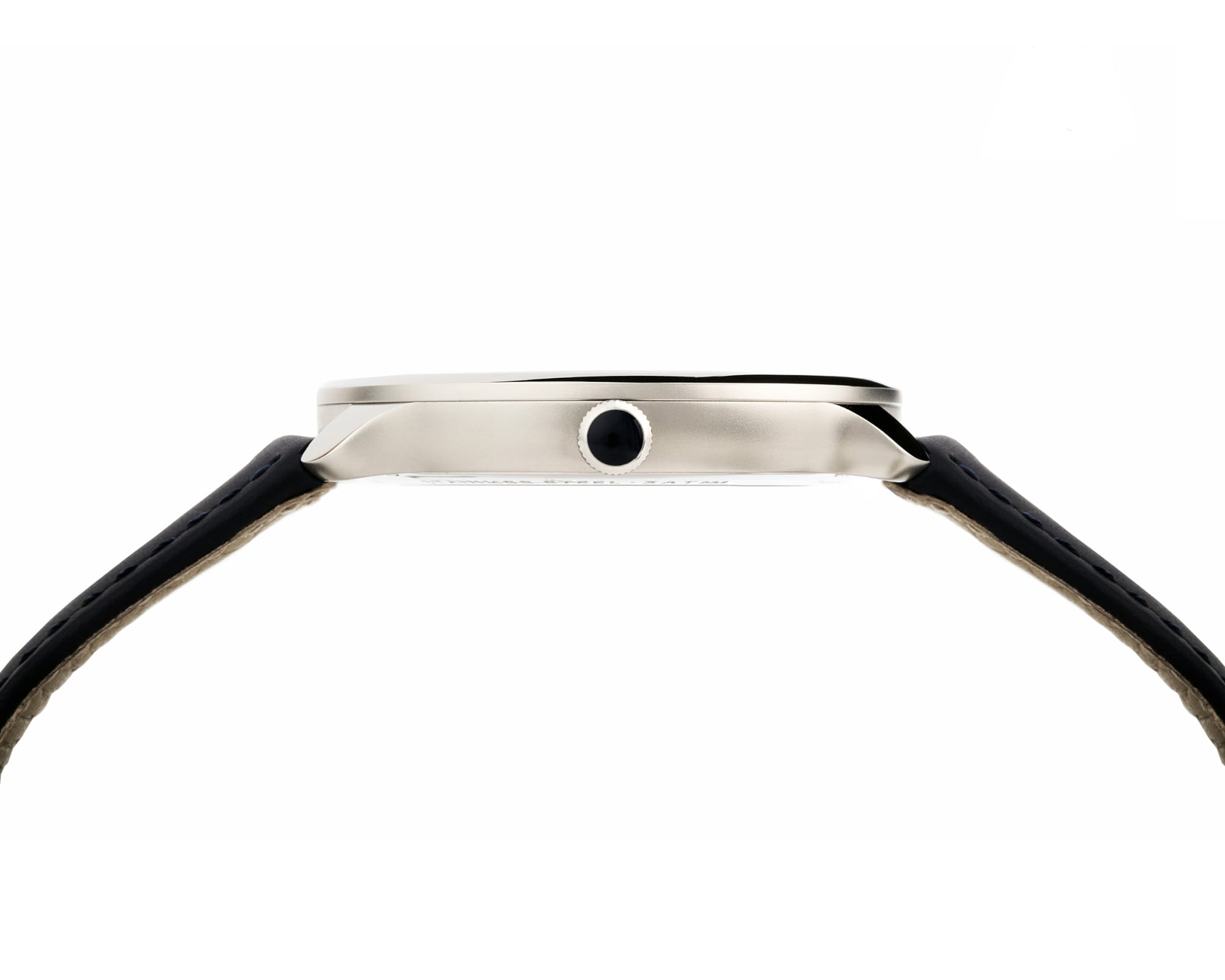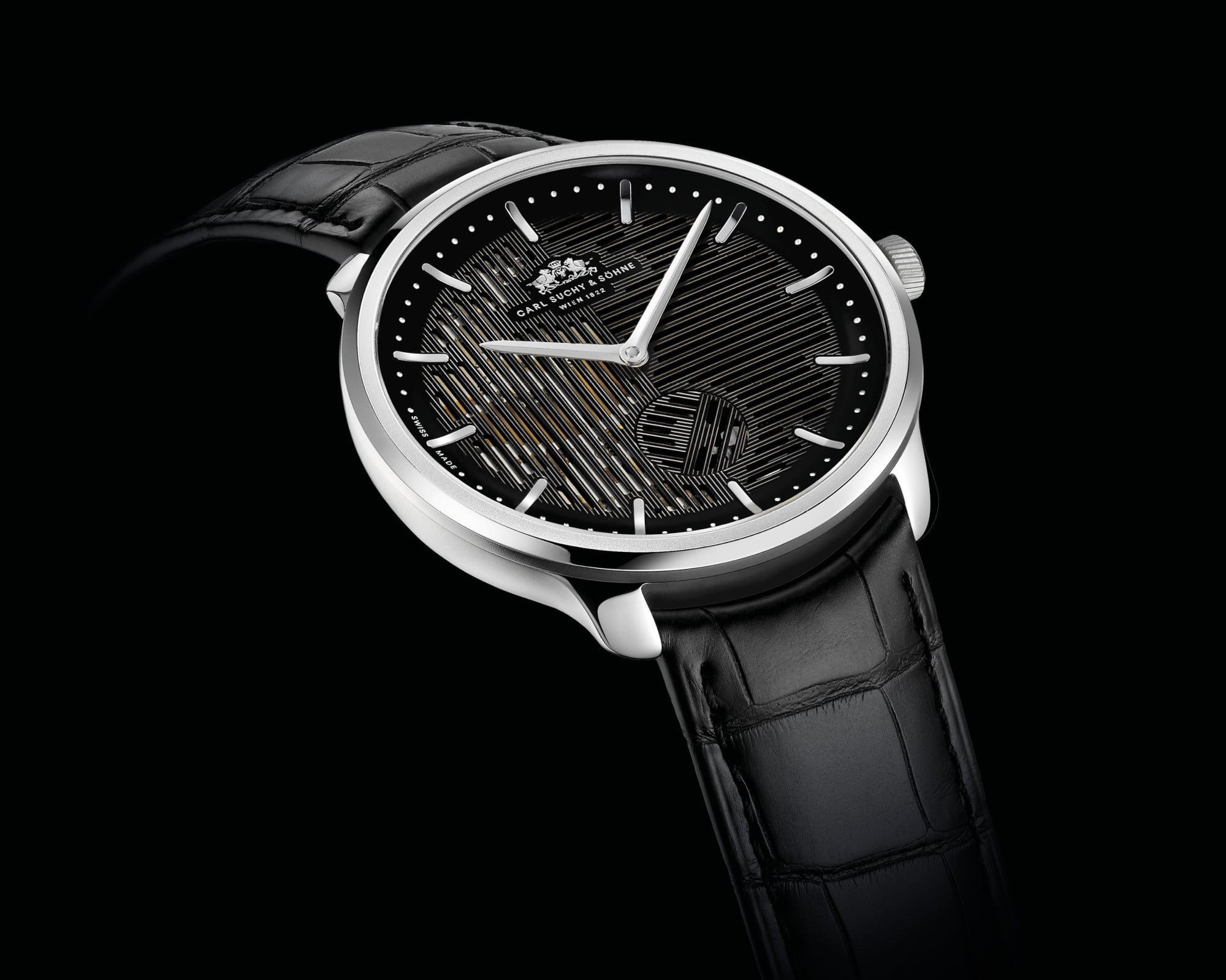 Genuine alligator strap with black stitching. The pattern on the inside of the bracelet was inspired by Adolf Loos and was designed especially for Carl Suchy & Söhne. The security push buckle offers maximum wearing comfort and plays with the contrasts of matt and shiny surfaces. The clasp is adorned by the original double-stripe badge of Carl Suchy & Sons.