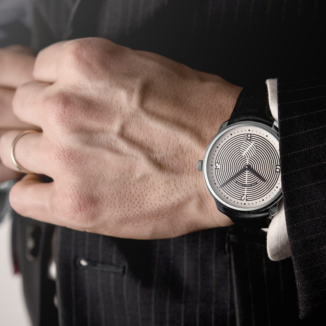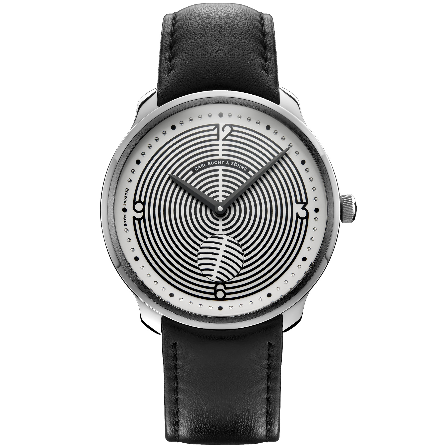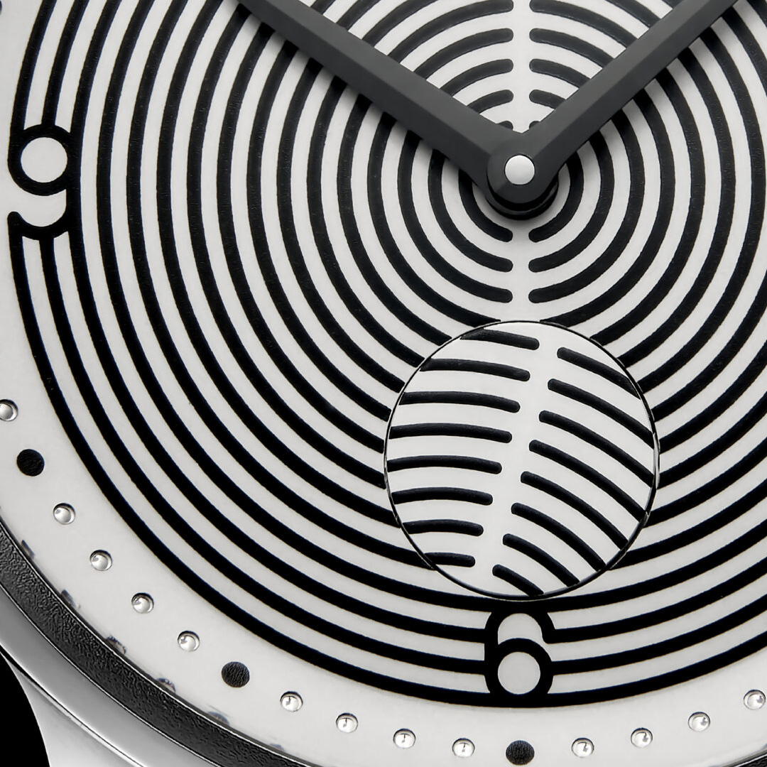 The Hoffmann does not follow a decorative motif. Its dial is based on a geometric grid of concentric lines. The numerals 12, 3, 6 and 9 are not applied elements but integral components of this structure, emerging directly from the system itself.
