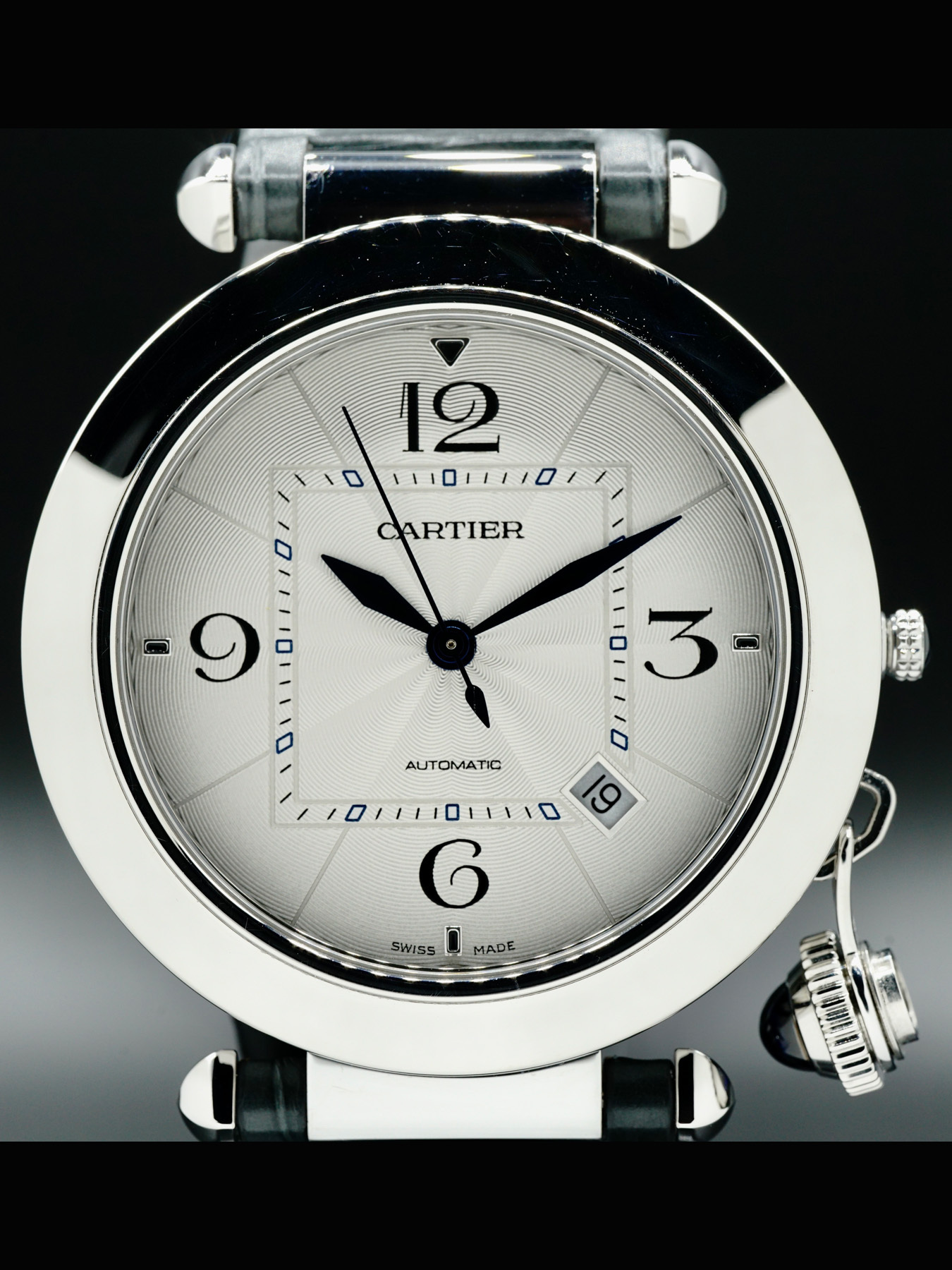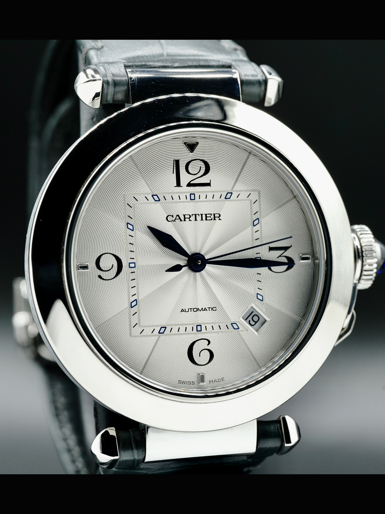 This Cartier Pasha de Cartier features a 41mm stainless steel case & bezel with a transparent sapphire crystal case back on a blue leather strap. This watch also showcases a silver flinqué dial with blued-steel diamond-shaped hands covered by scratch resistant sapphire crystal.
