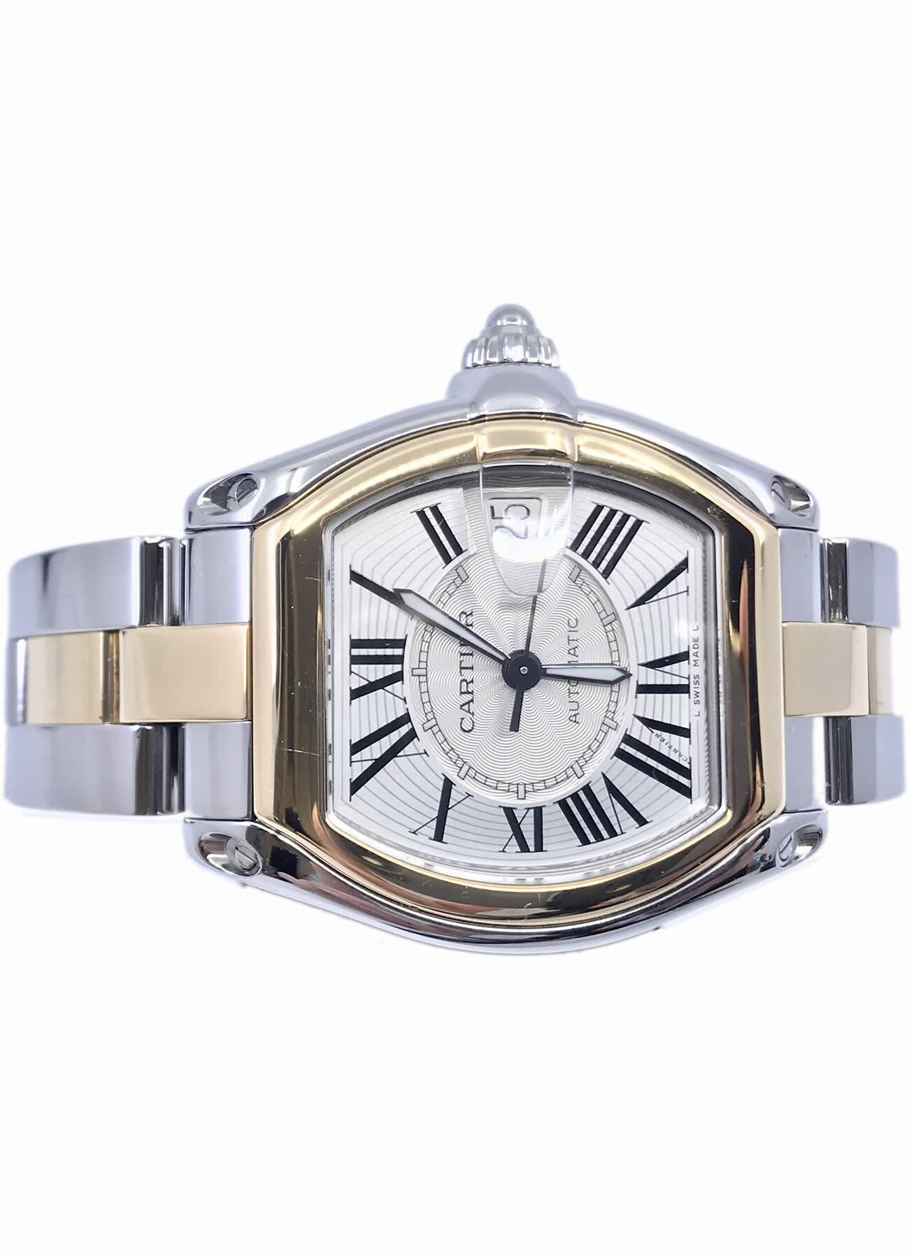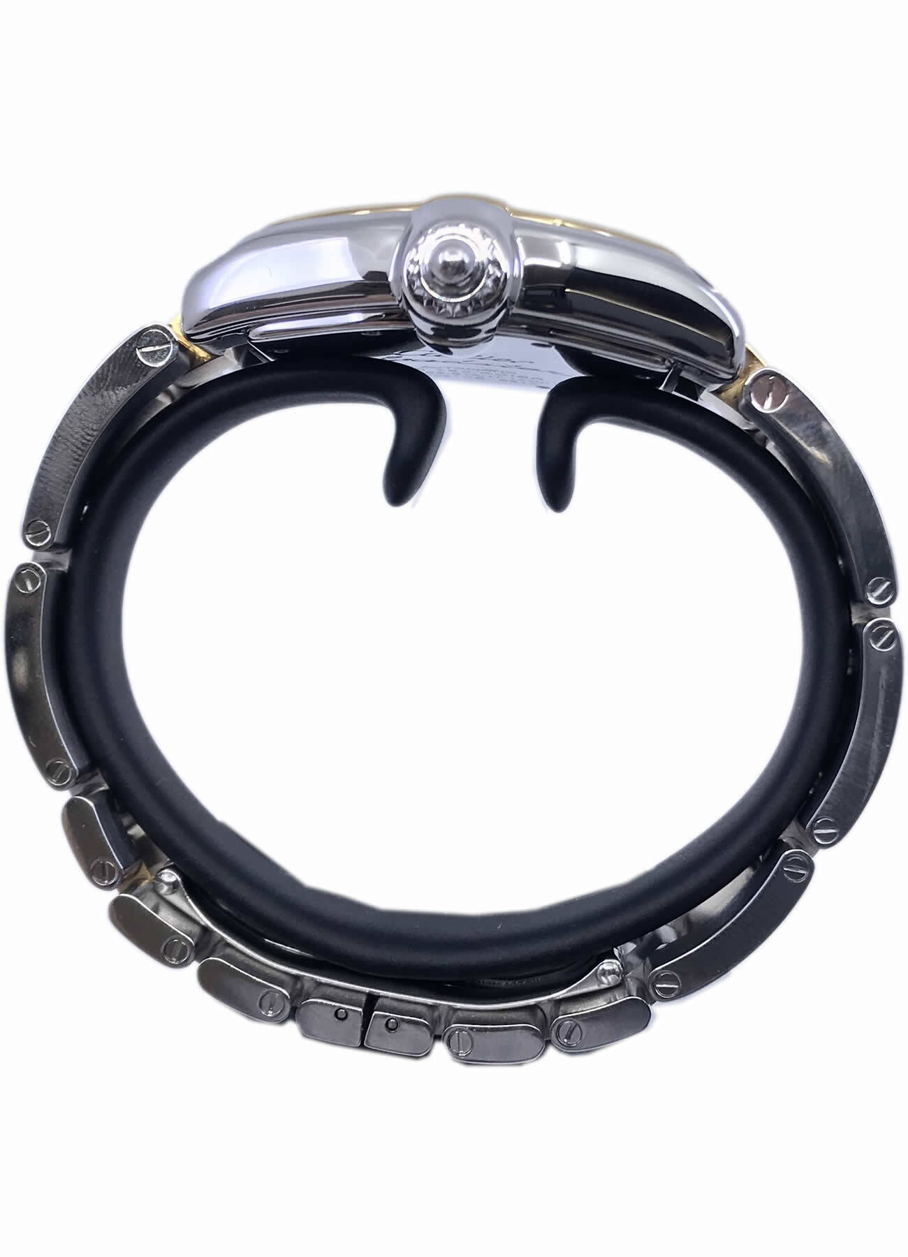 - This timepiece features a 38mm steel and gold case paired with a high quality steel bracelet. It showcases a distinctive white dial and is powered by a precise automatic winding movement. The watch is designed with a water resistance of up to 100m.