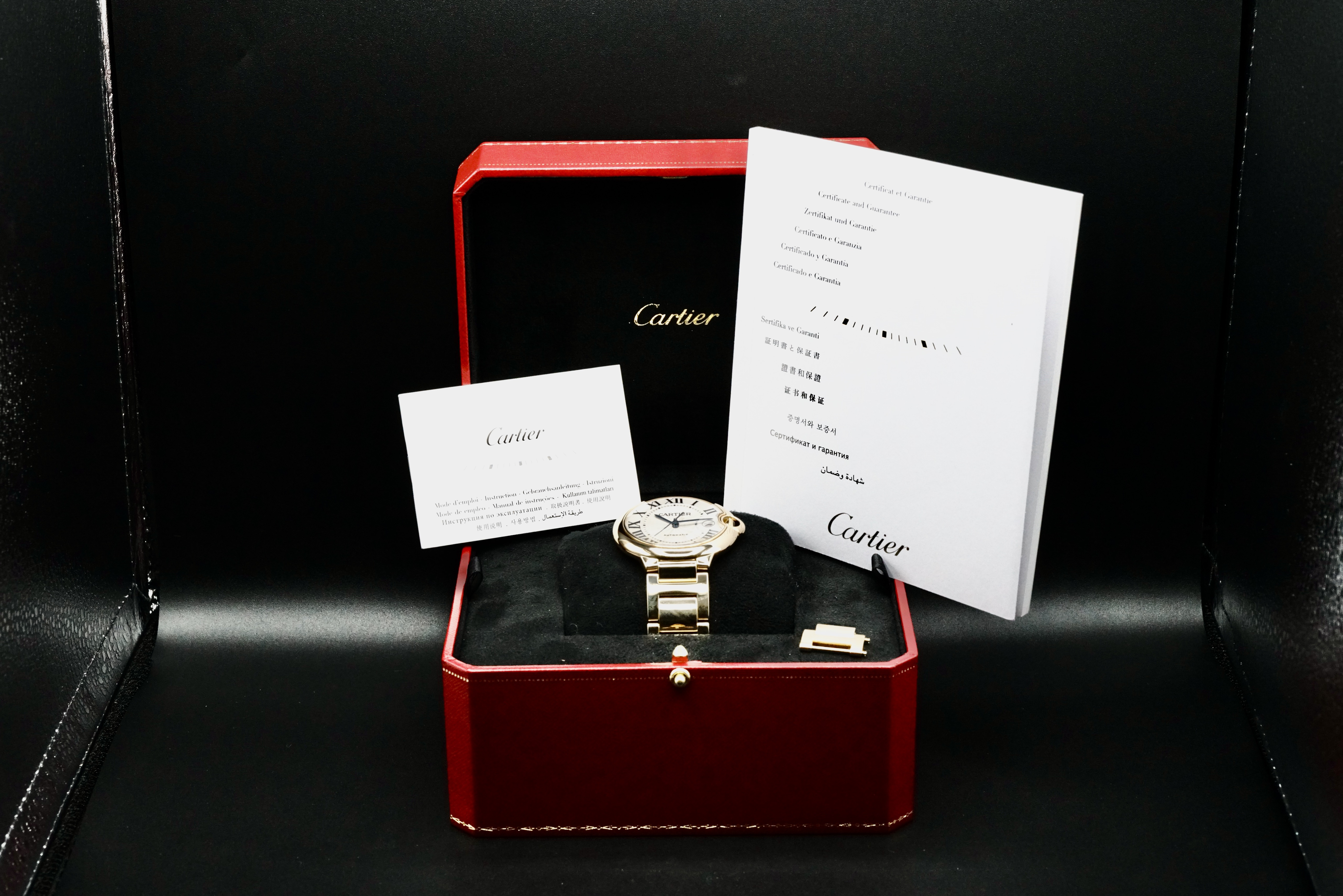This Cartier Ballon Bleu de Cartier WGBB0023 is in EXCELLENT condition. This watch includes its original box, instructions, and certificate & guarantee not dated. Extra 18k yellow gold bracelet link. This watch has been fully authenticated and certified by Exquisite Timepieces.