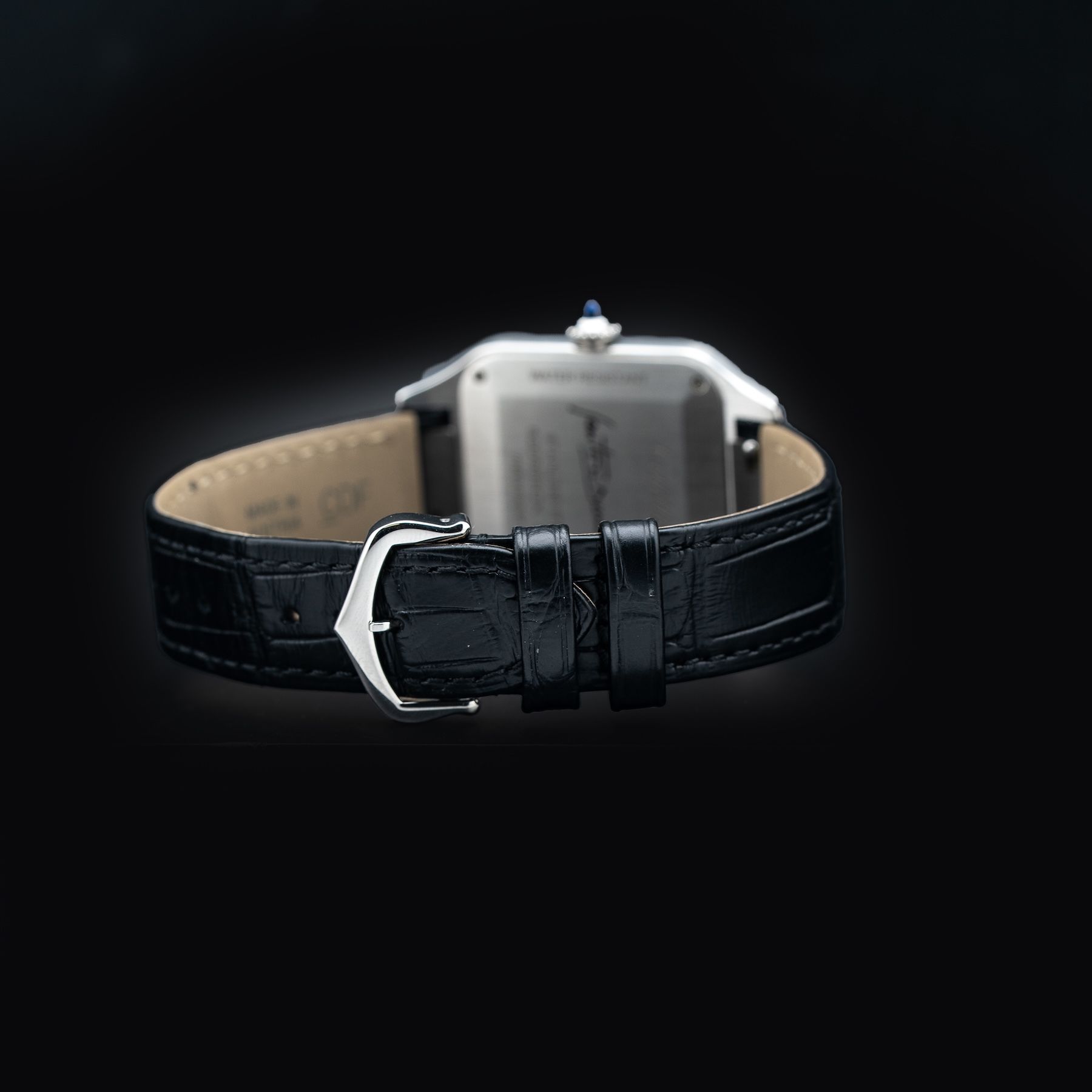 This watch features a 43mm steel case on leather strap. This watch also sports a black dial. Powered by a manual winding mechanical movement. Water resistance up to 30 meters.
