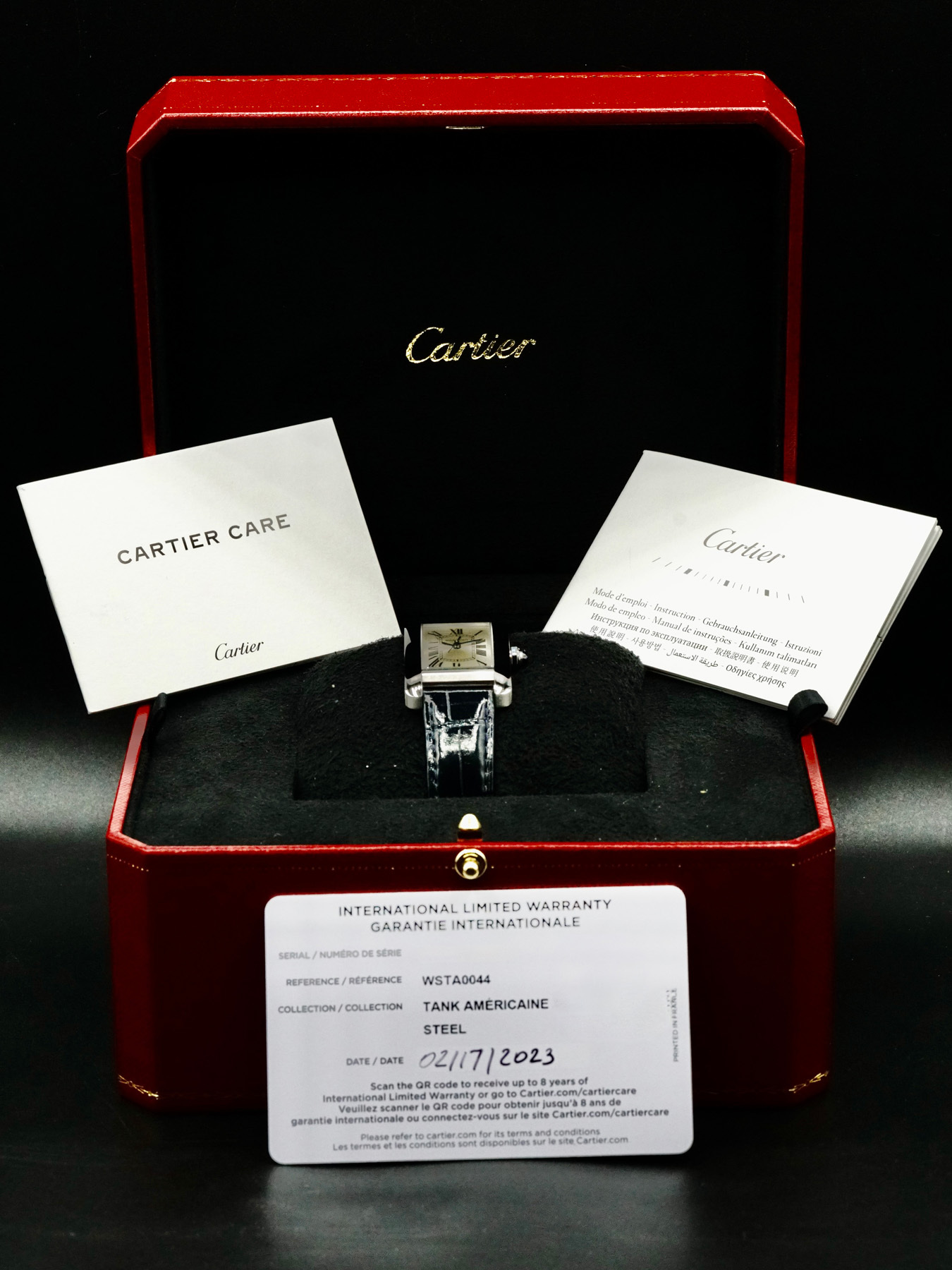 This Cartier WSTA0044 Tank Americaine is in GREAT condition. This watch includes original box, instruction booklet, warranty card dated 02/2023.