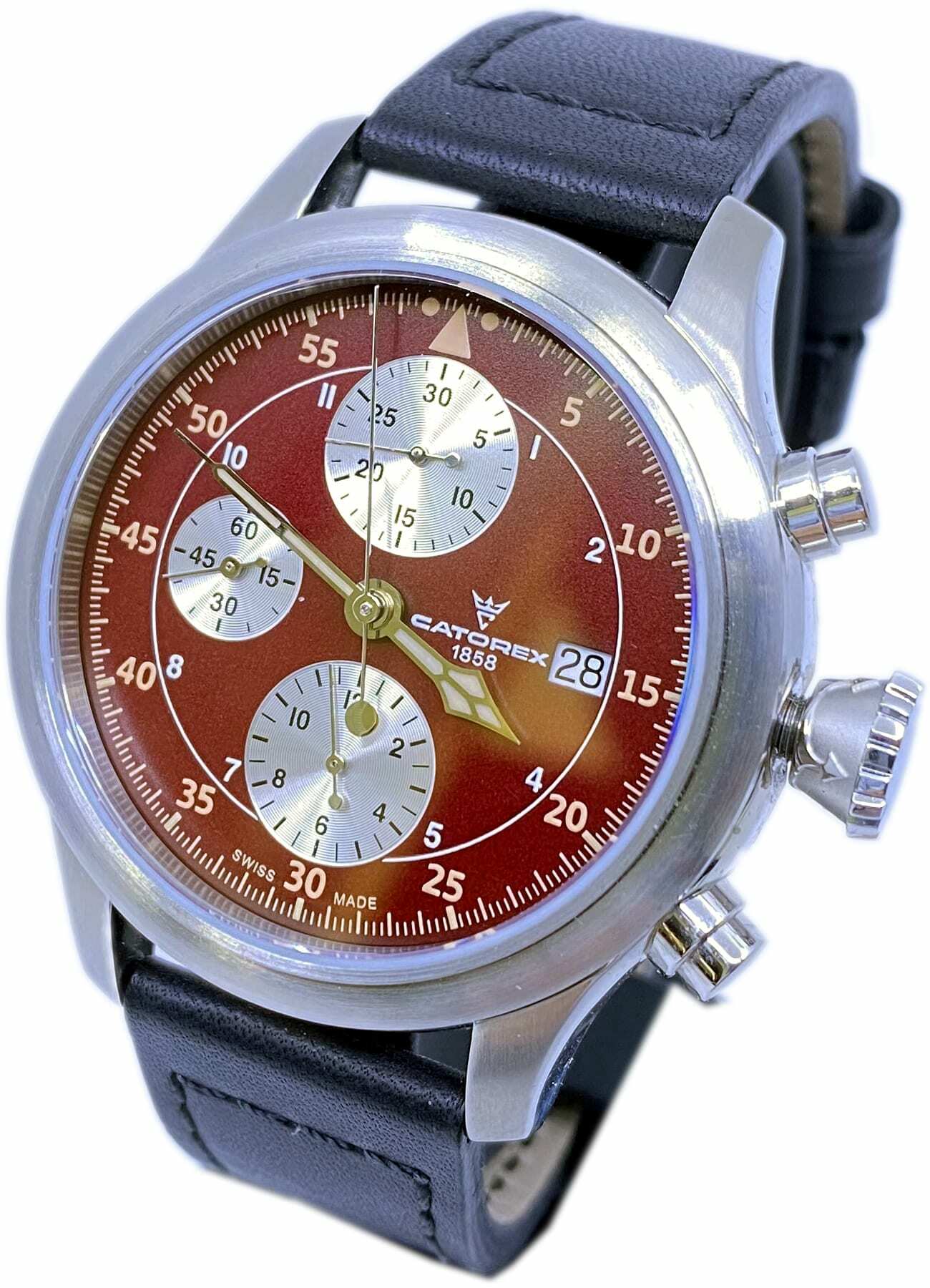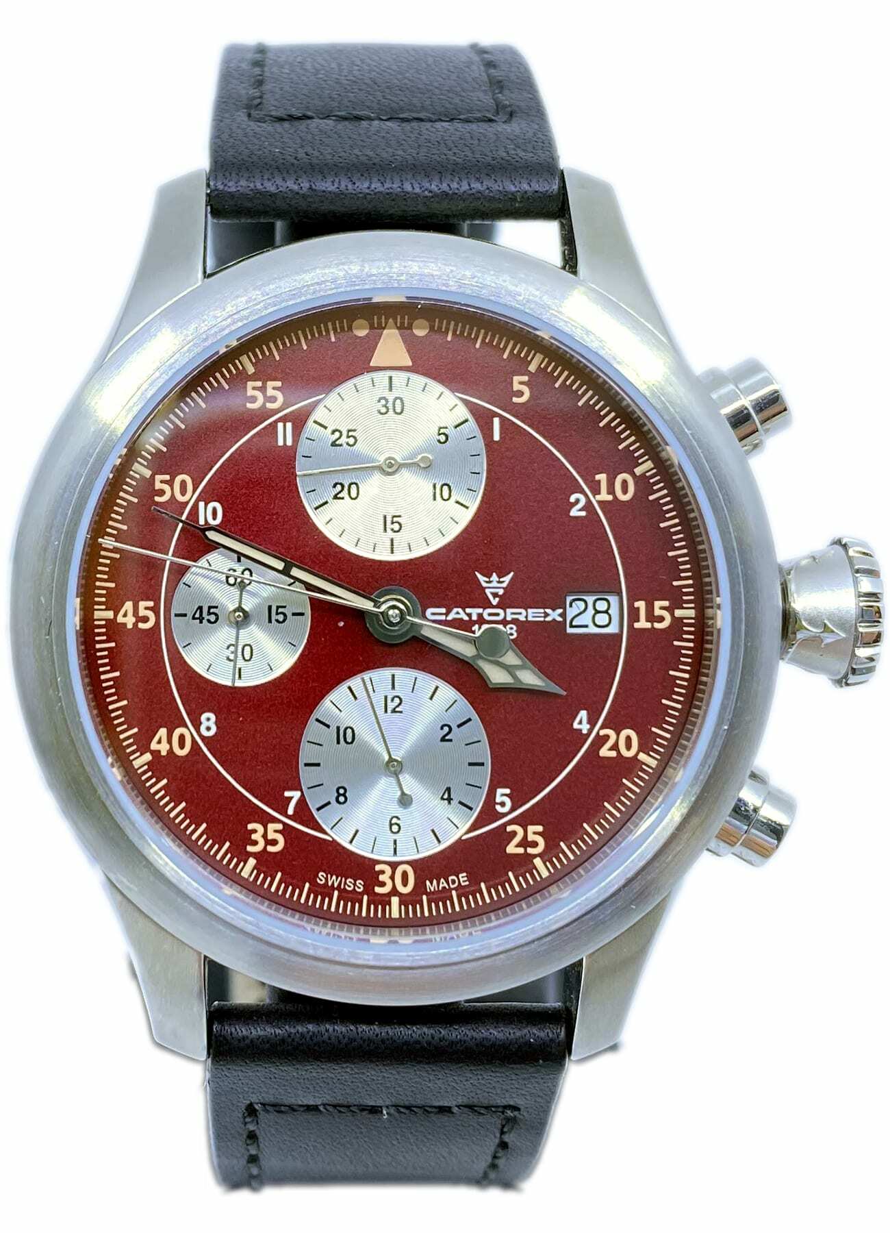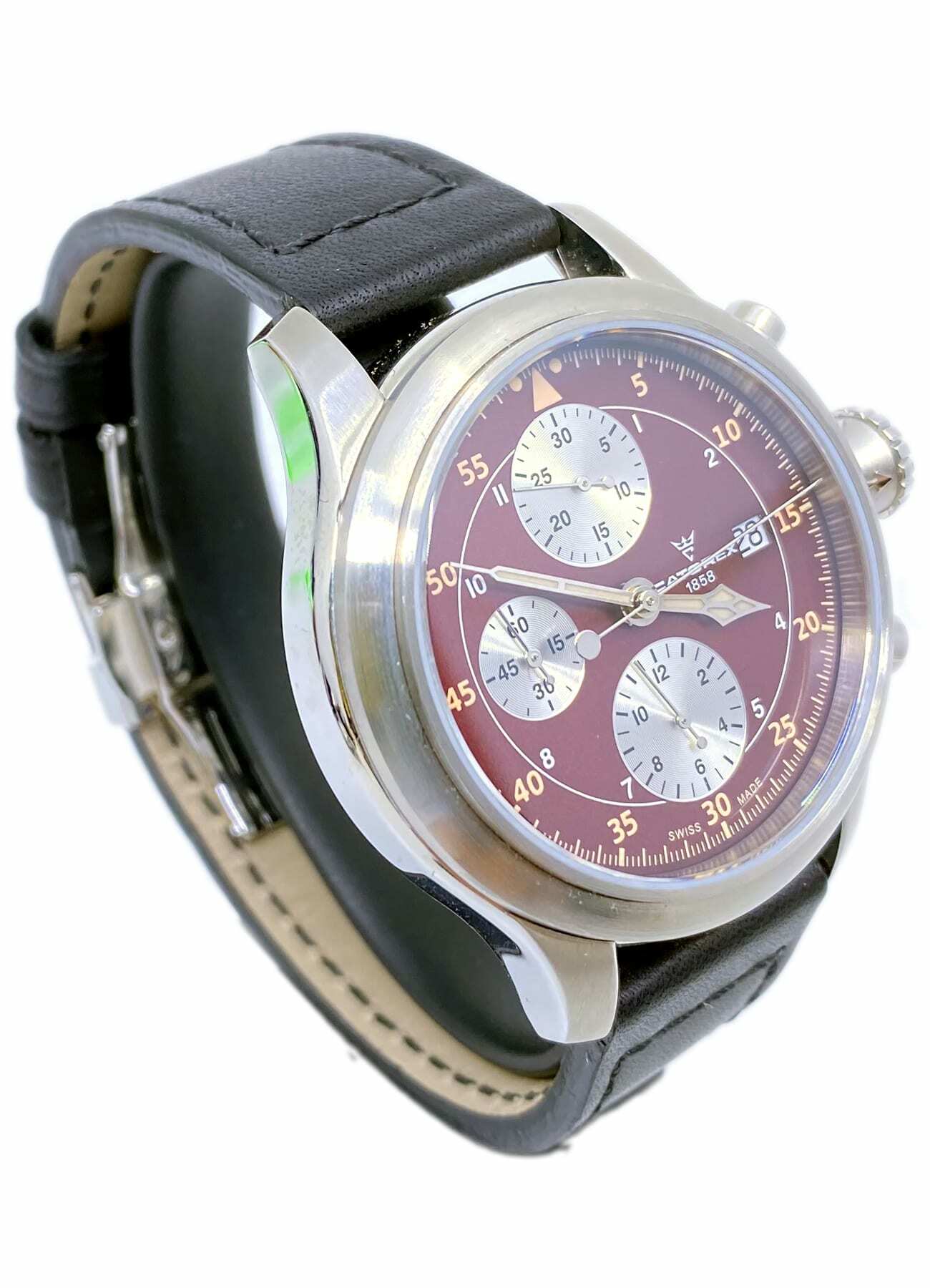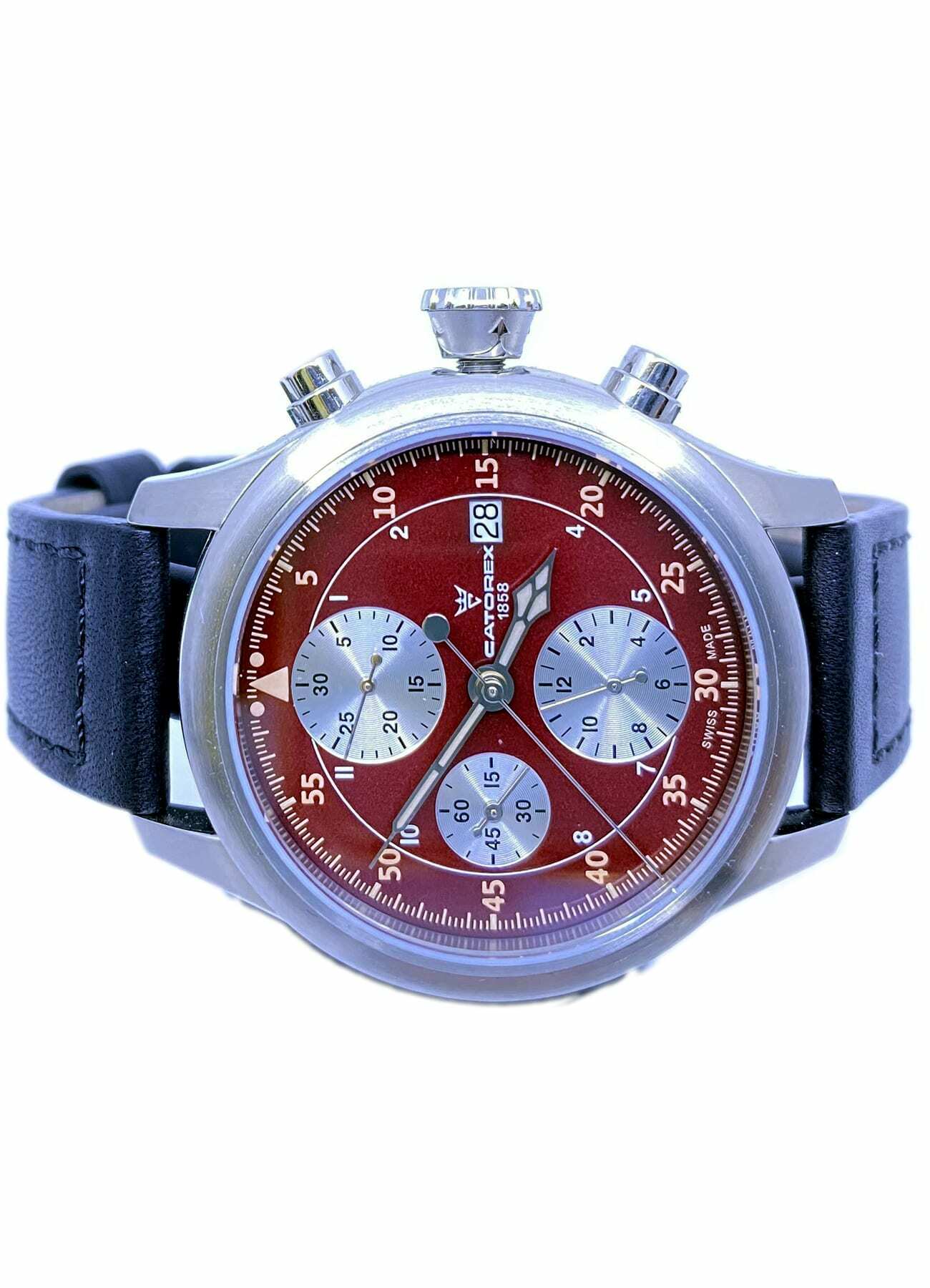 - This timepiece features a 42mm steel case paired with a high quality leather strap. It showcases a distinctive burgundy dial and is powered by a precise automatic winding movement. The watch is designed with a water resistance of up to 100m.