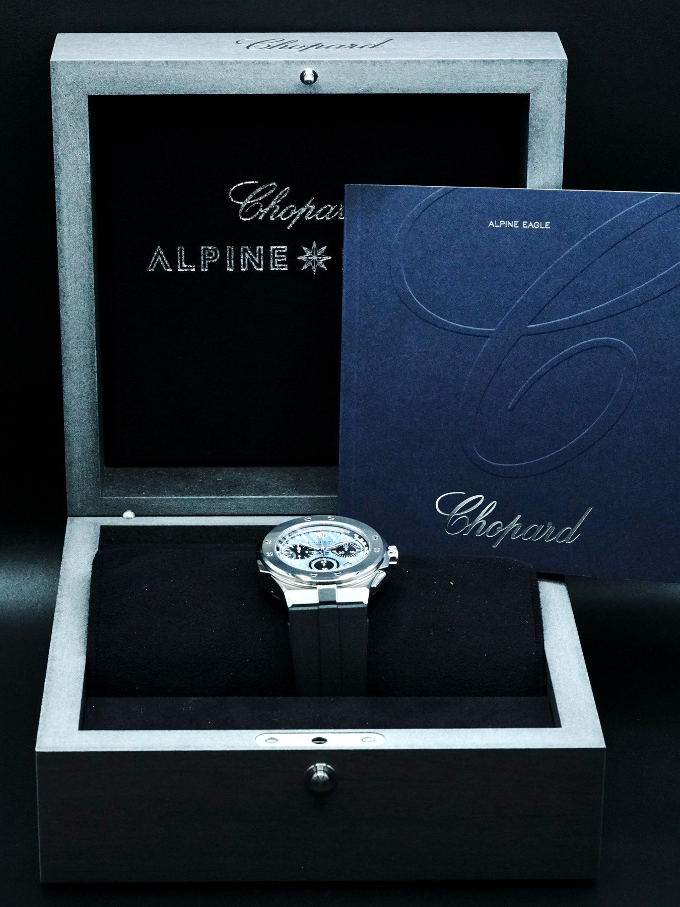 This Chopard Alpine Eagle XL Chrono 298609-3008 is in EXCELLENT condition. This watch includes its original box and instruction manual only. No warranty card. This watch has been fully authenticated and certified by Exquisite Timepieces.