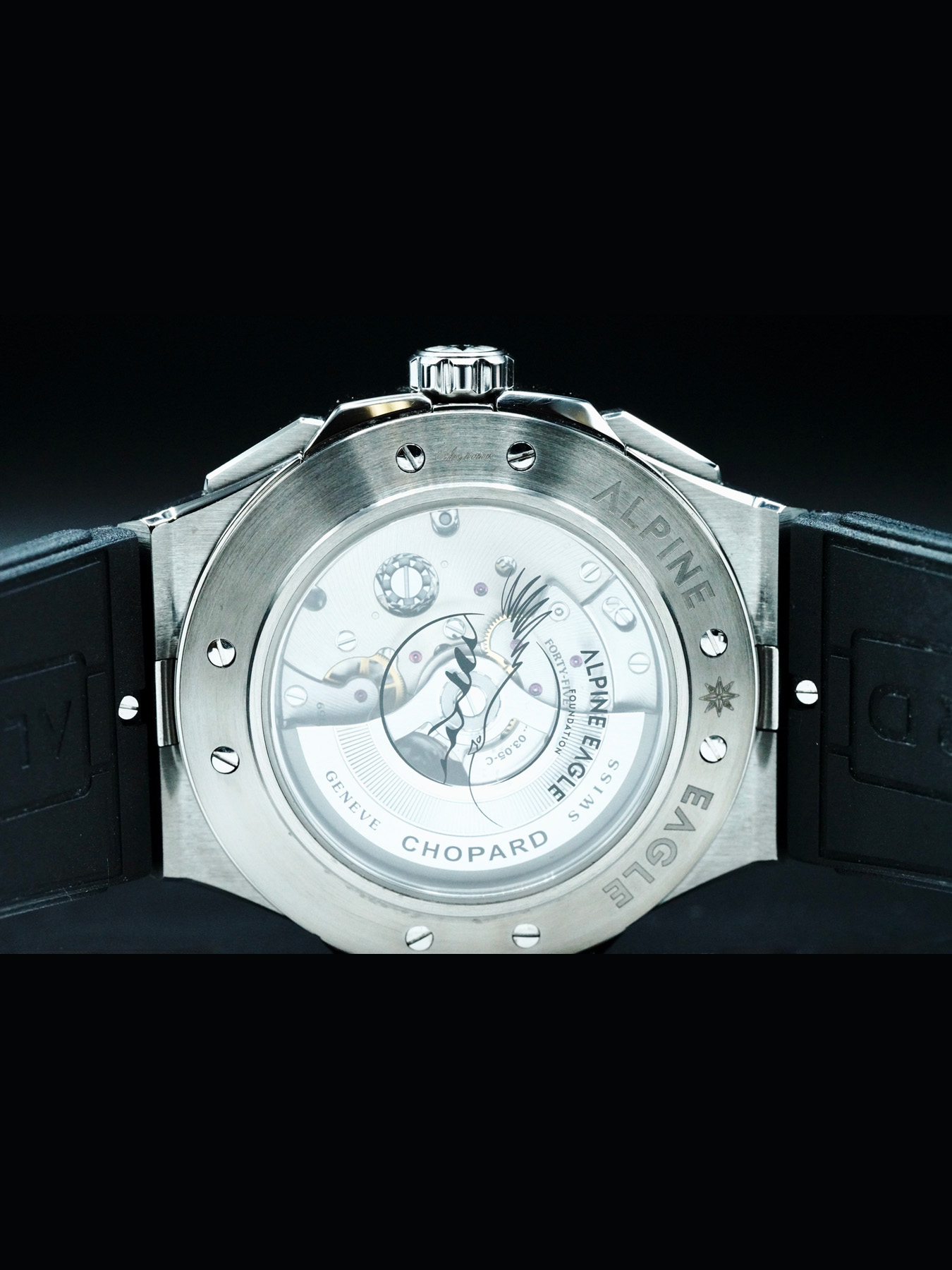 Automatic movement powered by Chopard Caliber 03.05-C with a power reserve of approximately 60 hours. Water resistance up to 100 meters.