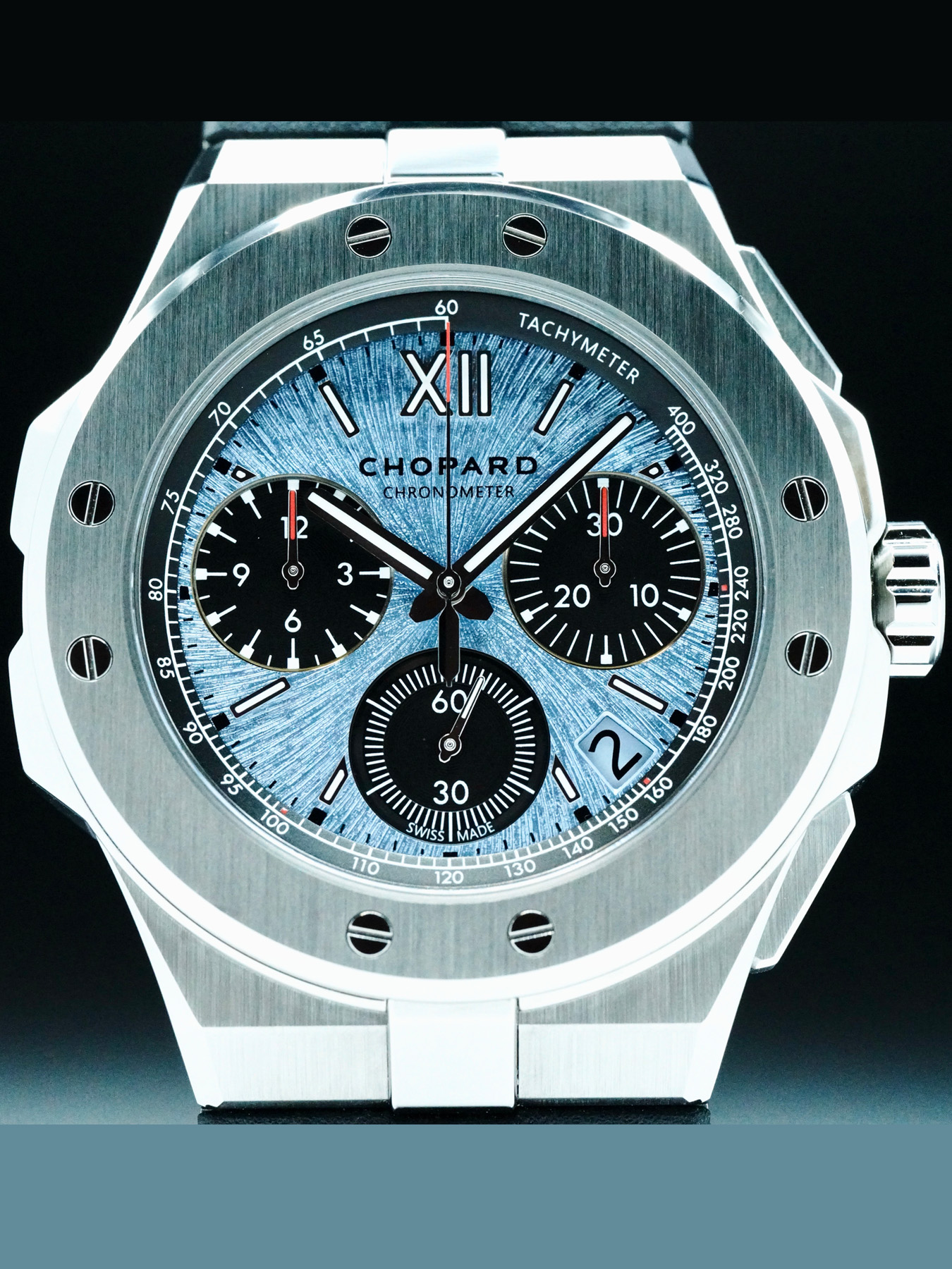 This Chopard Alpine Eagle XL Chrono features a 44mm titanium case with an exhibition case back on a black rubber strap. This watch also sports a blue dial with luminous hands and index dial markers covered by scratch resistant sapphire crystal.