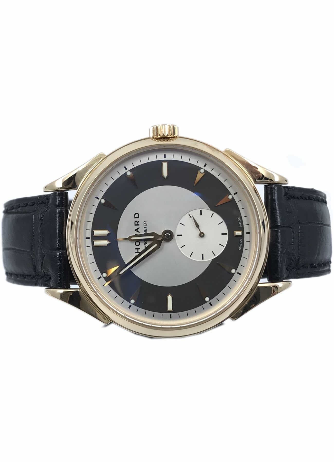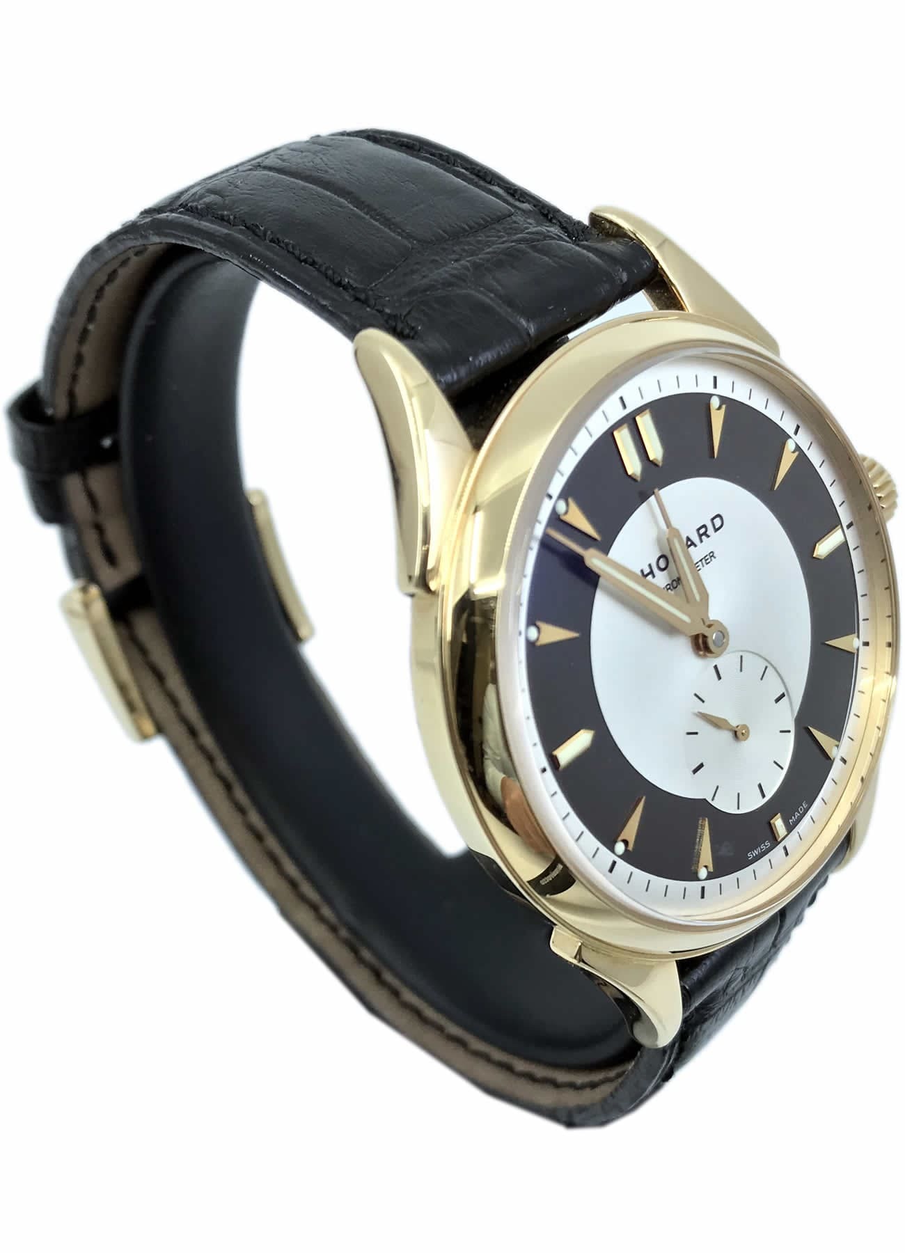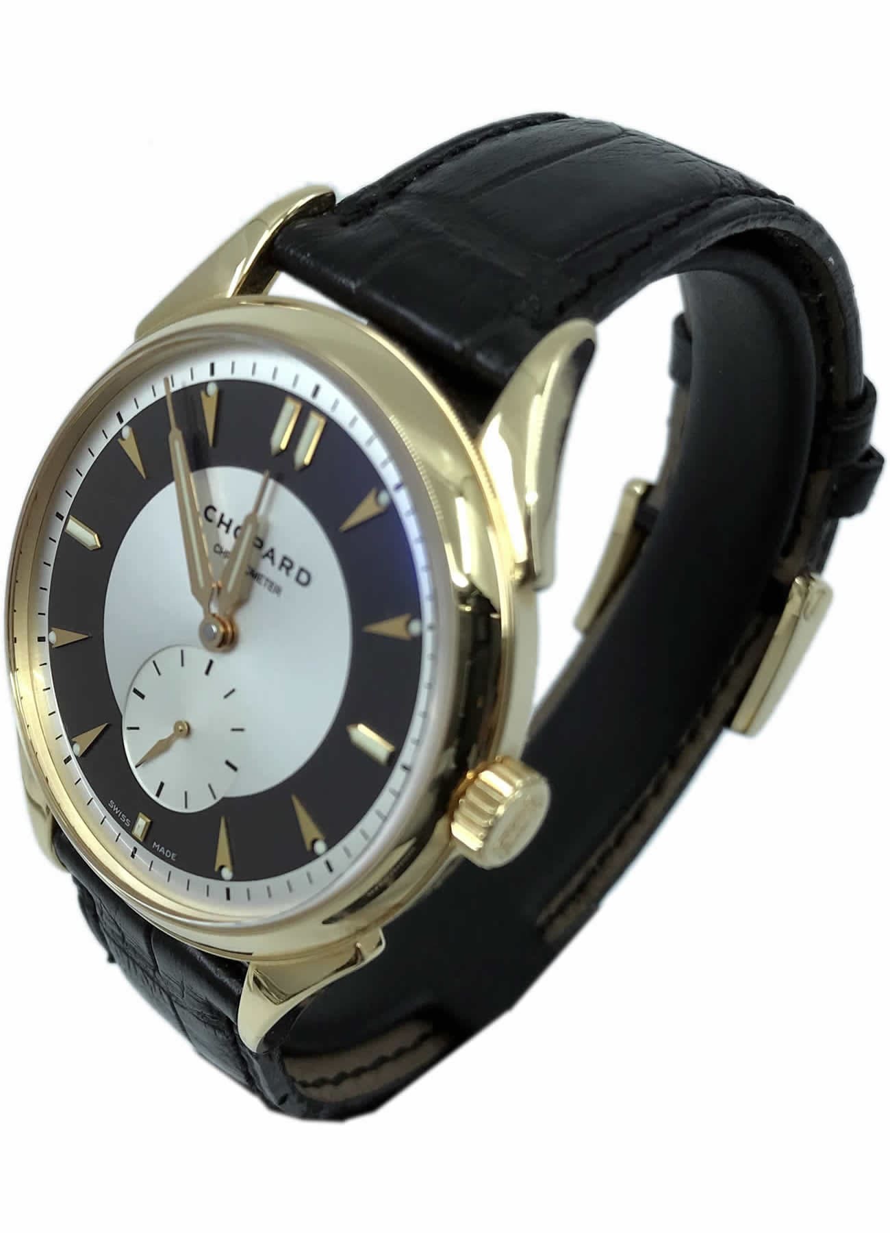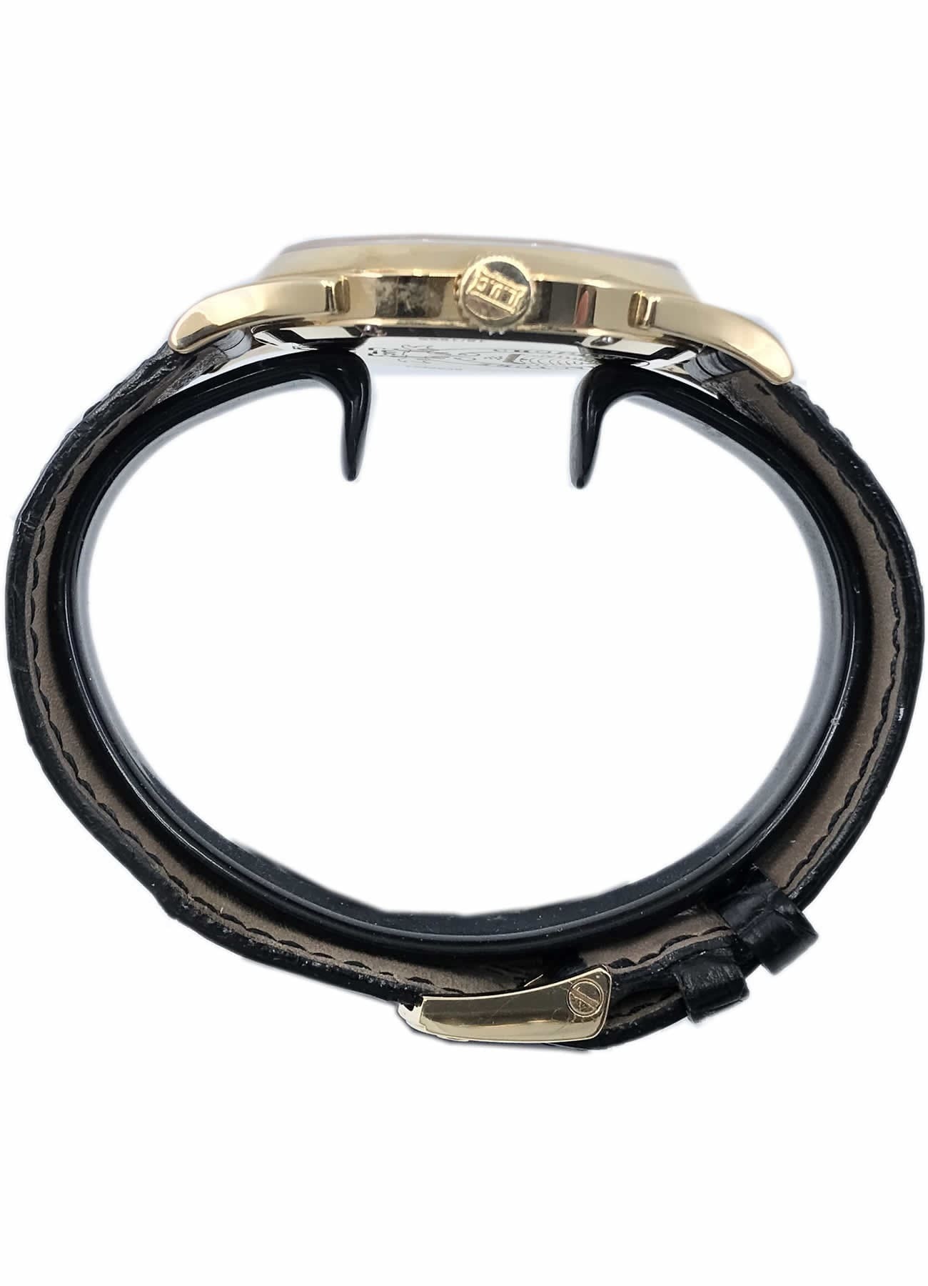 - This timepiece features a 39mm gold case paired with a high quality leather strap. It showcases a distinctive black and silver dial and is powered by a precise automatic winding movement.