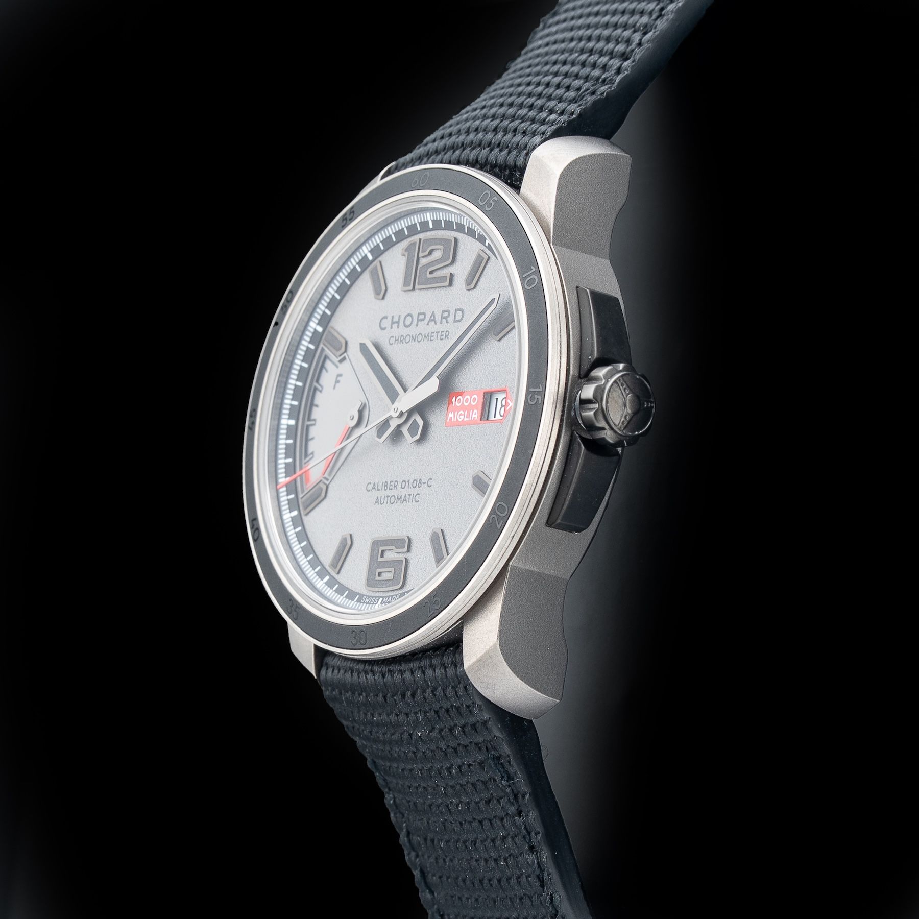 This watch features a 43mm PVD Coated Titanium case on fabric strap. This watch also sports a grey dial. Powered by an automatic movement. Water resistance up to 100 meters.