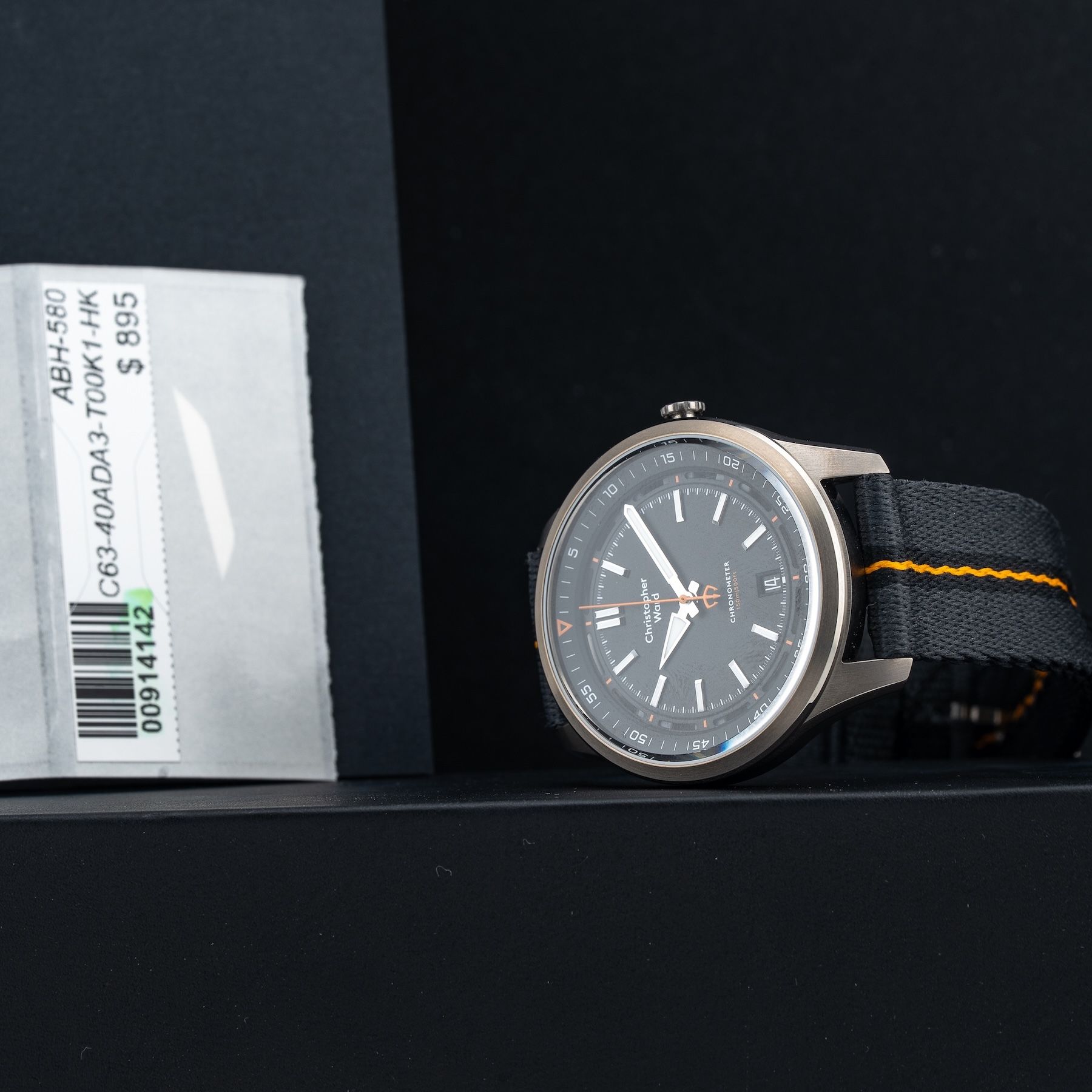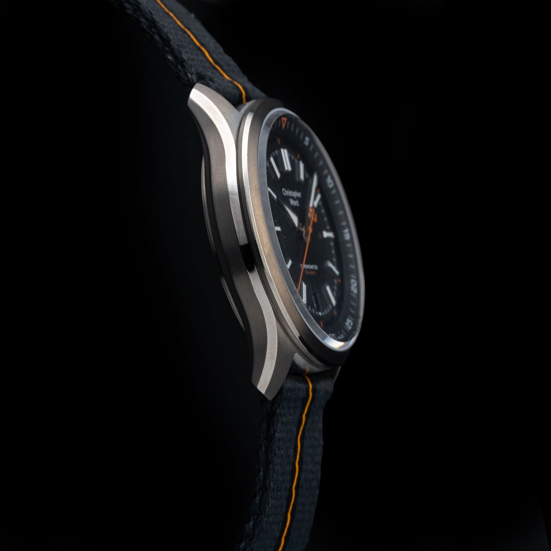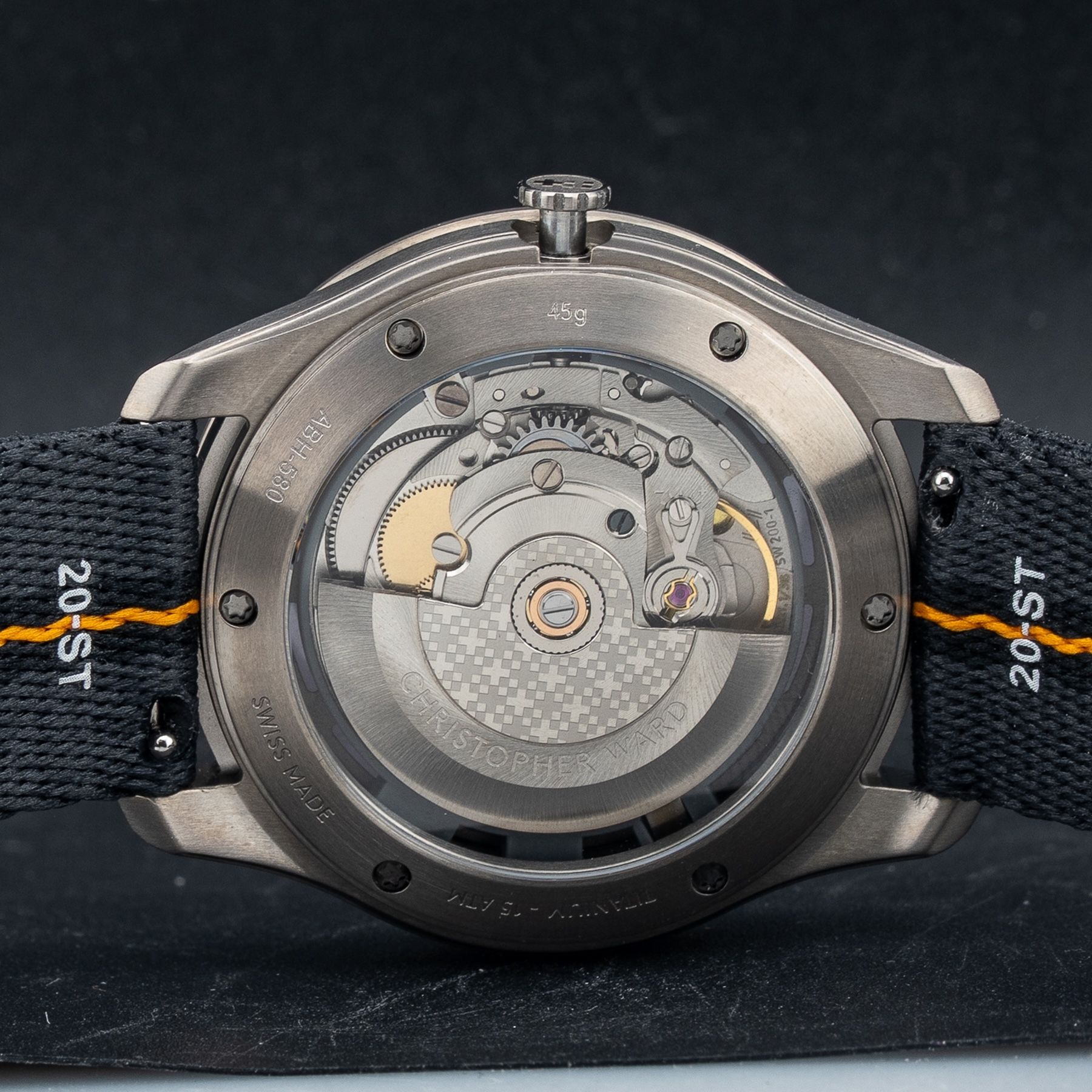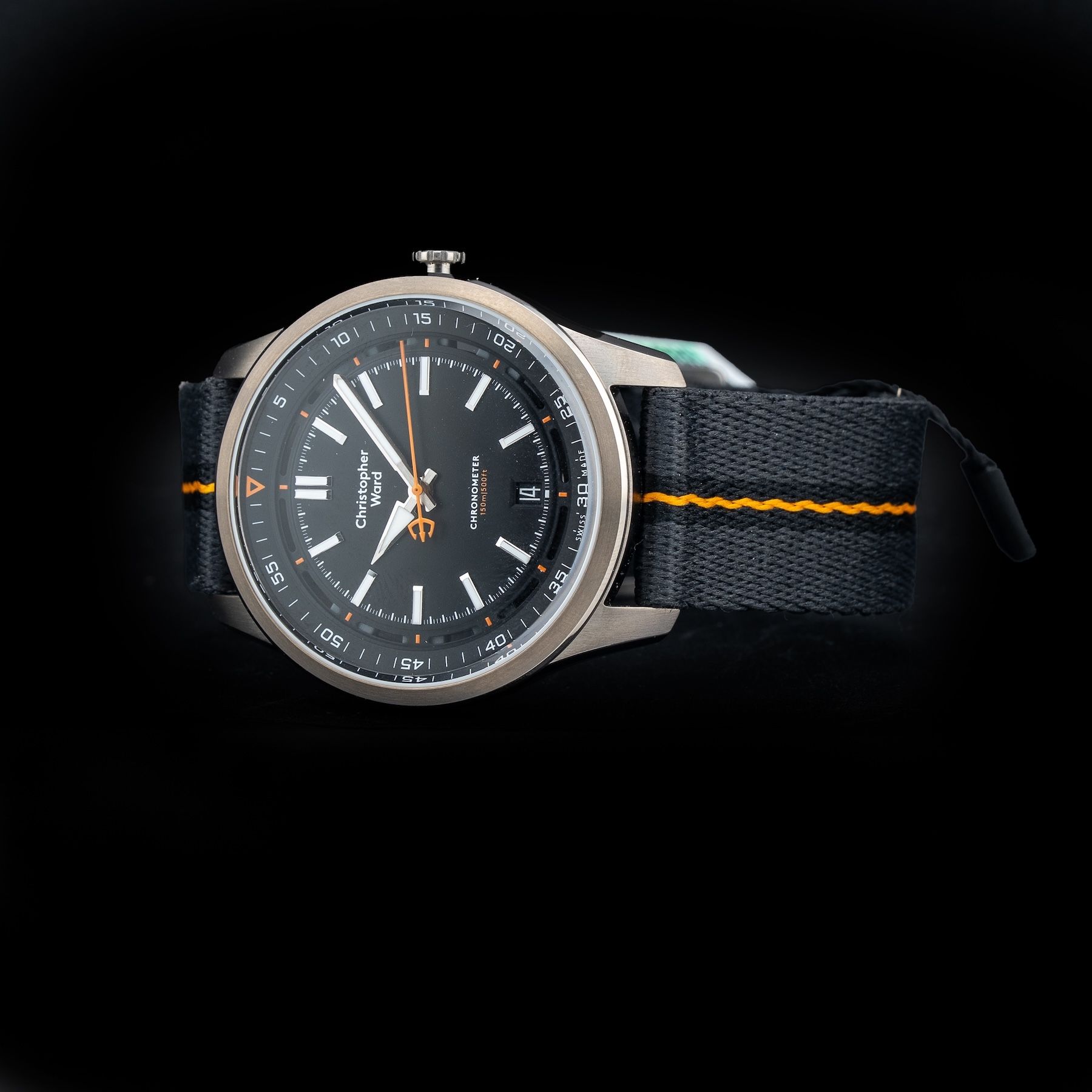 This watch features a 40mm titanium case on NATO strap. This watch also sports a black dial. Powered by a self-winding movement. Water resistance up to 150 meters.