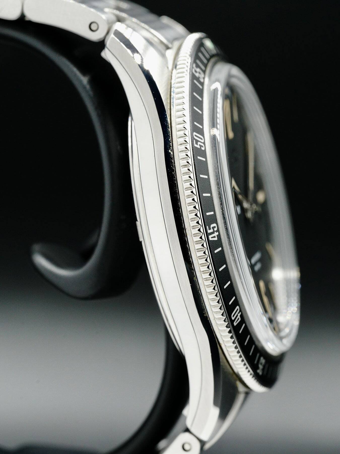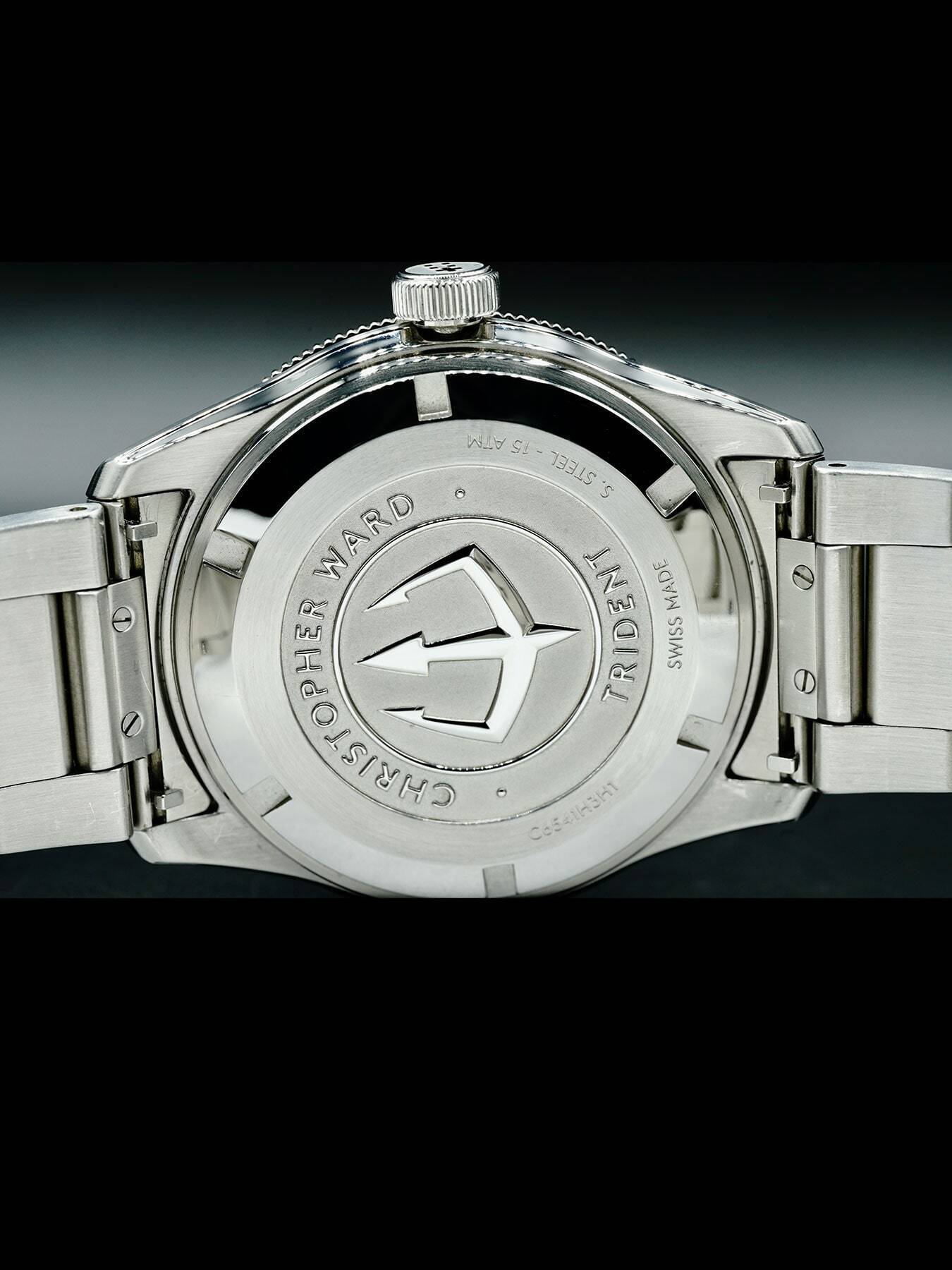 This Christoopher Ward C65 Trident Diver features a 41mm 316L stainless steel case with a solid case back on a stainless steel bracelet. This watch also sports a black dial with luminous hands and index dial markers covered by scratch resistant sapphire crystal.