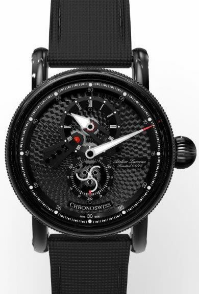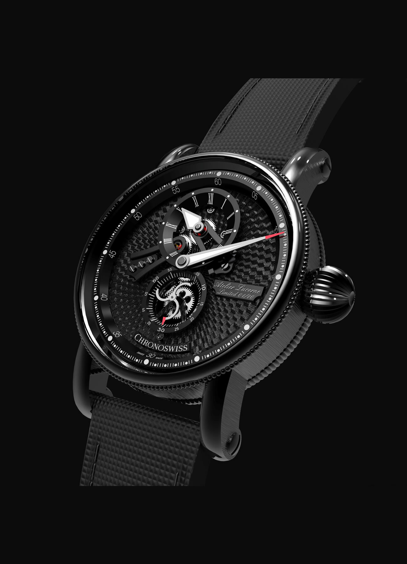 Solid 16-piece, stainless steel case with black DLC coating, with satin finish and polished; bezel with partial knurling and curved, nonreflecting sapphire crystal, screw-down case back with satin finish and sapphire crystal; onion crown, water resistance up to 10 bar, strap holders screwed down with patented Autobloc system. Elaborate construction on two levels: bottom level hand-guillochéd, galvanic black, upper level featuring screwed-on skeletonized train wheel bridges and funnel-like constructions for hours and seconds display Skeletonized and galvanic black rotor, with Côtes de Genève and colimaçon; with ball bearing; polished pallet lever, escape wheel and screws; bridges and plates with colimaçon