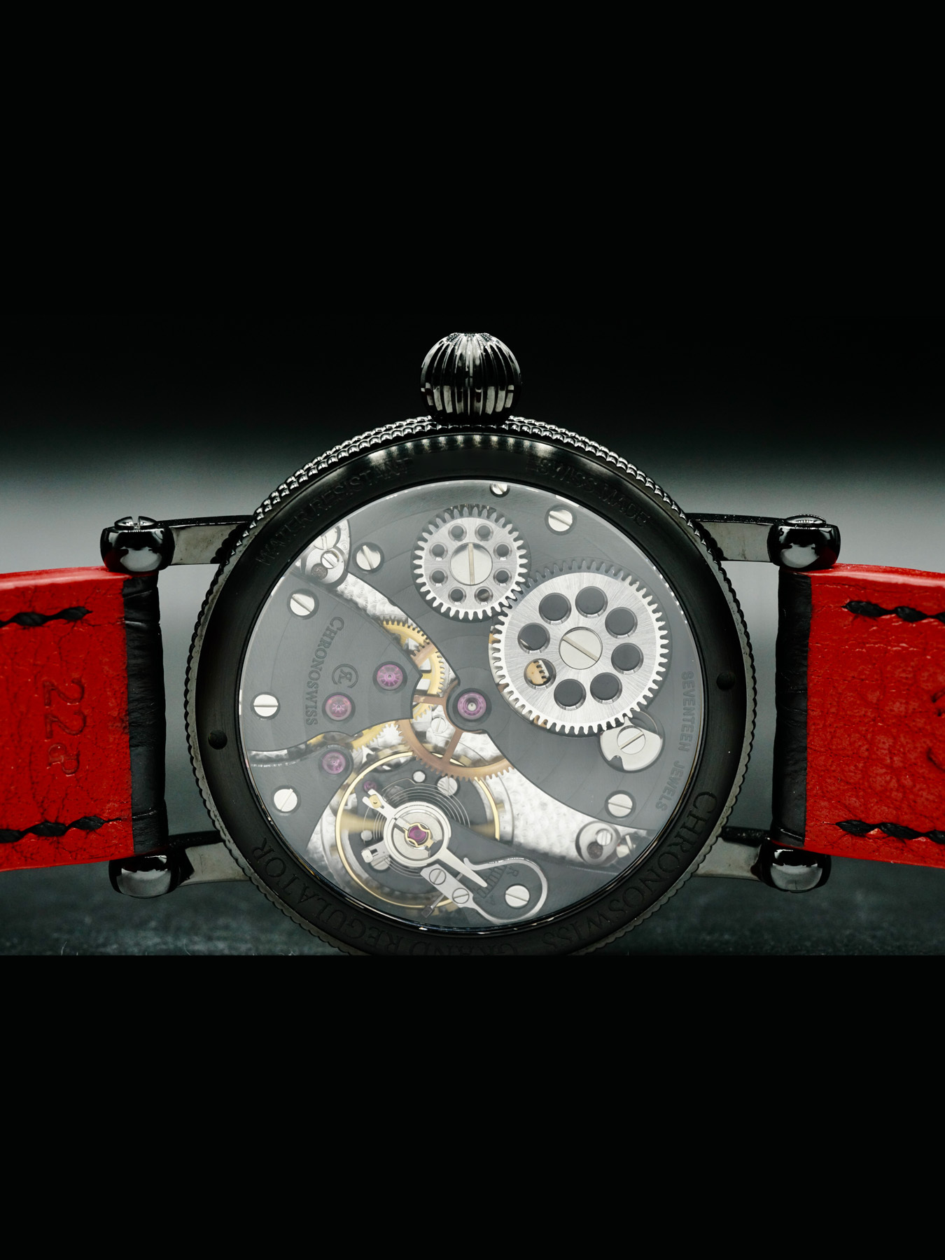 This Chronoswiss Flying Grand Regulator Skeleton Red/Black CH-6725-REBK is in EXCELLENT condition. It has boxes and papers. Guarantee dated for July 2022.