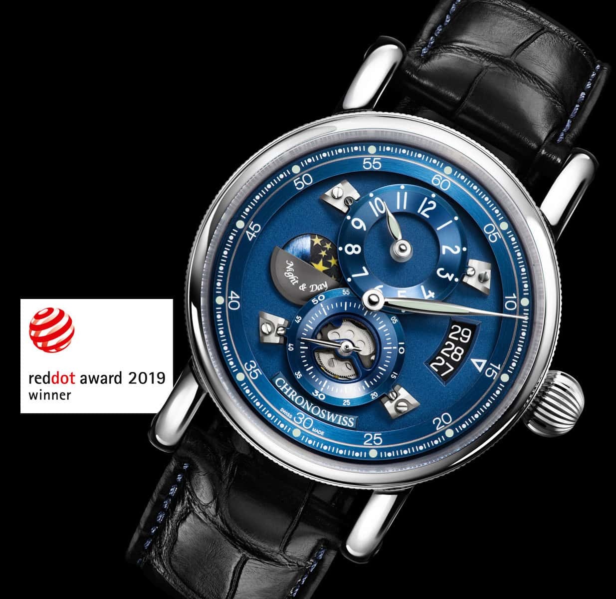 The domed day/night display definitely is an eye-catcher. The stars on the night side even glow in the dark thanks to their Super-LumiNova coating; a feature that is not just for romantics! The intricate design of this model was awarded with a red dot design award for its sophisticated dial design.