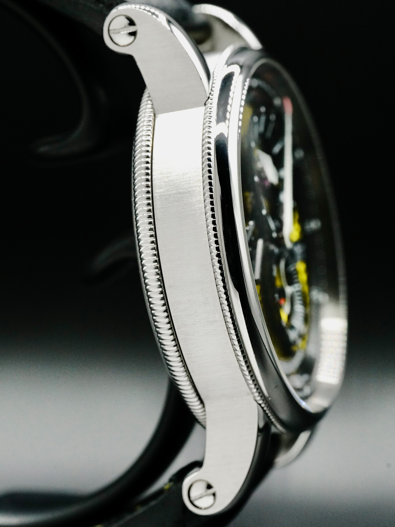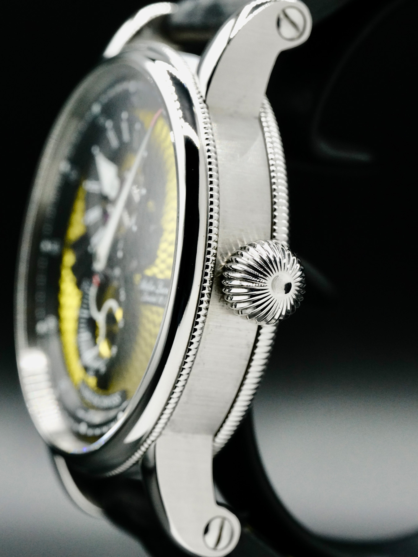 This watch features a 41mm steel case on leather strap. This watch also sports a yellow dial.