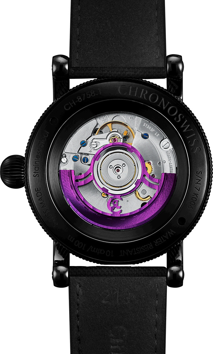 The timepiece embodies the ongoing evolution of the brand and yet stays true to the typical Chronoswiss DNA. The multilevel Regulator construction of 42 parts allows uncovered views of the mechanics and is the Lucerne watchmakers new contemporary standard. The main protagonist on the inside is the automatic, stop-second calibre C.299 with its skeletonised rotor that is equally CVD coated in purple.