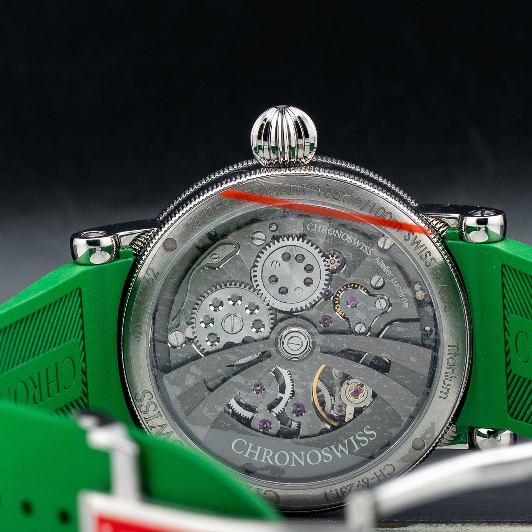 Chronoswiss increasingly favors titanium for its lightness. It has the best strength-to-weight ratio among metals, making it highly sought after in aerospace. Additionally, titanium is corrosion-resistant and skin-friendly. For its creations, Chronoswiss exclusively selects the toughest available titanium alloy, Grade 5.