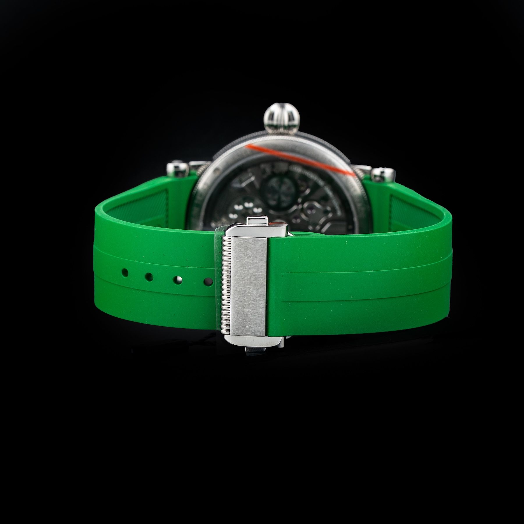 The inspiration for the new ReSec Green Monster Manufacture was sparked by the daring race cars of the 1960s at Bonneville. A quartet card featuring the "Green Monster" with 17,000 horsepower ignited the bold creation from our designer, now encapsulated in a 42mm case crafted from premium titanium. The dial of the ReSec Manufacture has been redesigned for enhanced symmetry and transparency, showcasing the beauty of our latest in-house movement and the meticulously hand-guillochéd dial. The ReSec Manufacture is a next-generation timepiece that stands as a testament to innovation and craftsmanship.