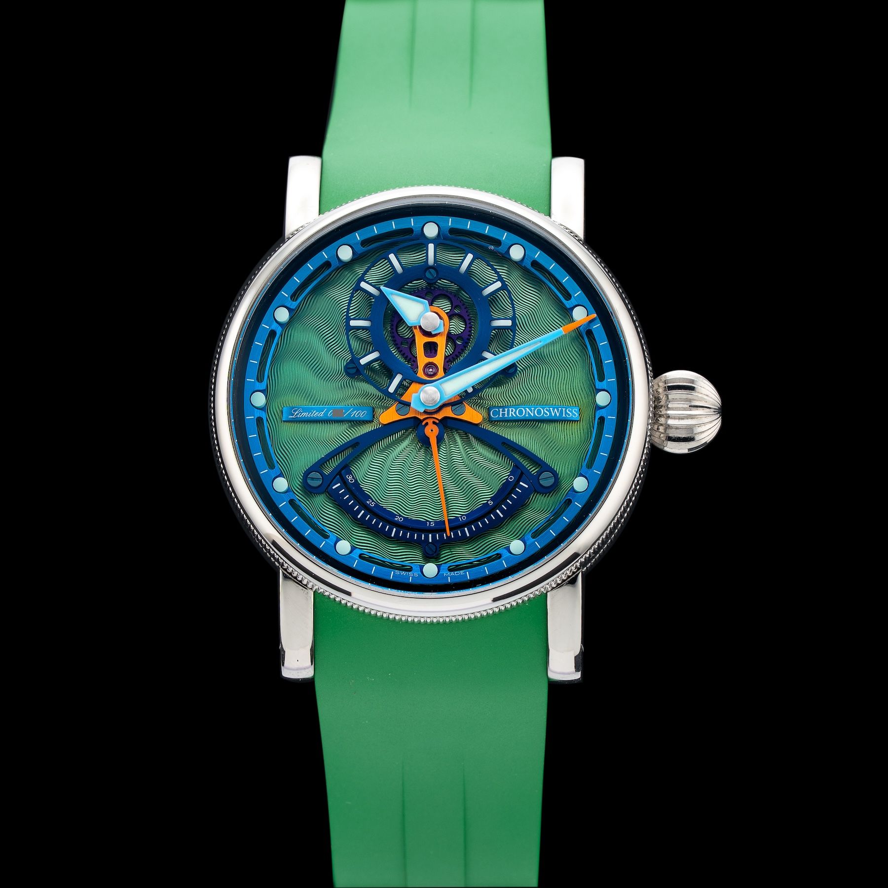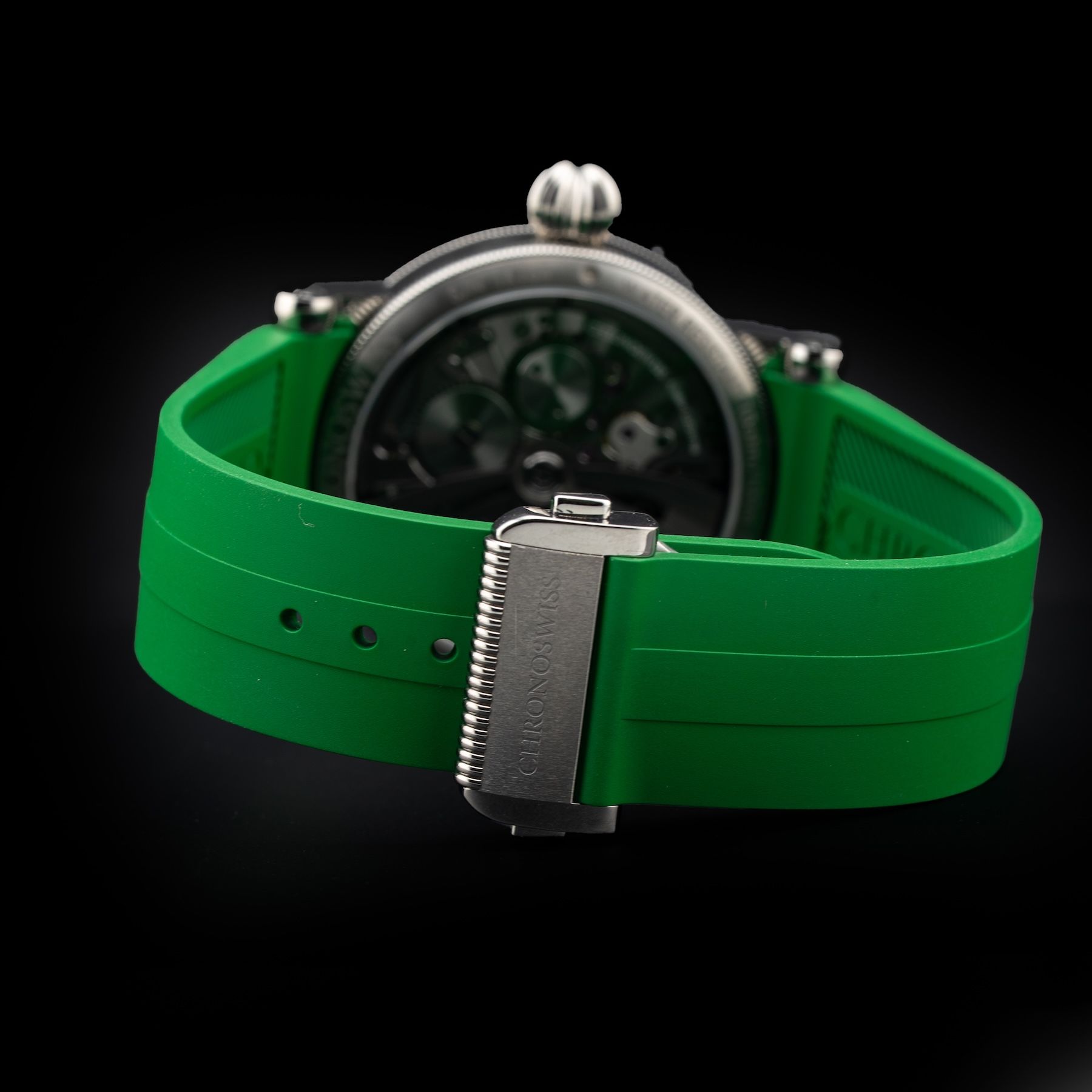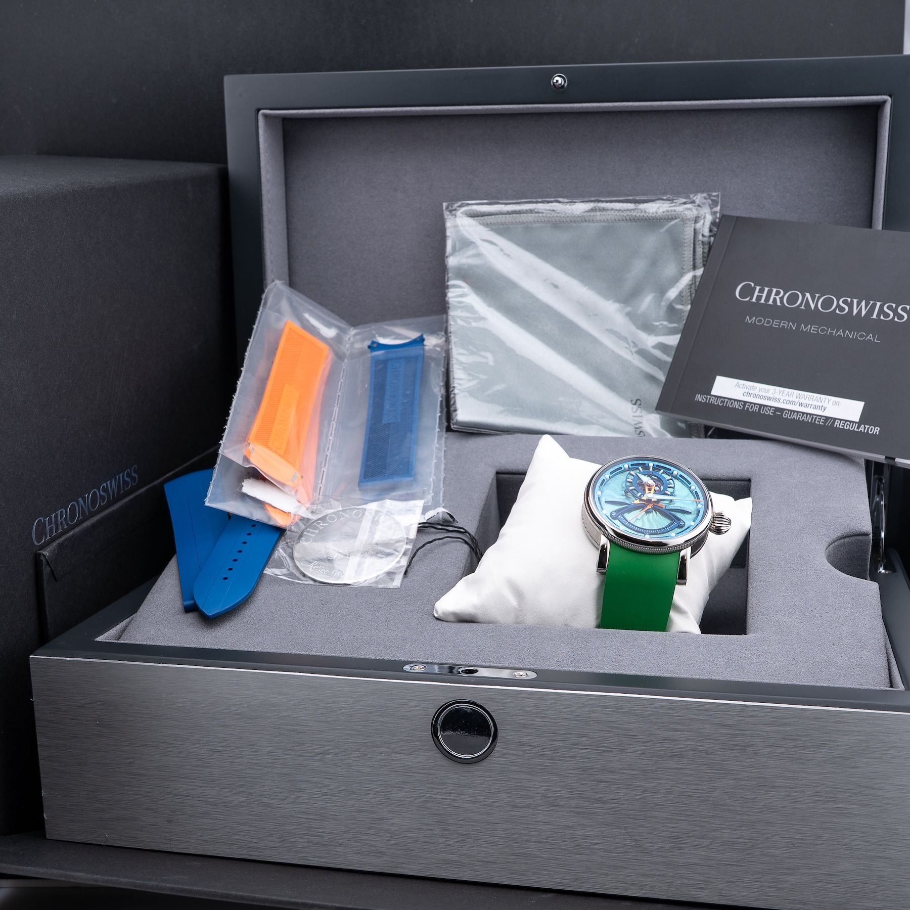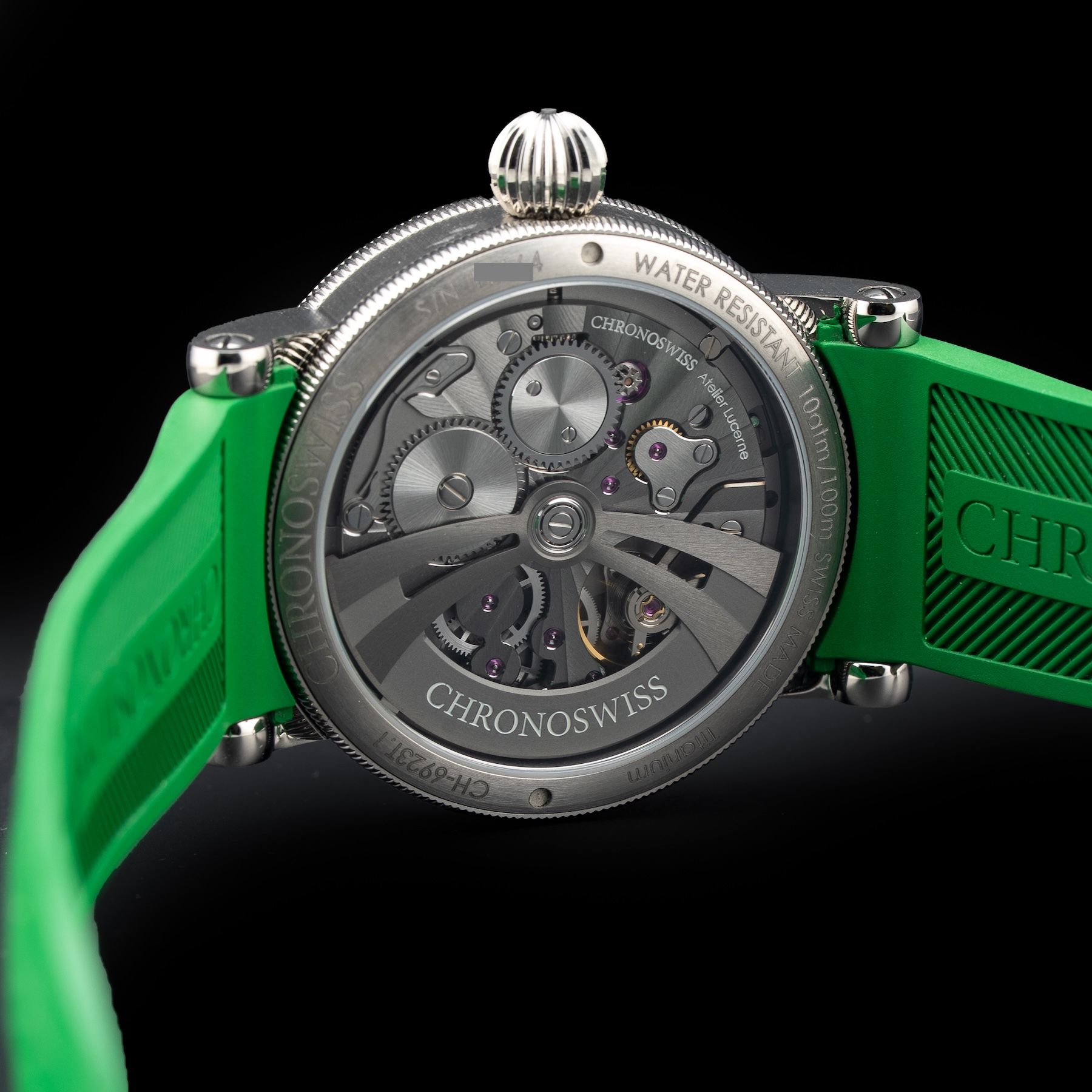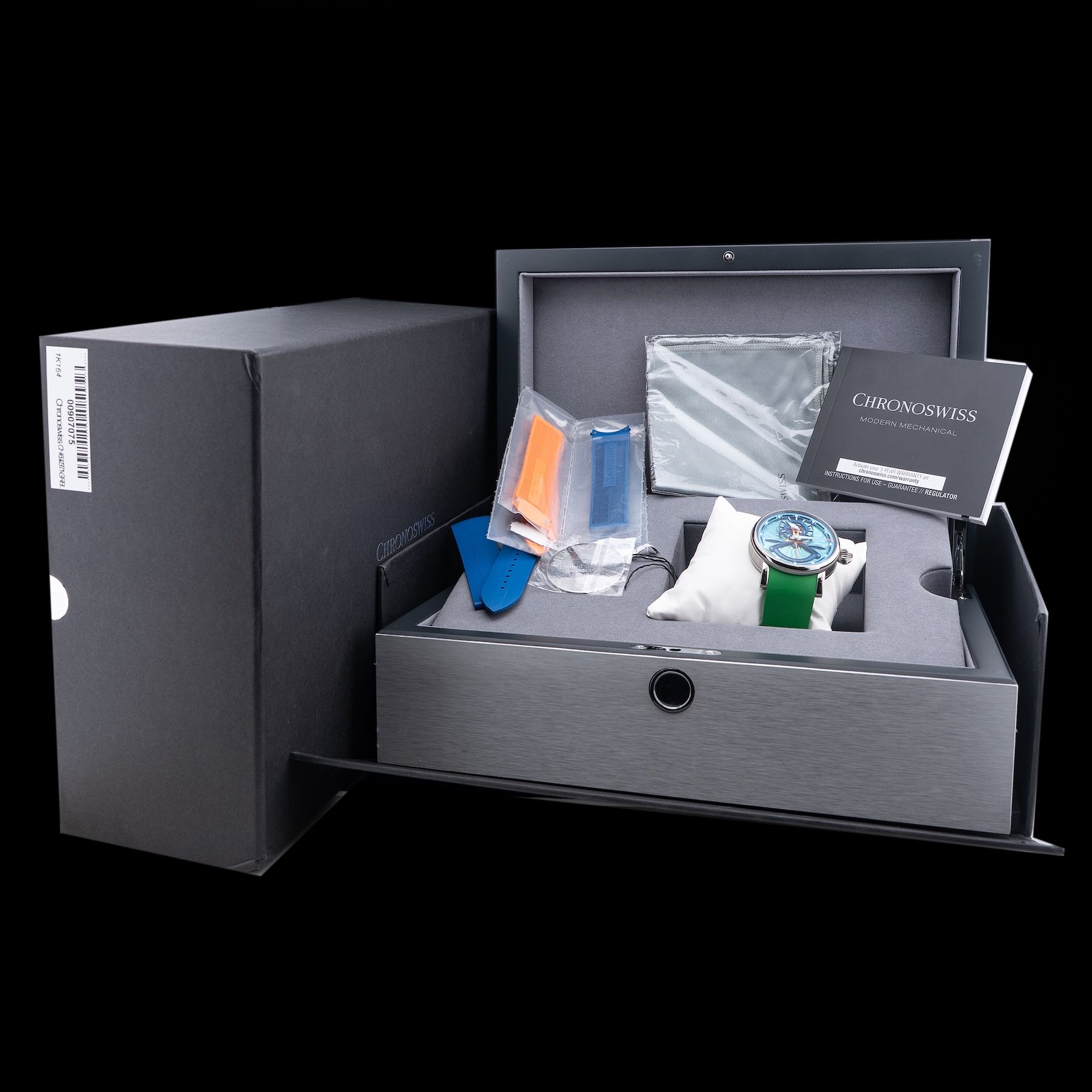 This Chronoswiss Resec Green Monster Manufacture CH-6923T.1-GRBL Limited Edition is in GREAT condition, it has boxes, papers and warranty card dated 01/30/2025. This watch has been fully authenticated and certified by Exquisite Timepieces.