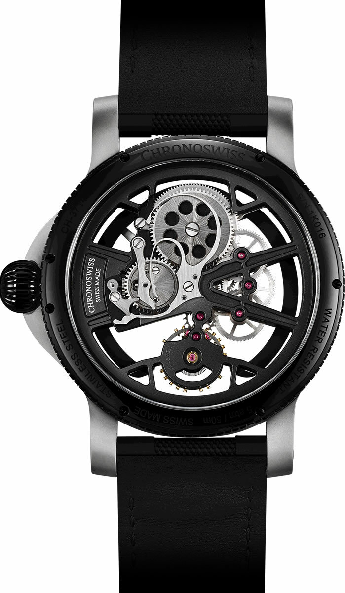 The highly technical, contemporary timepiece is living proof that Chronoswiss is capable of taking the art of skeletonising to a new era. For this radical design, maximum reduction of the entire movement has already been realized on the drawing board. The radically progressive design of the SkelTec also applies to the case. Organic free-flowing forms reflecting the fluidity of time itself are clearly seen in the sculptural curves as well as in the skeletonised lugs.