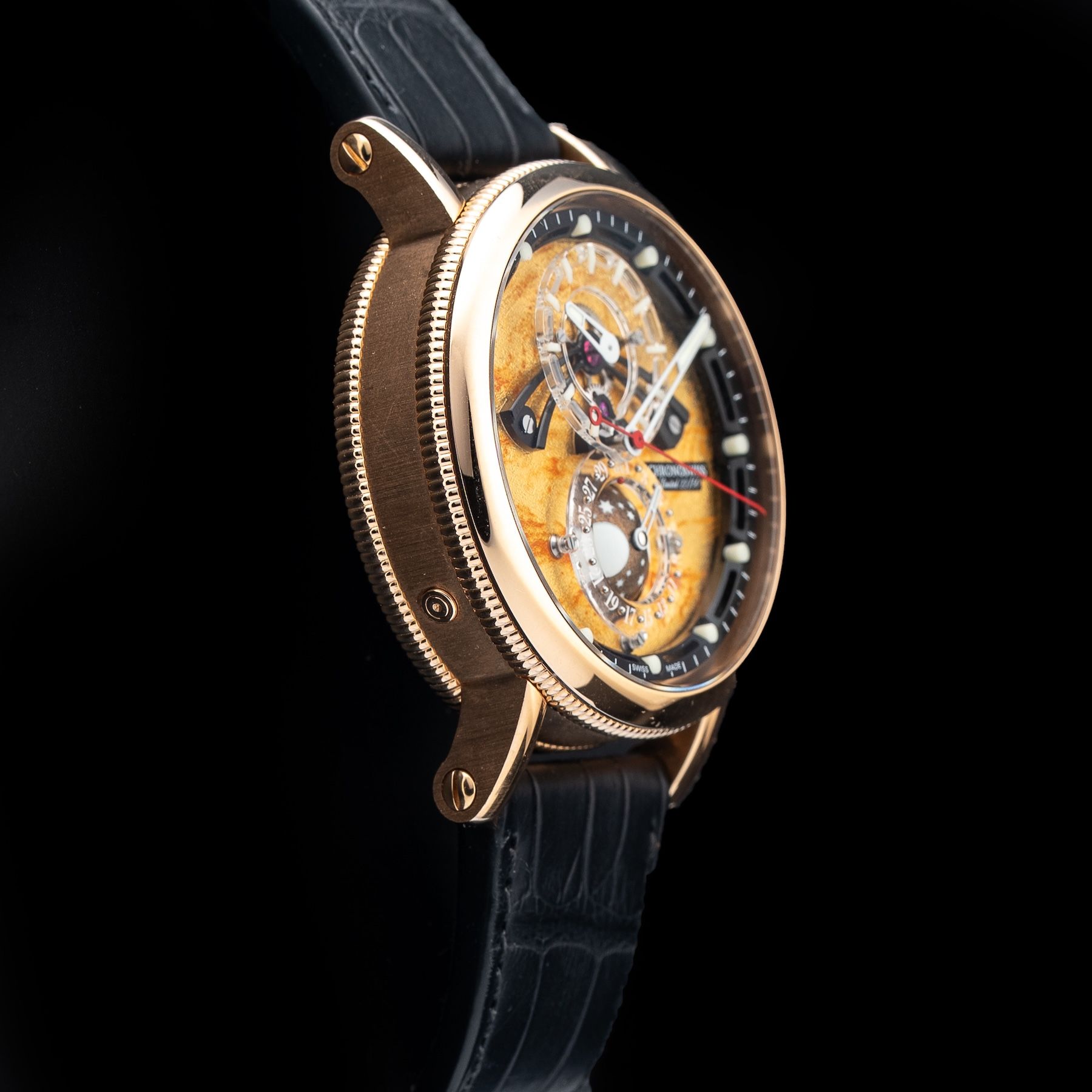 Once again Chronoswiss has redefined the rules of watchmaking. The 3D nano-printed dial with 17 different layers reflects the surface of the gas planet Jupiter while a titan moon indicates the moon phase. The stunning regulator setup is illuminated by Super-LumiNova and high-end materials such as ITR-2 are used to build one of the most progressive timepieces in space.