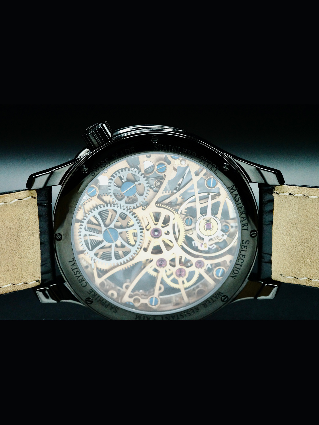 This watch features a 42mm steel case on leather strap. This watch also sports a skeleton dial. Powered by a Mechanical Manual Movement. Water resistance up to 50 meters.